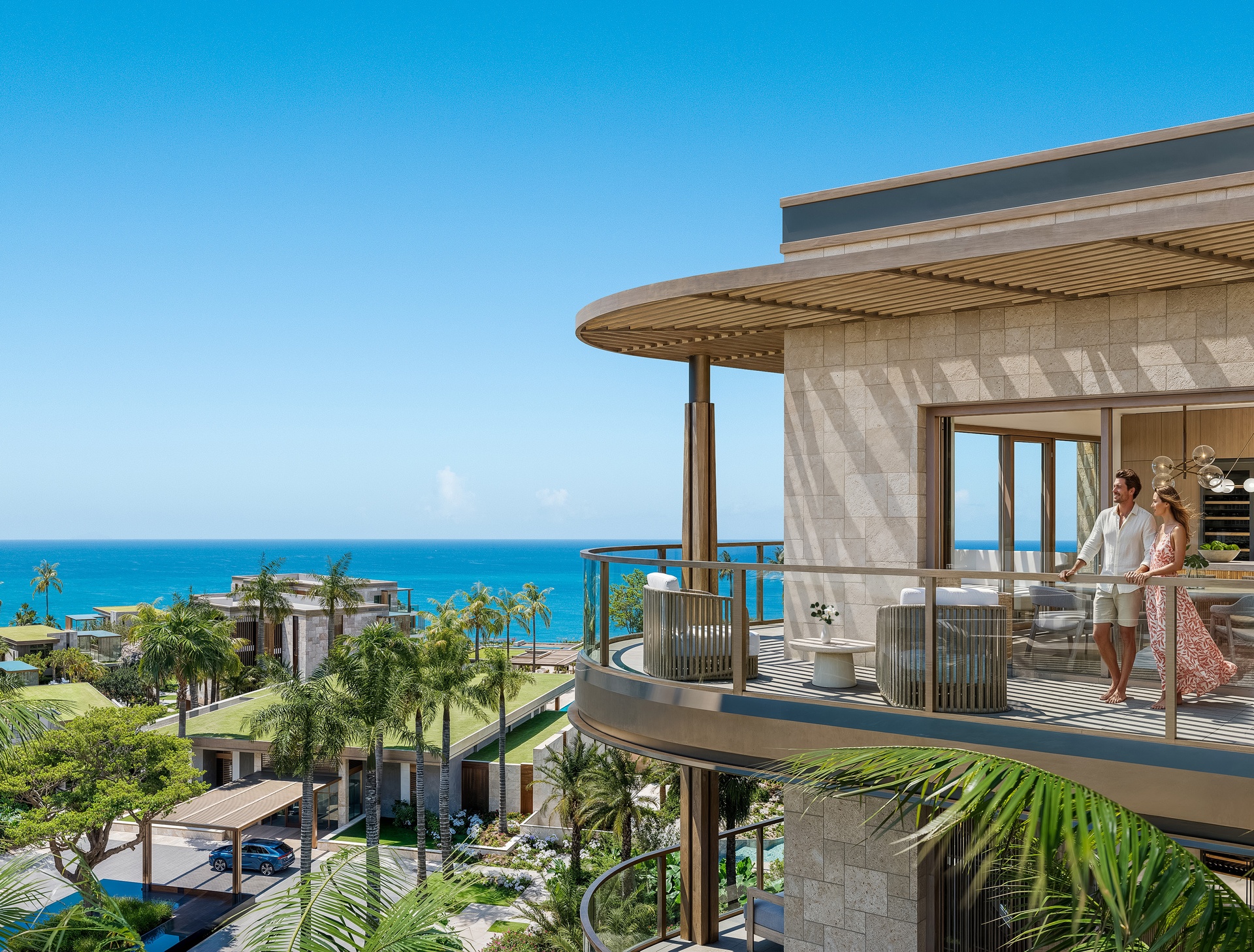 Interiors blend contemporary lines with tactile island influences. Natural textures, soft neutral palettes with subtle coral and ocean blue accents and bespoke finishes create an atmosphere of understated sophistication. The kitchens are fully equipped with premium appliances and refined detailing, while the principal suite offers a private retreat with a beautifully appointed bathroom and ample wardrobe space. Terraces are vast, extending from 351sq ft - 700 sq ft.