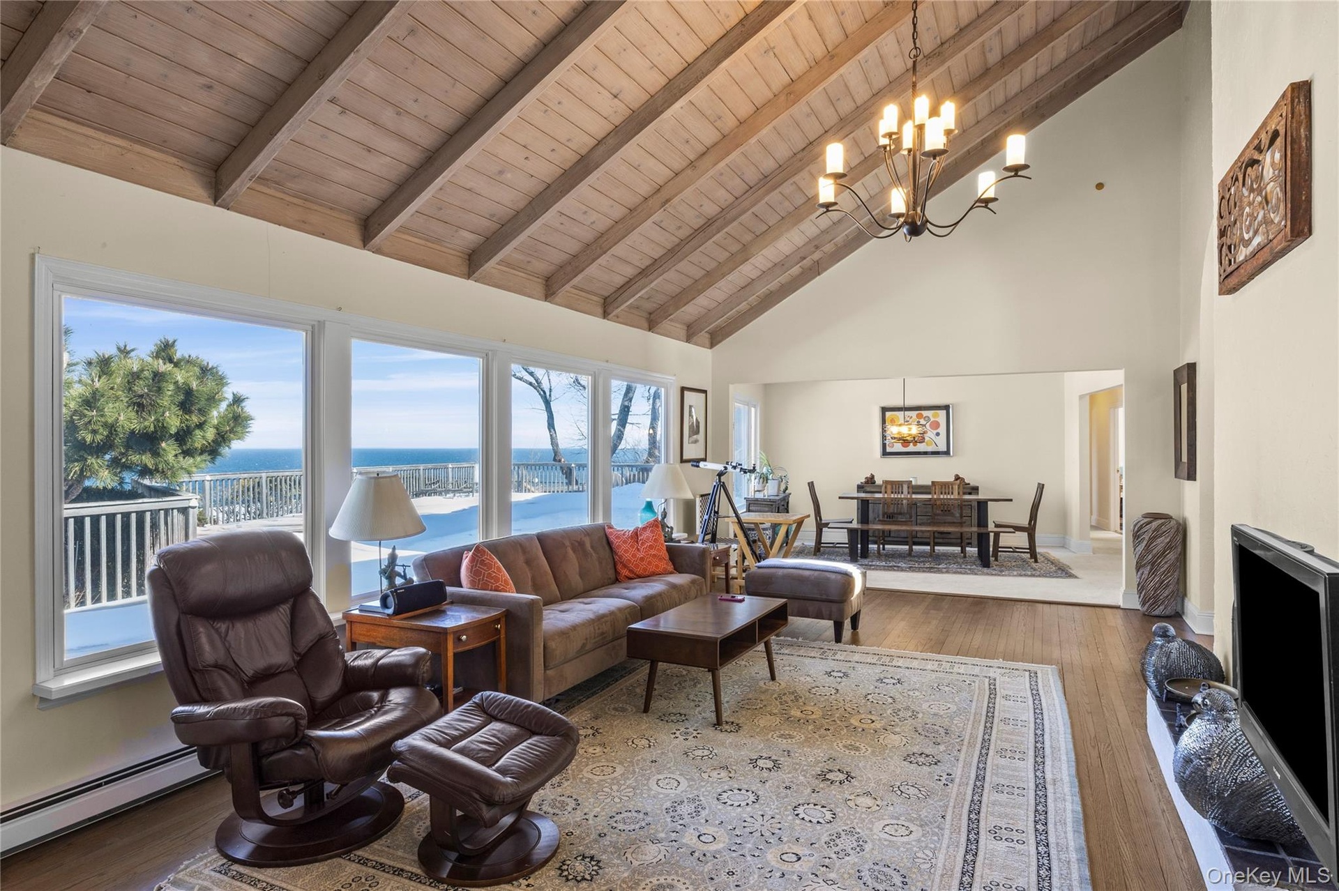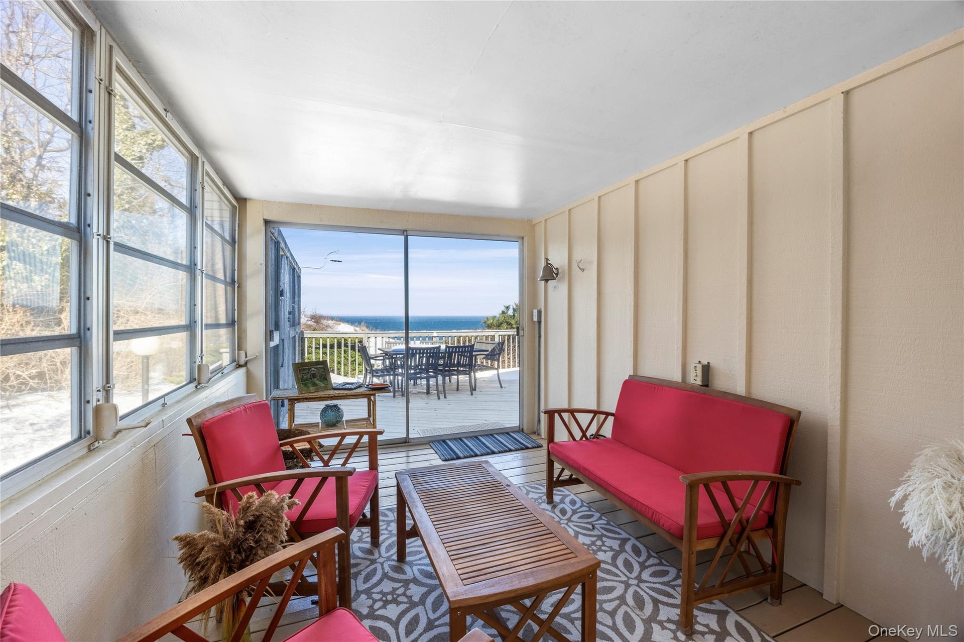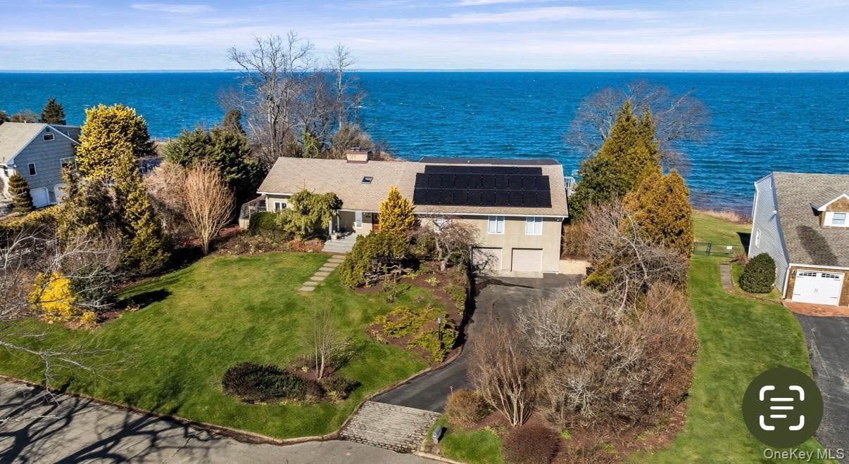 Prime Location for this one of a kind Waterfront Expanded Ranch with coveted bulkhead and densely vegetated bluff face. The most important part of North shore living is the stability of the bluff and this properties wood bulkhead coupled with the heavy growth of the entire face of the bluff is the envy of all. Owning up to the high water mark this property is 1.13 acres with a private beach which is accessed from a private set of stairs along your property line to the west. The professionally landscaped property also features a large deck surrounding the inground pool with constant changing views of the Long Island Sound and Connecticut. Upon entering the homes entry hall you step thru to the Spacious Living Room with a Soaring Wood Burning Fireplace to the exposed beams of the ceiling and Formal Dining Room both with Large Windows overlooking the water. The Eat in Kitchen features White Cabinets, Granite Countertops, Stainless steel appliances and new wide plank flooring. Off of the Eat in Kitchen is a breakfast nook with a small solarium in addition to another completely separate 3 seasons room (also with water views). On the opposite side of the house are the homes bedrooms. The primary Bedroom suite with views of the water also has a private sitting area, a brand new beautifully done primary Bathroom with modern features and views of the water and 2 walk-in closets. There are 2 additional bedrooms on this floor plus a first floor laundry room and a 2nd redone full bath with direct access to the homes rear deck and pool. On the homes lower level you'll find a den, office/possible 5th bedroom, half bath, storage/utility room and direct access to your 2 car garage. The second floor of this home is made up of a completely separate living quarters which includes a Large living room, 2nd Eat in Kitchen with white cabinets and 2nd full set of appliances, a Bedroom with a walk-in closet and Full Bath. This space is perfect for extended family or weekend guests that will never want to leave! This home features amazing views throughout the entire house.