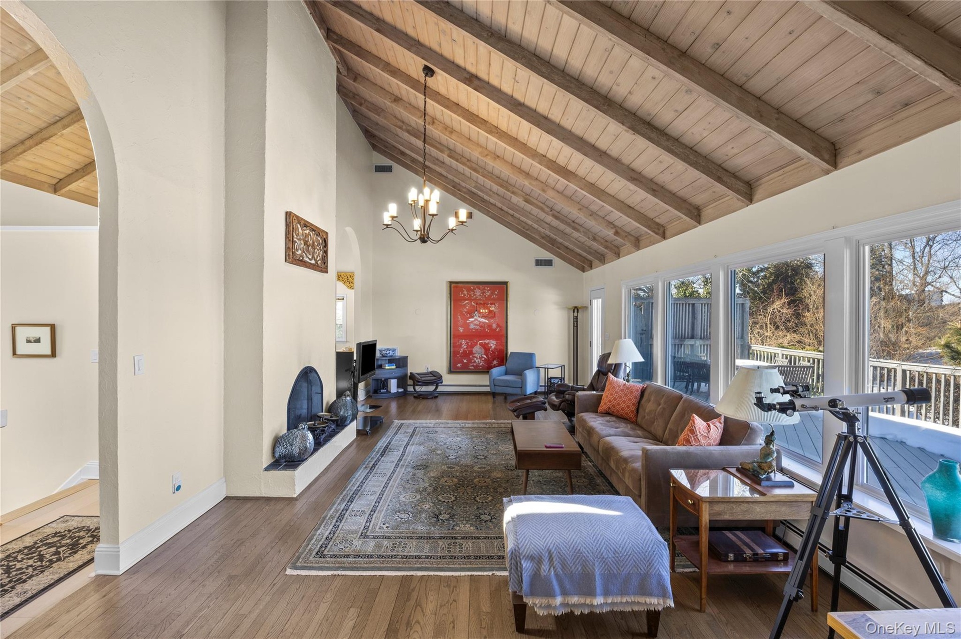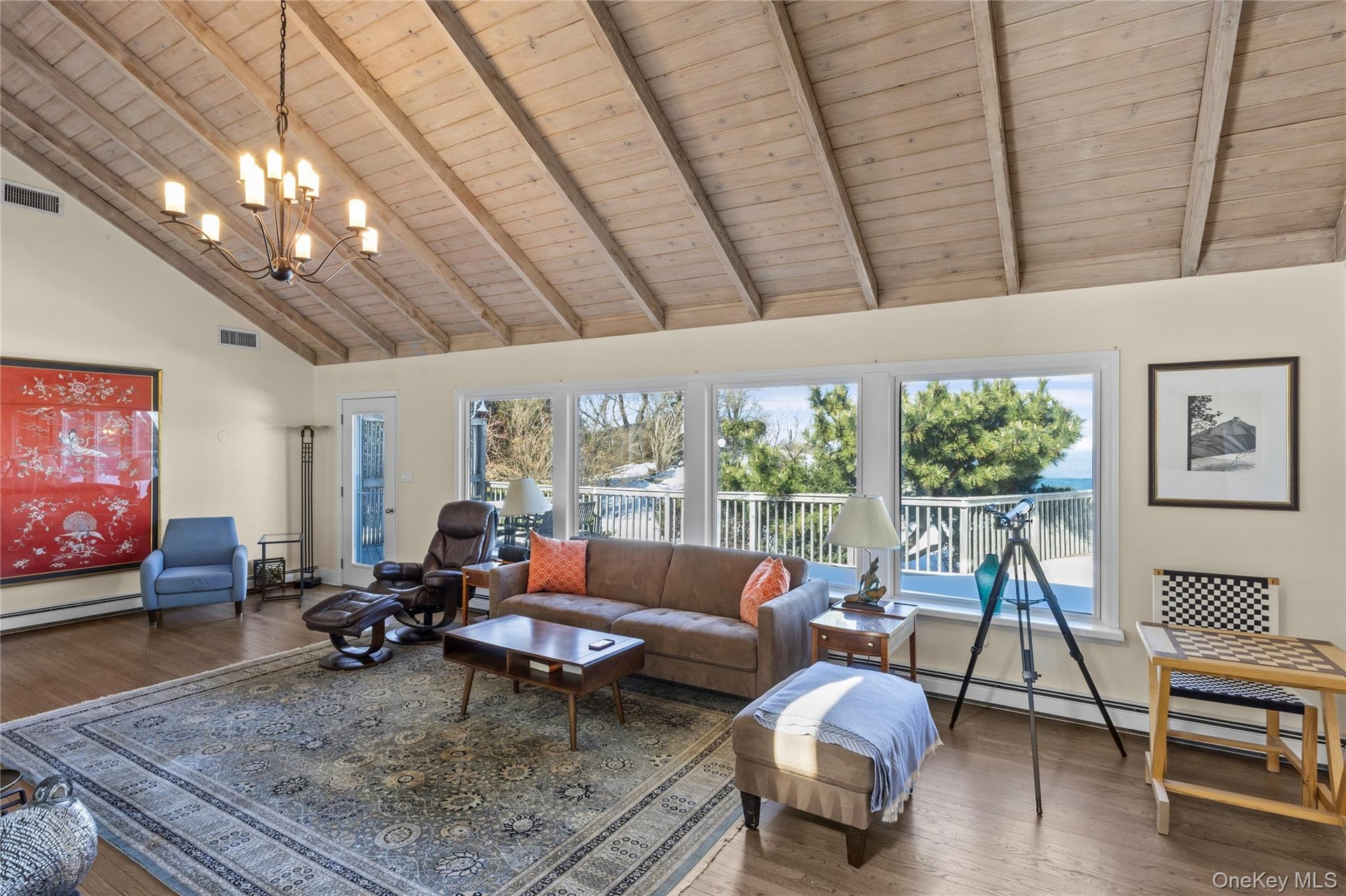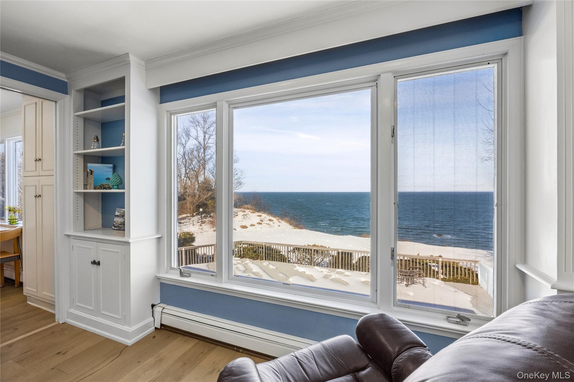 Prime Location for this one of a kind Waterfront Expanded Ranch with coveted bulkhead and densely vegetated bluff face. The most important part of North shore living is the stability of the bluff and this properties wood bulkhead coupled with the heavy growth of the entire face of the bluff is the envy of all. Owning up to the high water mark this property is 1.13 acres with a private beach which is accessed from a private set of stairs along your property line to the west. The professionally landscaped property also features a large deck surrounding the inground pool with constant changing views of the Long Island Sound and Connecticut. Upon entering the homes entry hall you step thru to the Spacious Living Room with a Soaring Wood Burning Fireplace to the exposed beams of the ceiling and Formal Dining Room both with Large Windows overlooking the water. The Eat in Kitchen features White Cabinets, Granite Countertops, Stainless steel appliances and new wide plank flooring. Off of the Eat in Kitchen is a breakfast nook with a small solarium in addition to another completely separate 3 seasons room (also with water views). On the opposite side of the house are the homes bedrooms. The primary Bedroom suite with views of the water also has a private sitting area, a brand new beautifully done primary Bathroom with modern features and views of the water and 2 walk-in closets. There are 2 additional bedrooms on this floor plus a first floor laundry room and a 2nd redone full bath with direct access to the homes rear deck and pool. On the homes lower level you'll find a den, office/possible 5th bedroom, half bath, storage/utility room and direct access to your 2 car garage. The second floor of this home is made up of a completely separate living quarters which includes a Large living room, 2nd Eat in Kitchen with white cabinets and 2nd full set of appliances, a Bedroom with a walk-in closet and Full Bath. This space is perfect for extended family or weekend guests that will never want to leave! This home features amazing views throughout the entire house.