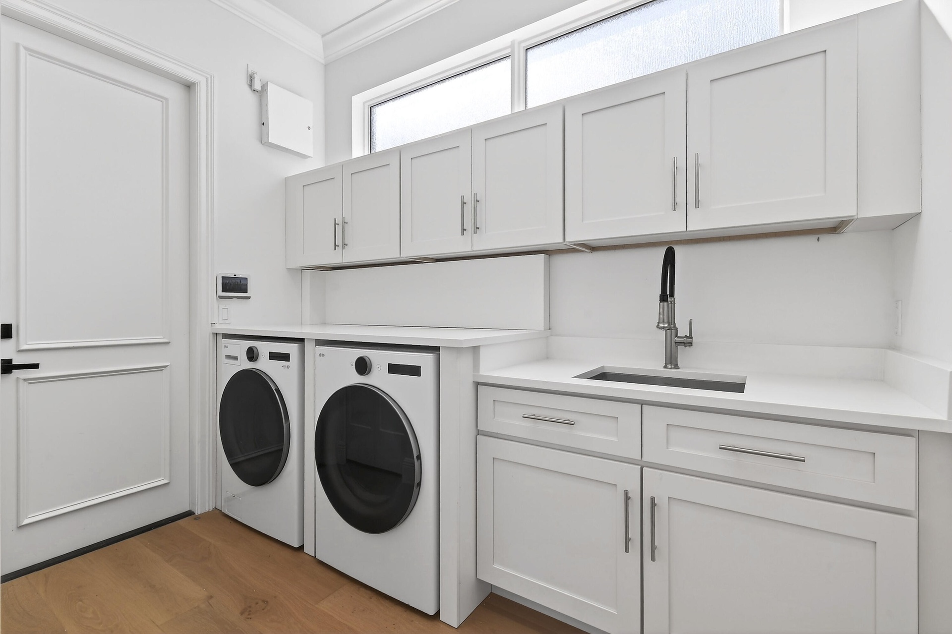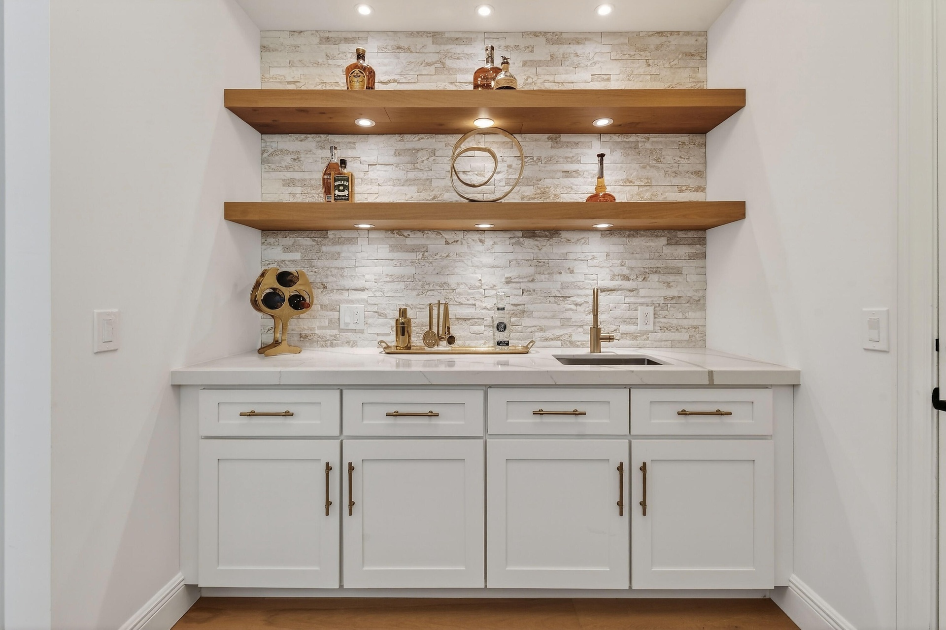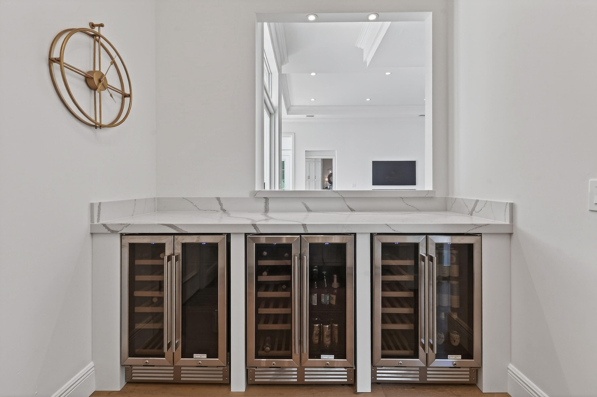 The designer kitchen features a fully integrated appliance suite with cabinetry-panel refrigerator and freezer, streamlined custom cabinetry, and upper and lower accent lighting. A three-sided glass fireplace adds architectural interest and warmth to the main living space. In a separate great-room setting, a climate-controlled three-unit wine preservation bar anchors the dedicated wet bar area, creating a refined focal point for entertaining. The laundry room includes built-in cabinetry for added function and storage.