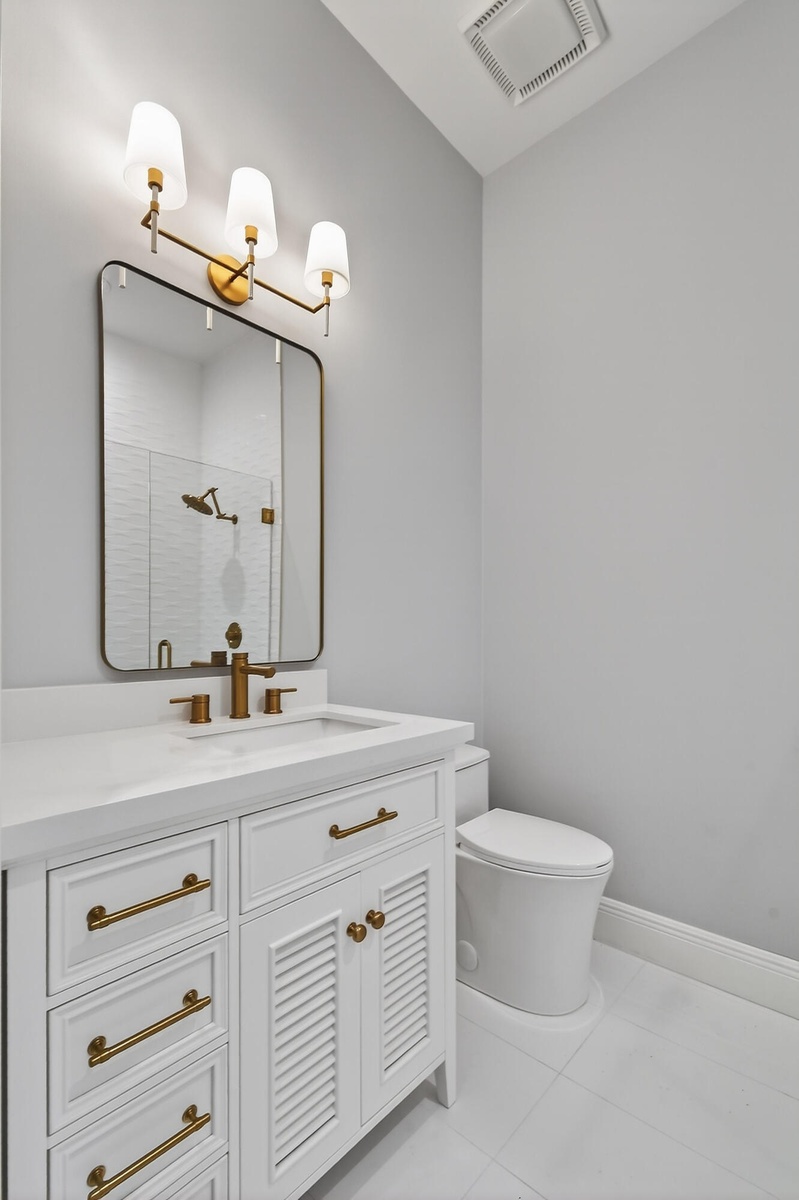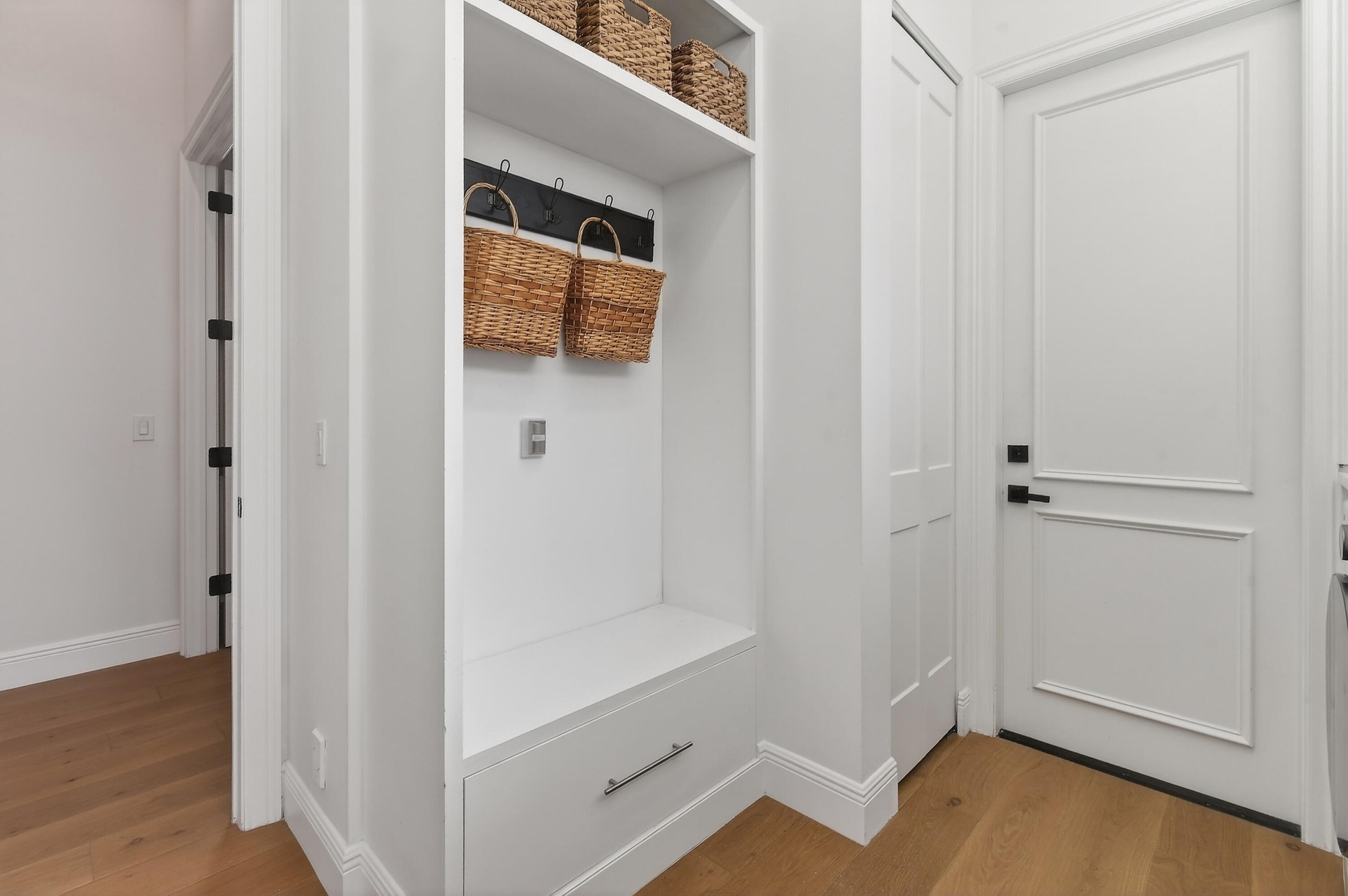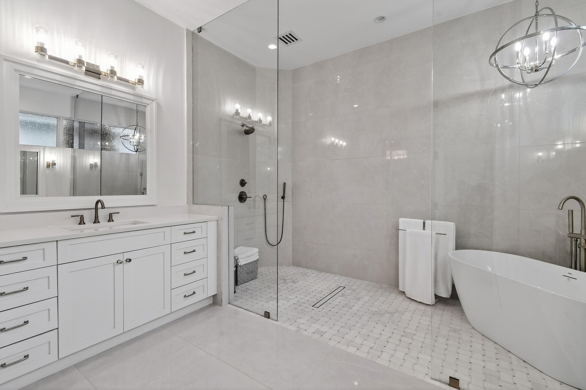 The primary suite is a serene retreat with dual walk-in closets and a spa-inspired bath finished with all-white quartz countertops, a frameless glass shower, and modern fixtures. Four additional bedroomseach with custom-built closets and updated en-suite bathsprovide flexibility for guests, family, or dedicated workspaces.