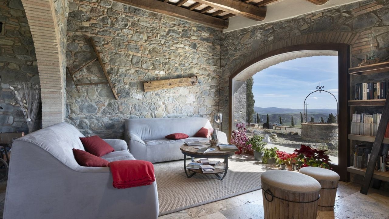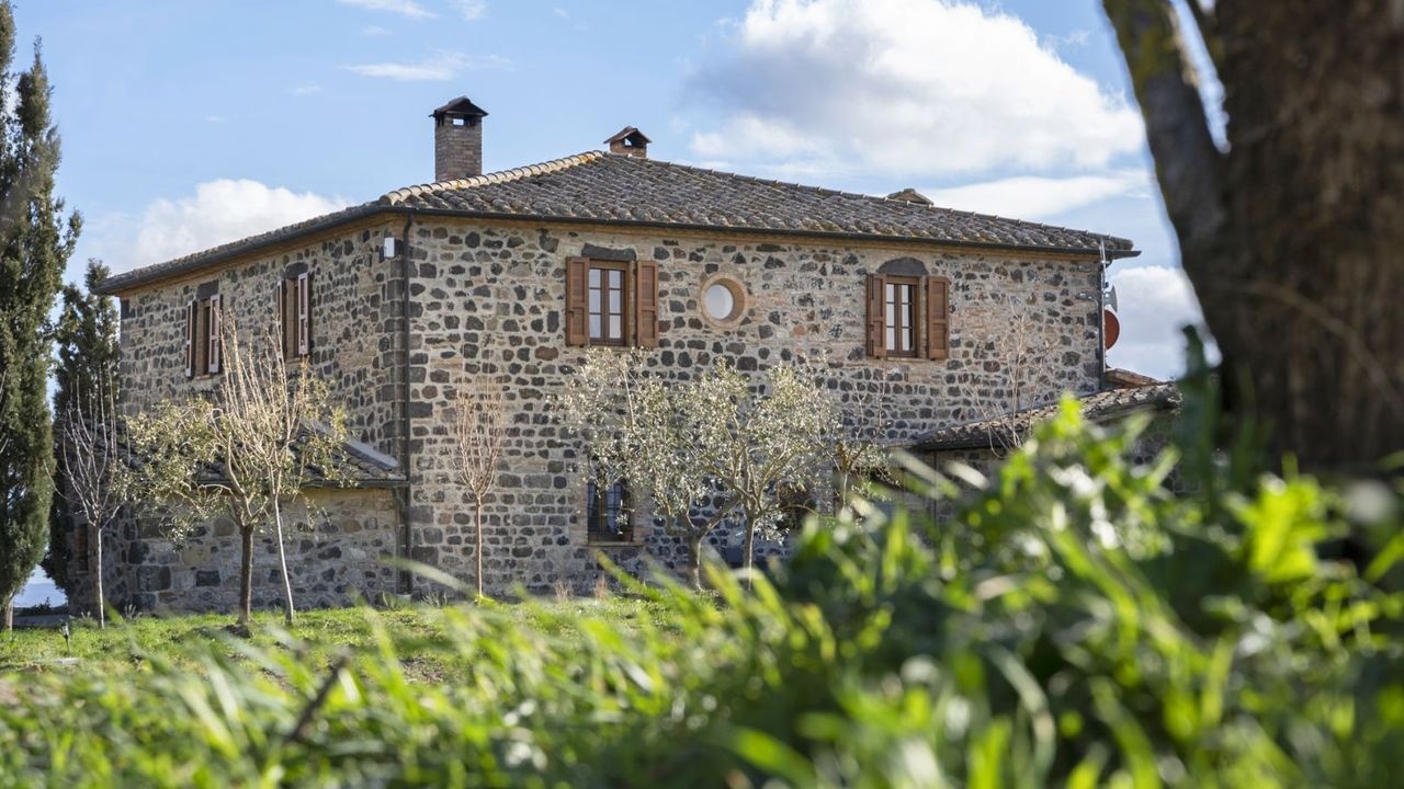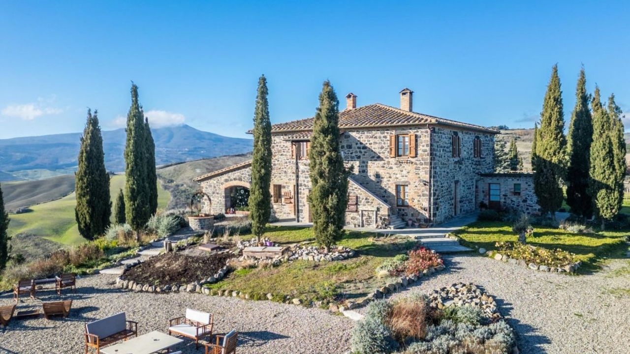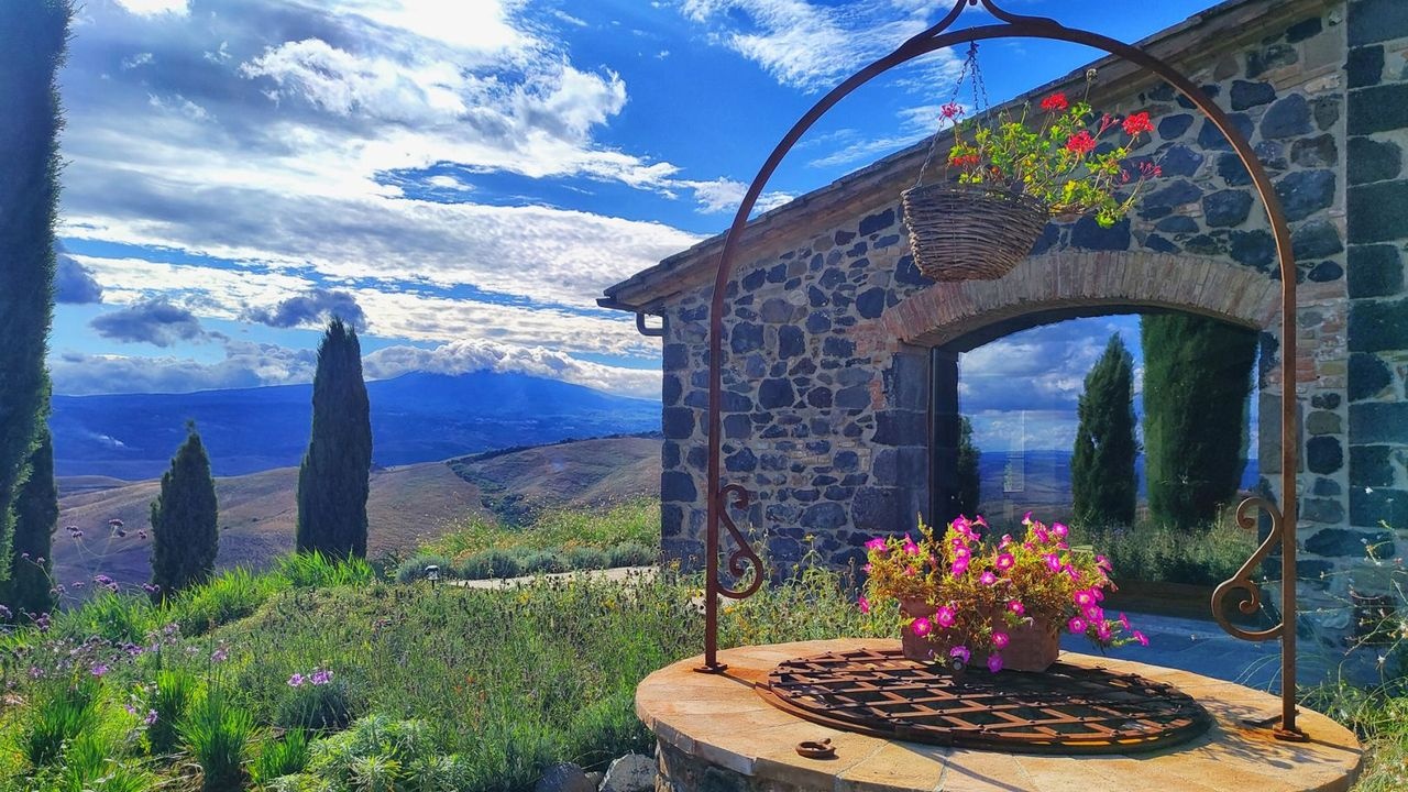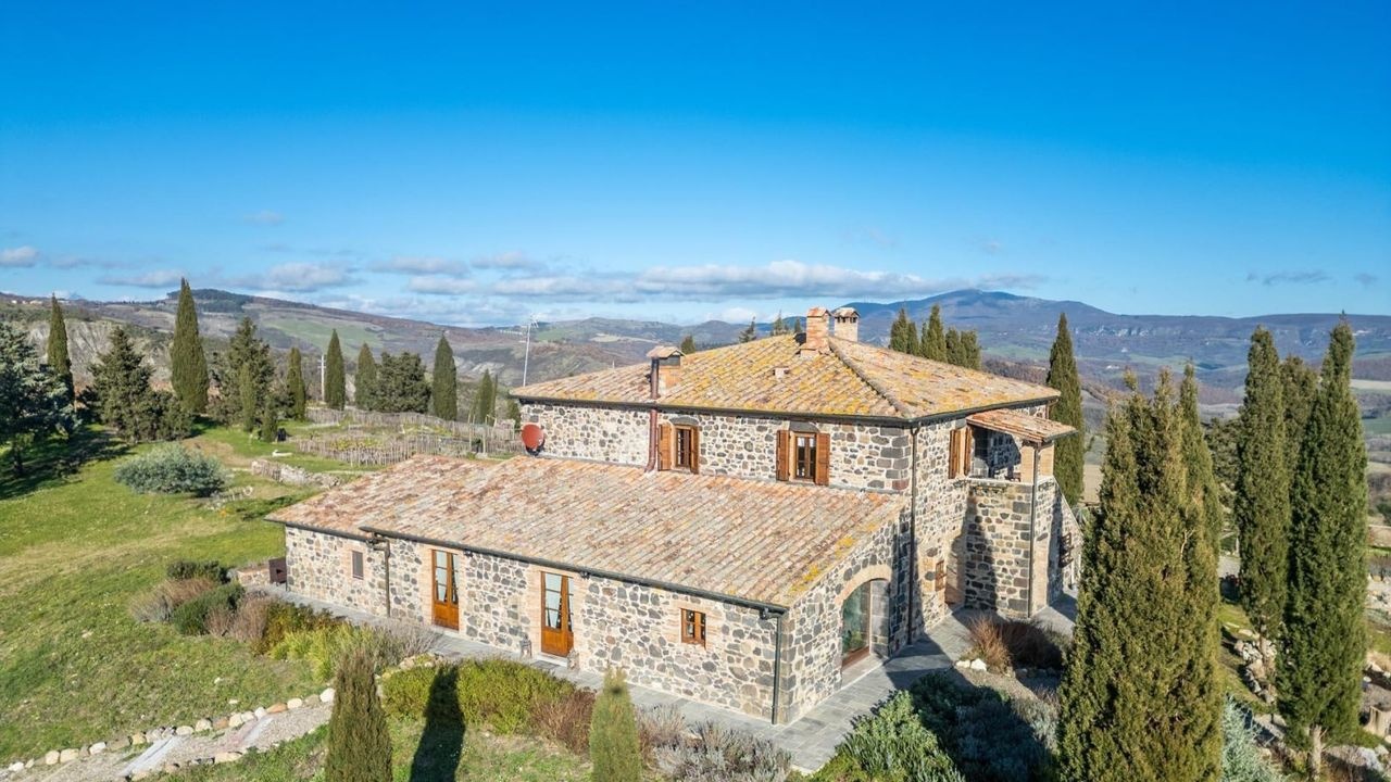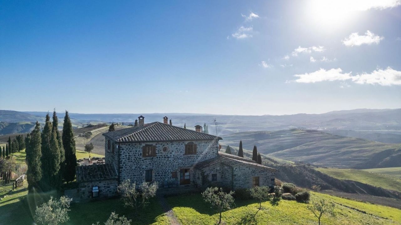 Situated in a dominant position on the ridge, the 450 m2 property enjoys an open view that stretches from the historic tower of Radicofani to the slopes of Monte Amiata, embracing the entire Val d'Orcia landscape.