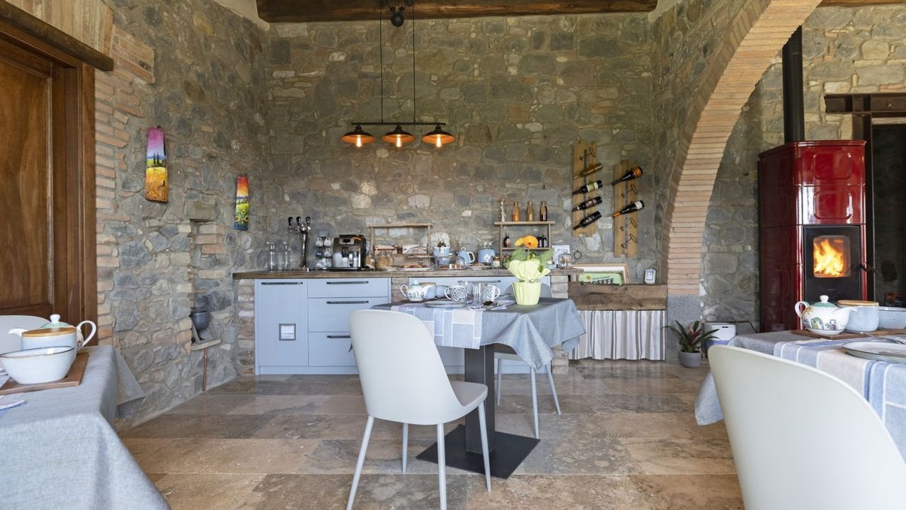 The ground floor features spacious and bright rooms, where the large original arches set the rhythm of the living area. A large panoramic window allows the surrounding landscape to visually enter the interior spaces, creating a constant dialogue with nature. On this level, there are also three bedrooms, each with its own private bathroom and independent access to the outside, as well as a wellness area with a sauna and relaxation area.