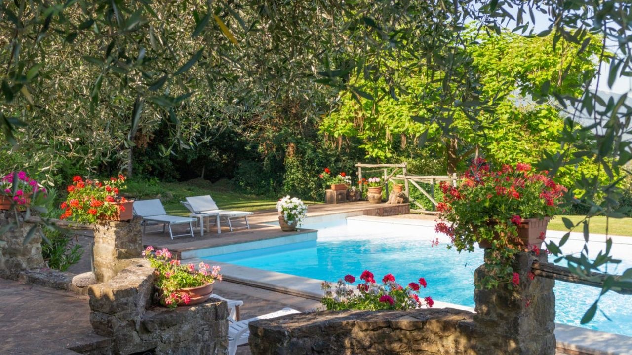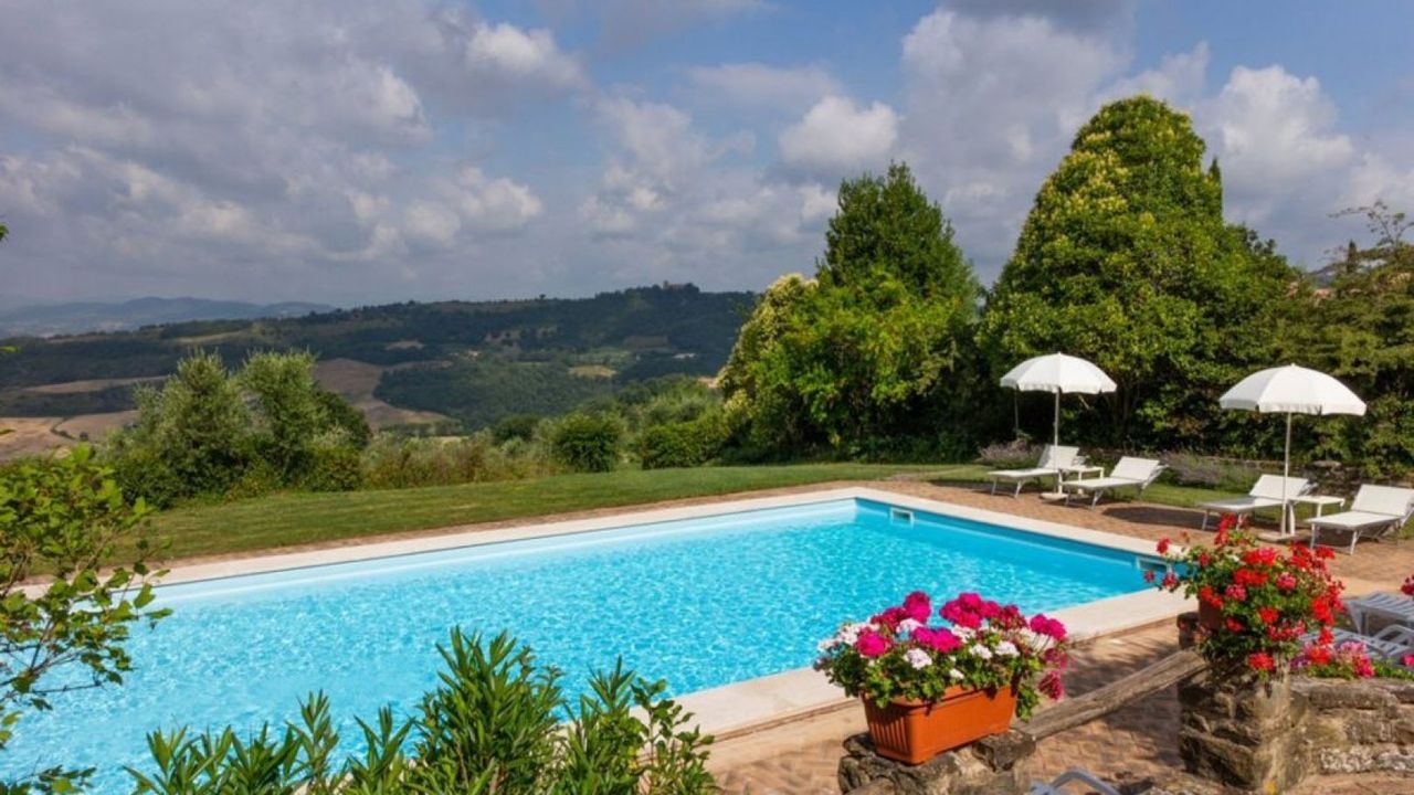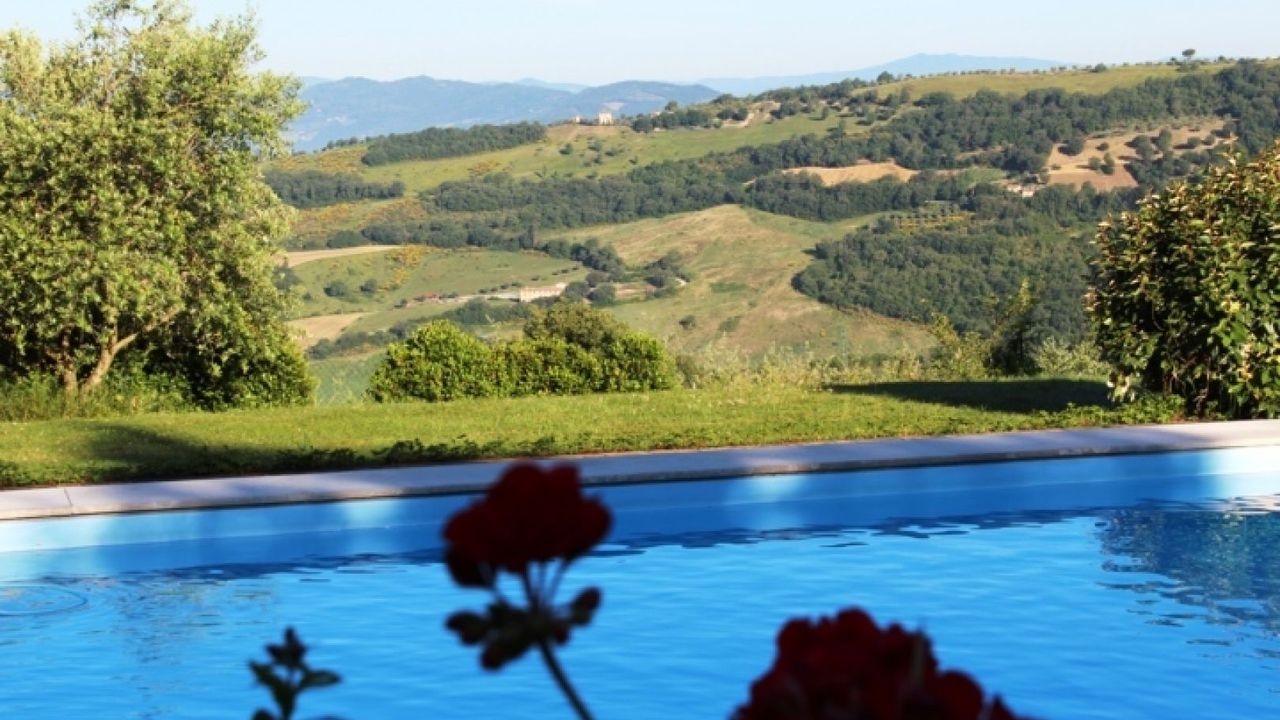 The panoramic swimming pool (6x14 m, salt water with low chlorine content) with large solarium is in a secluded position and enjoys a breathtaking view of the Tiber valley, especially at sunset.