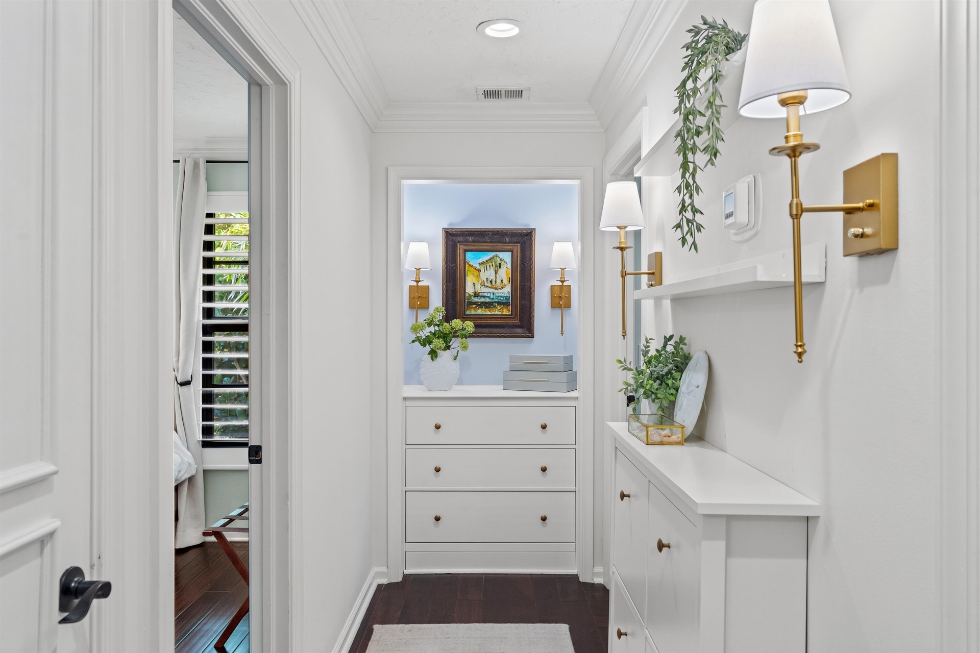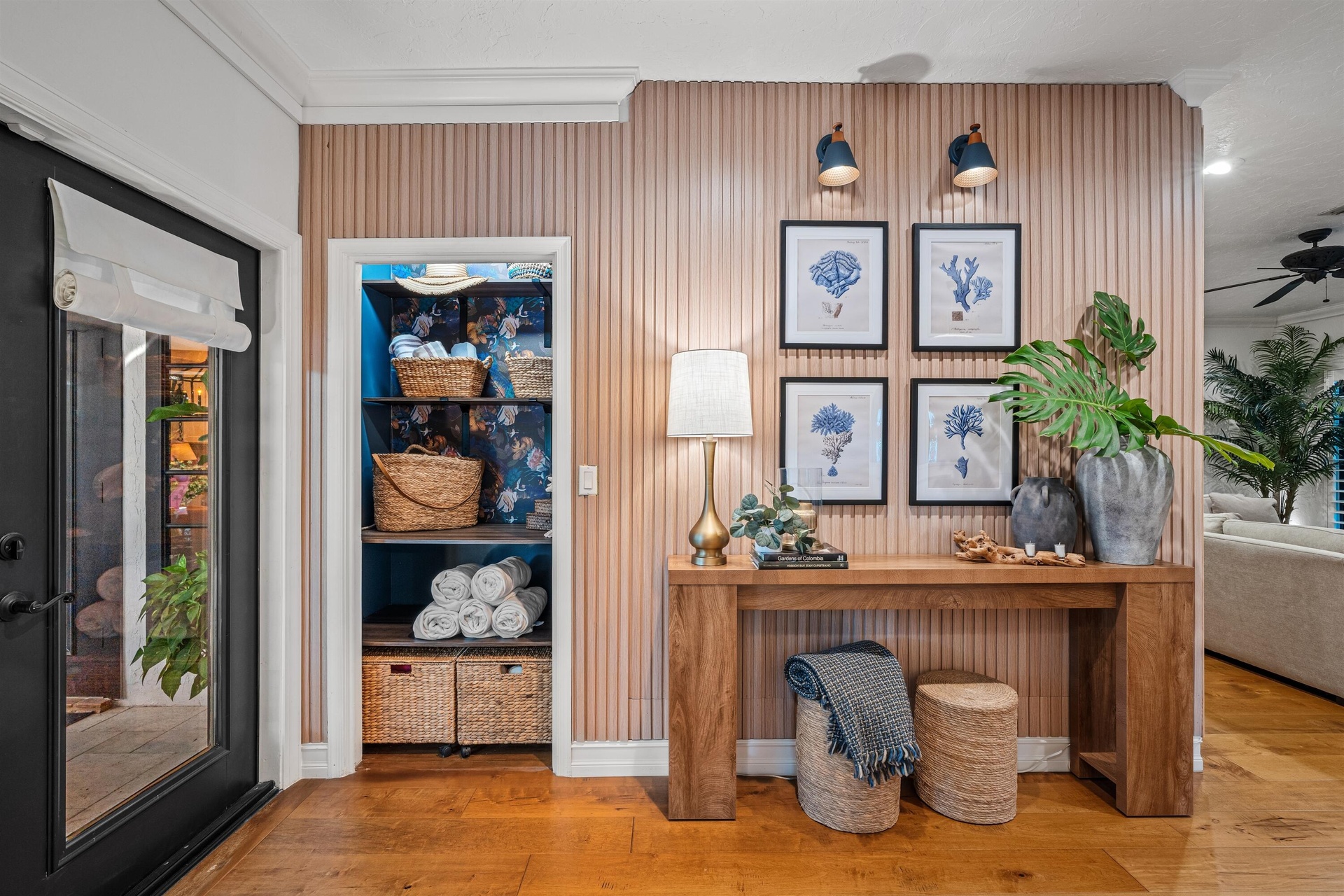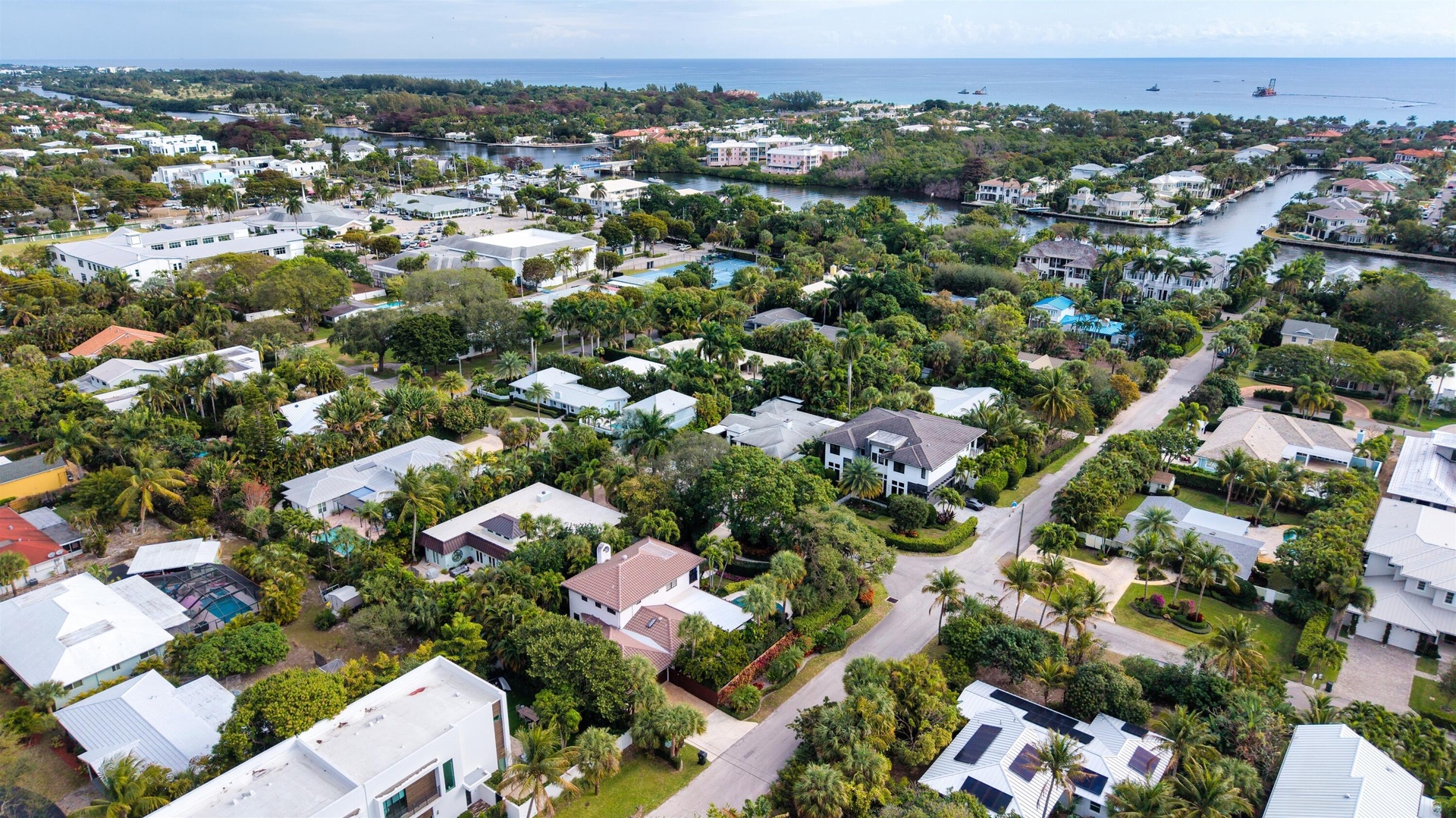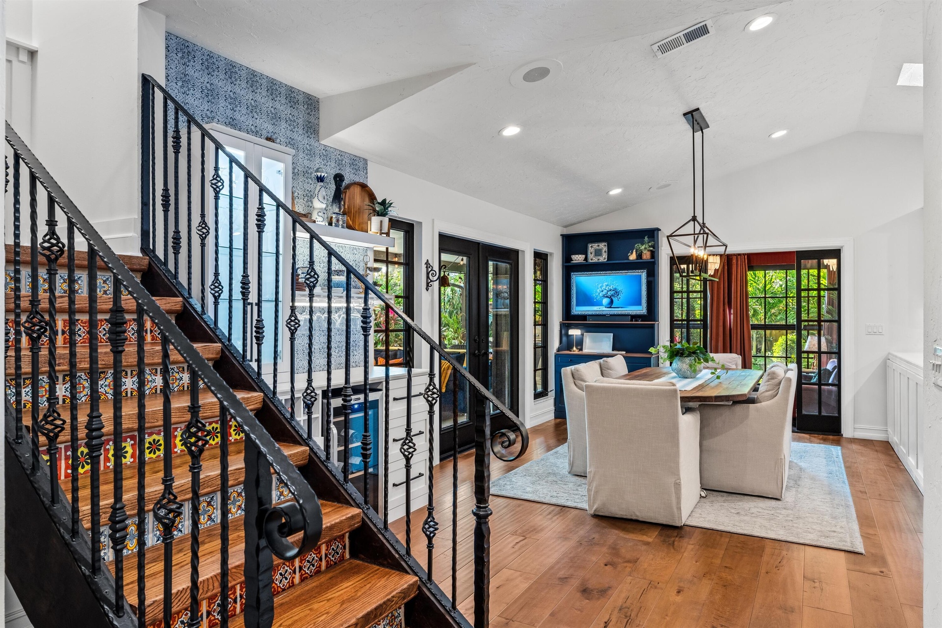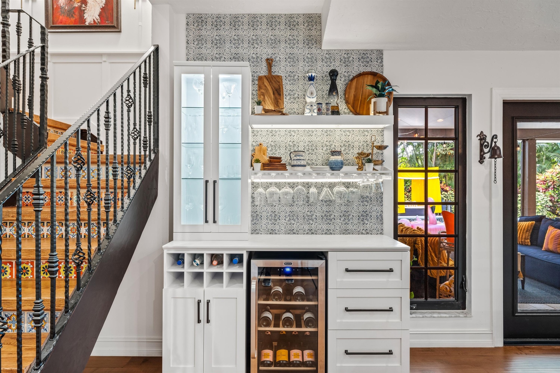 This South Florida paradise enchants with a refined country/contemporary aesthetic that is ultra-elegant, sumptuous and commodious. Offering three bedrooms and 3,180± total square feet, bespoke decorator appointments elevate this gem to luxury status. Highlights include a foyer with a built-in bench; a ribbon gas fireplace, attractive custom built-in cabinetry, a bar with a wine fridge and French doors throughout that reveal garden views. The sunroom captivates, rich with paneling, a decorative ceiling, custom bookshelves and lustrous Spanish-tile flooring. Topped by a peaked ceiling incorporating a skylight, the cook-island kitchen is finished with new cabinets, quartz countertops and decorative backsplash, professional-grade appliances and a custom-fitted pantry. All bedrooms are thoughtfully curated; the primary suite, complemented by a spa-like bathroom, is especially charming, featuring paneling with applied molding, classic chair rail, and French doors to a private balcony evoking Old World European charm. Additional details include handsome wide-plank wood flooring, plantation shutters and decorator wall coverings. The property also features a drive-through three-car garage and new infrastructure upgrades that include a barrel-tile roof, electric panel, tankless hot-water heater, air-conditioners and sprinkler system.