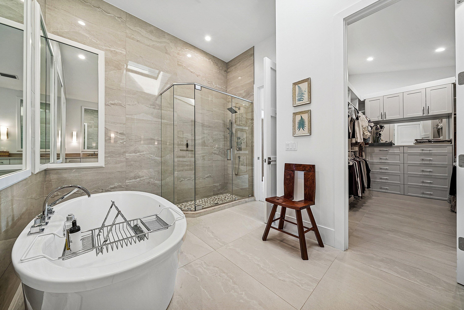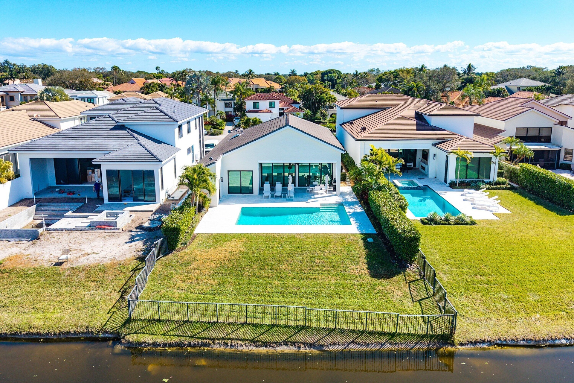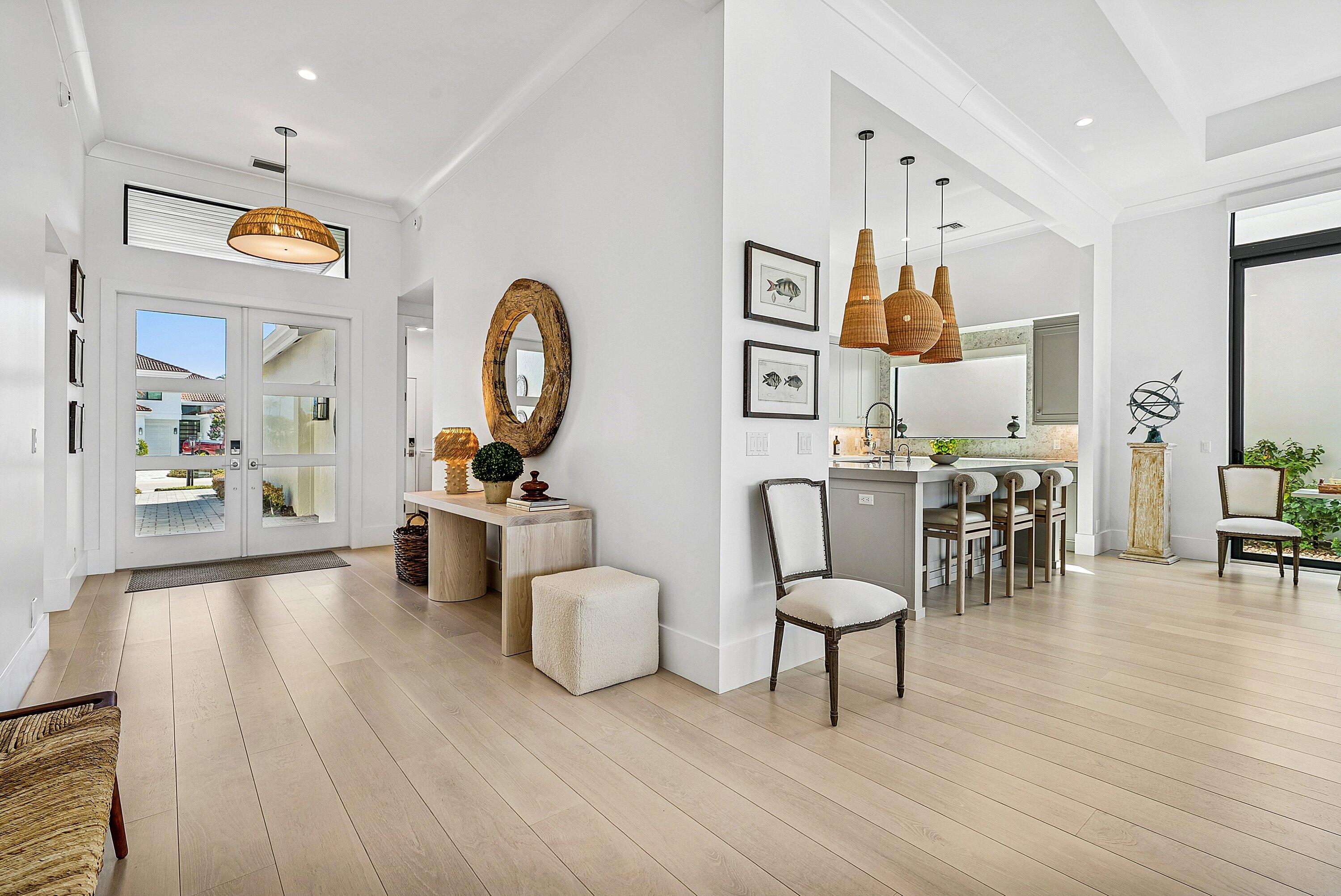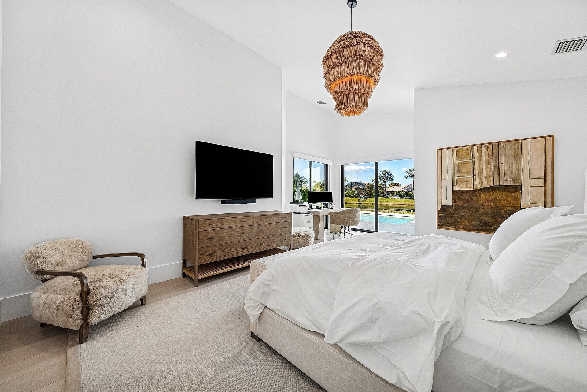 Upon entry, an abundance of natural light pours through a wall of windows along the rear of the home, highlighting the soaring ceilings and seamless flow between the main living and entertaining areas. Tastefully finished in neutral tones, the home showcases engineered white oak hardwood flooring throughout the living areas. The kitchen boasts premium Thermador appliances with custom panel-ready finishes that integrate effortlessly into the cabinetry for a sleek look. The spacious primary suite is complete with two walk-in closets, dual bathrooms - one serving as a convenient cabana bath - and a bonus office space with tranquil pool and lake views. The primary bath features a soaking tub, separate glass-enclosed shower, and generous storage.