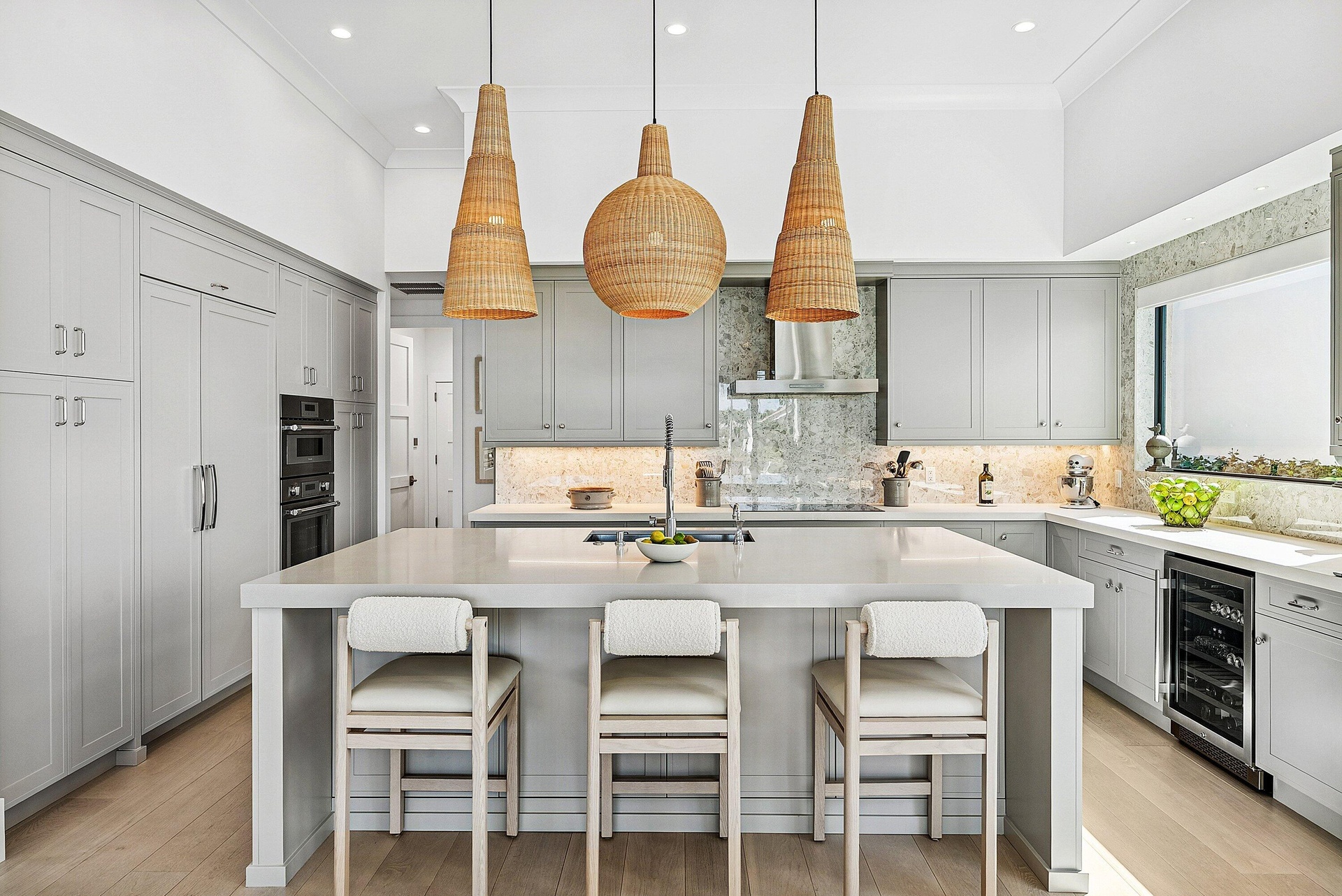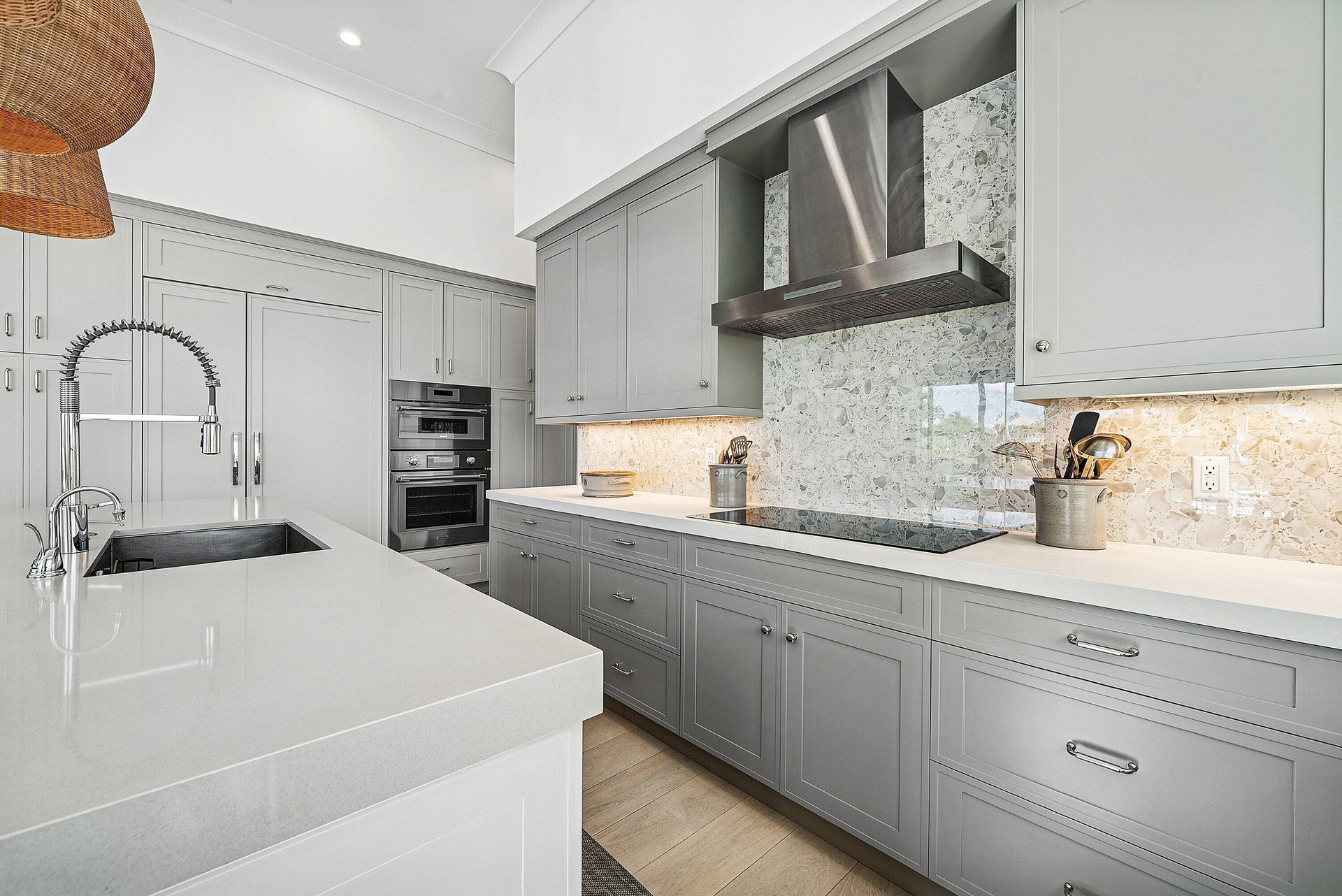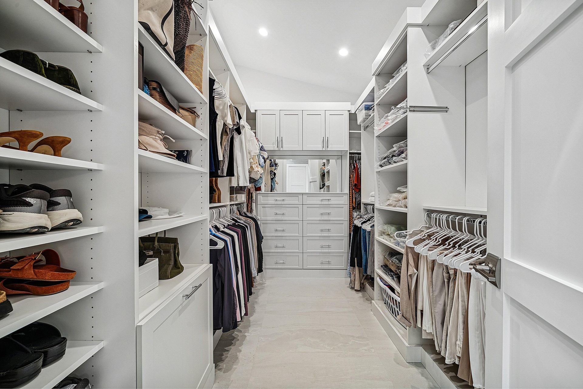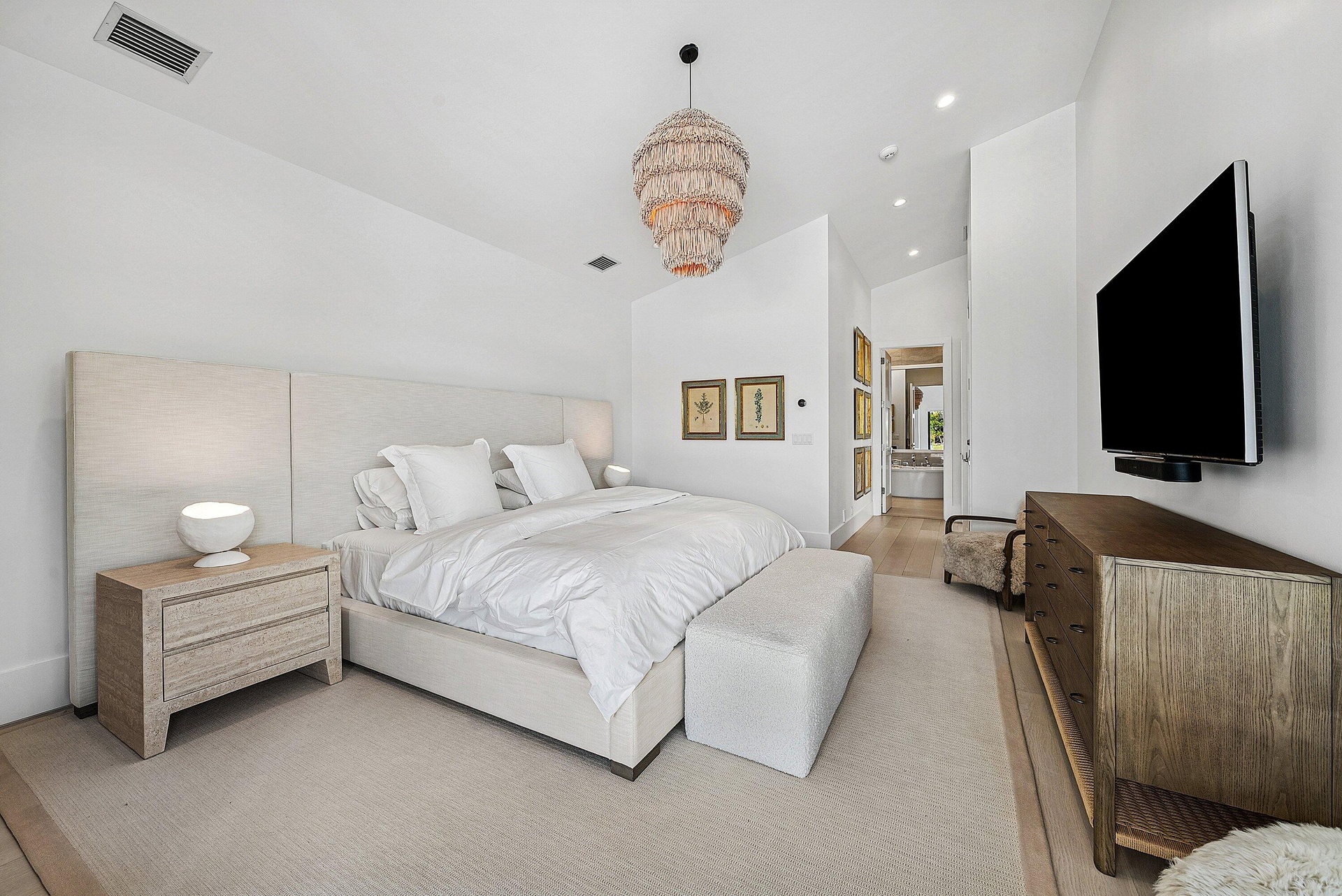 Upon entry, an abundance of natural light pours through a wall of windows along the rear of the home, highlighting the soaring ceilings and seamless flow between the main living and entertaining areas. Tastefully finished in neutral tones, the home showcases engineered white oak hardwood flooring throughout the living areas. The kitchen boasts premium Thermador appliances with custom panel-ready finishes that integrate effortlessly into the cabinetry for a sleek look. The spacious primary suite is complete with two walk-in closets, dual bathrooms - one serving as a convenient cabana bath - and a bonus office space with tranquil pool and lake views. The primary bath features a soaking tub, separate glass-enclosed shower, and generous storage.
