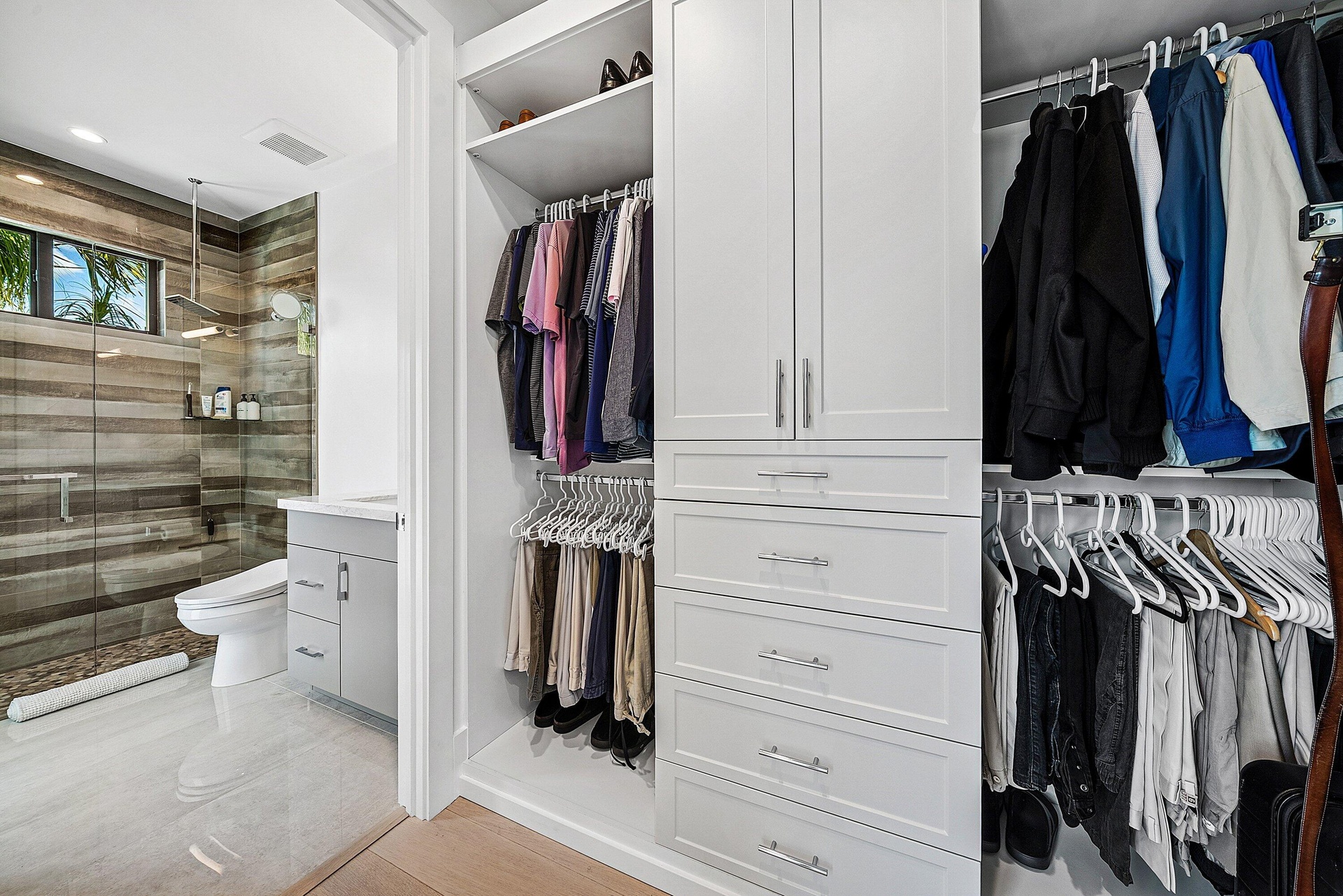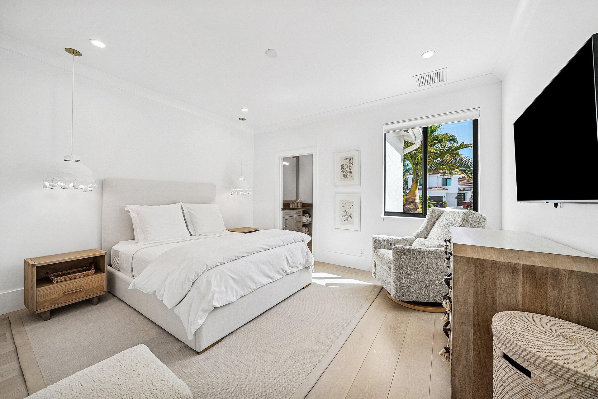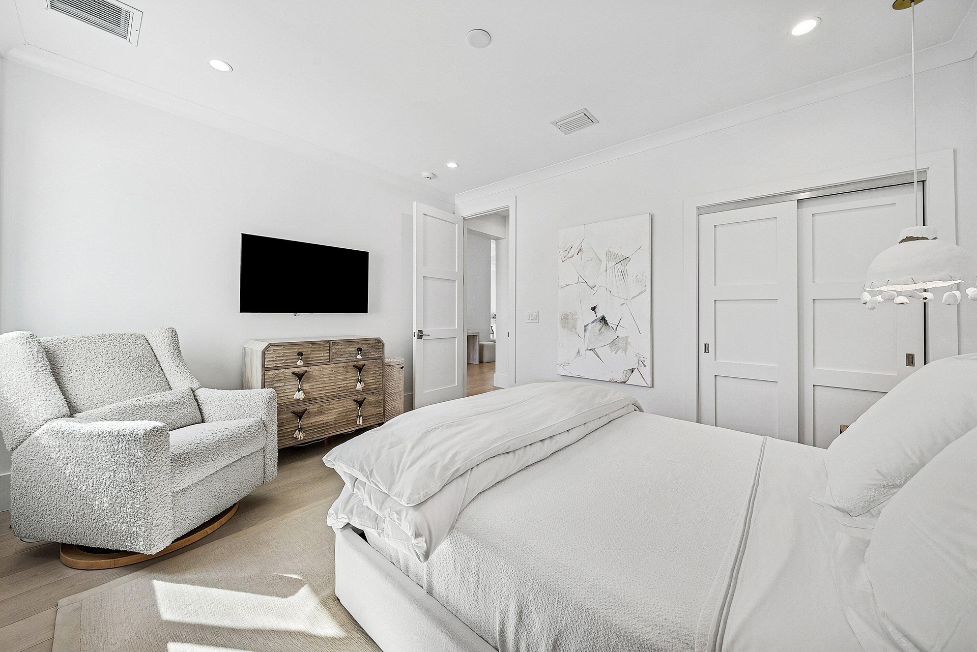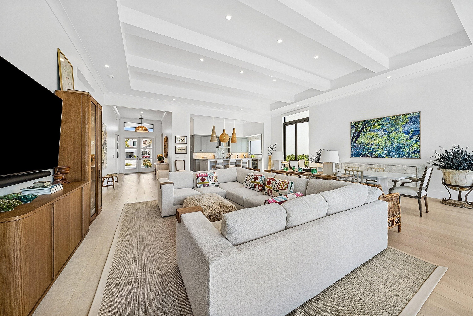 Upon entry, an abundance of natural light pours through a wall of windows along the rear of the home, highlighting the soaring ceilings and seamless flow between the main living and entertaining areas. Tastefully finished in neutral tones, the home showcases engineered white oak hardwood flooring throughout the living areas. The kitchen boasts premium Thermador appliances with custom panel-ready finishes that integrate effortlessly into the cabinetry for a sleek look. The spacious primary suite is complete with two walk-in closets, dual bathrooms - one serving as a convenient cabana bath - and a bonus office space with tranquil pool and lake views. The primary bath features a soaking tub, separate glass-enclosed shower, and generous storage.