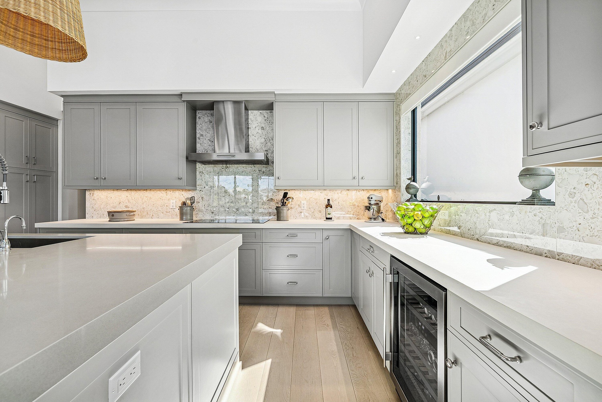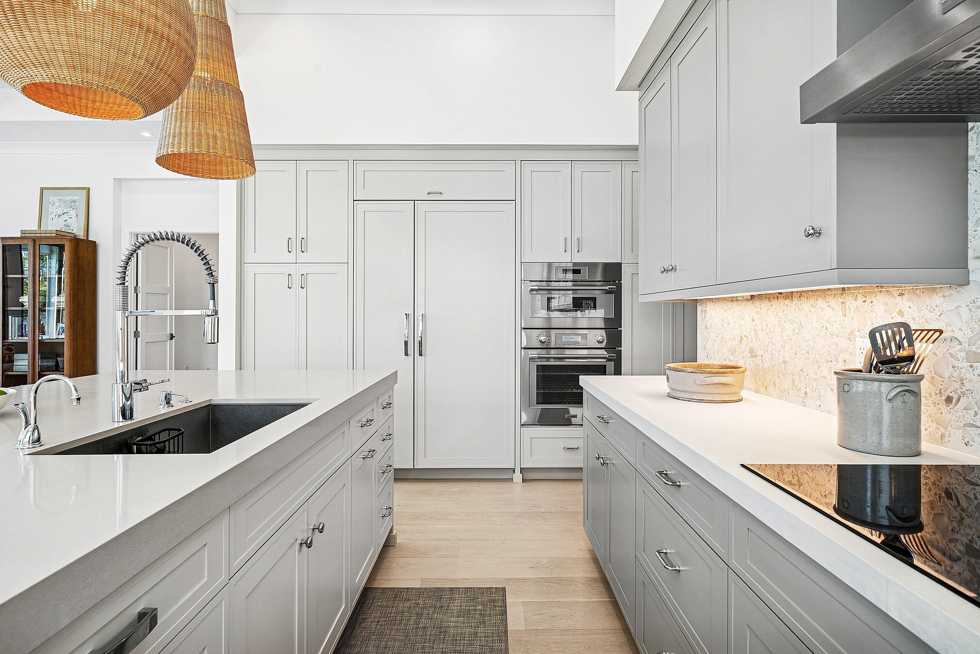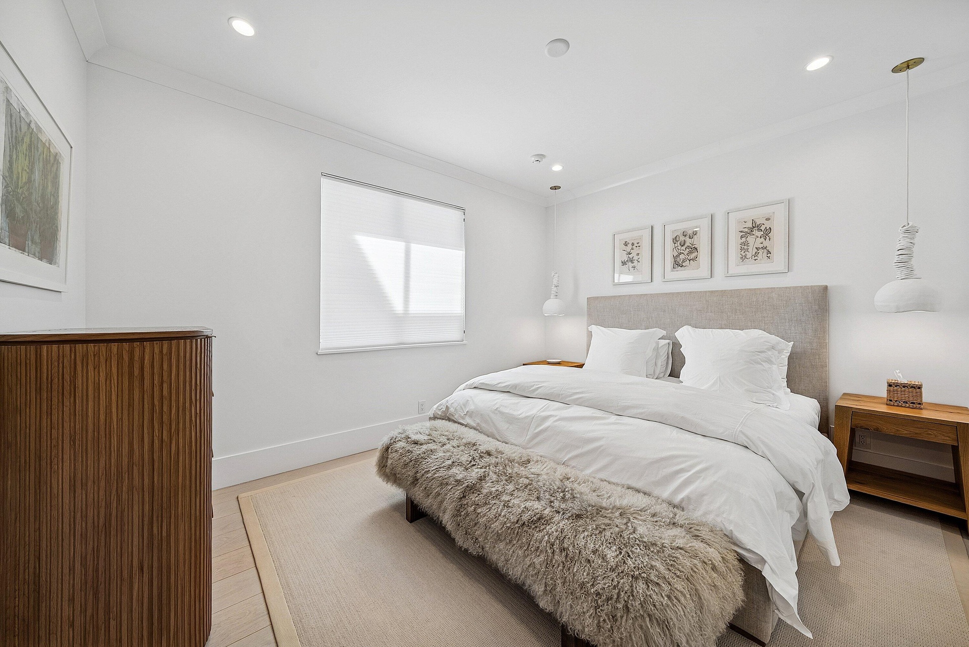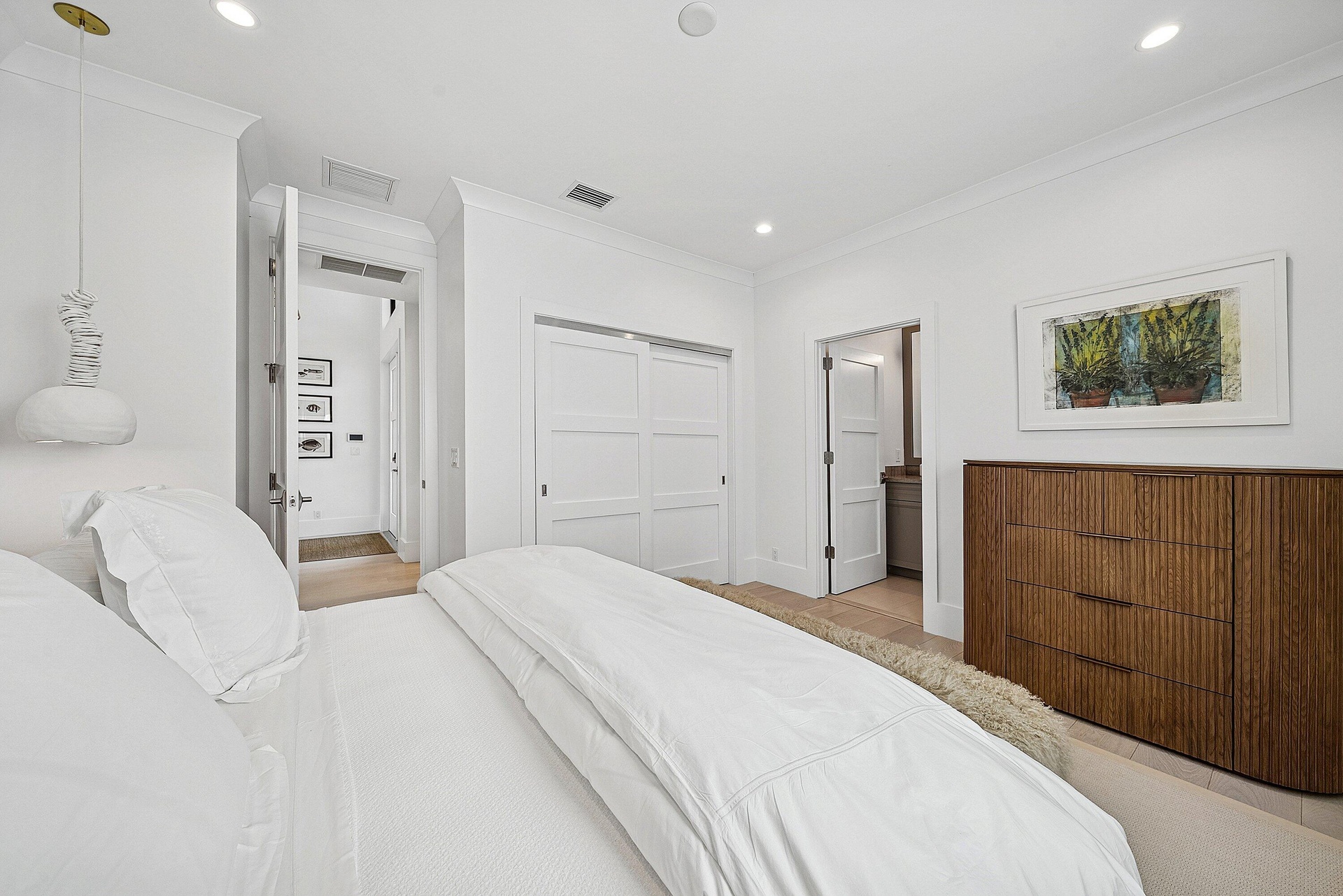 Upon entry, an abundance of natural light pours through a wall of windows along the rear of the home, highlighting the soaring ceilings and seamless flow between the main living and entertaining areas. Tastefully finished in neutral tones, the home showcases engineered white oak hardwood flooring throughout the living areas. The kitchen boasts premium Thermador appliances with custom panel-ready finishes that integrate effortlessly into the cabinetry for a sleek look. The spacious primary suite is complete with two walk-in closets, dual bathrooms - one serving as a convenient cabana bath - and a bonus office space with tranquil pool and lake views. The primary bath features a soaking tub, separate glass-enclosed shower, and generous storage.