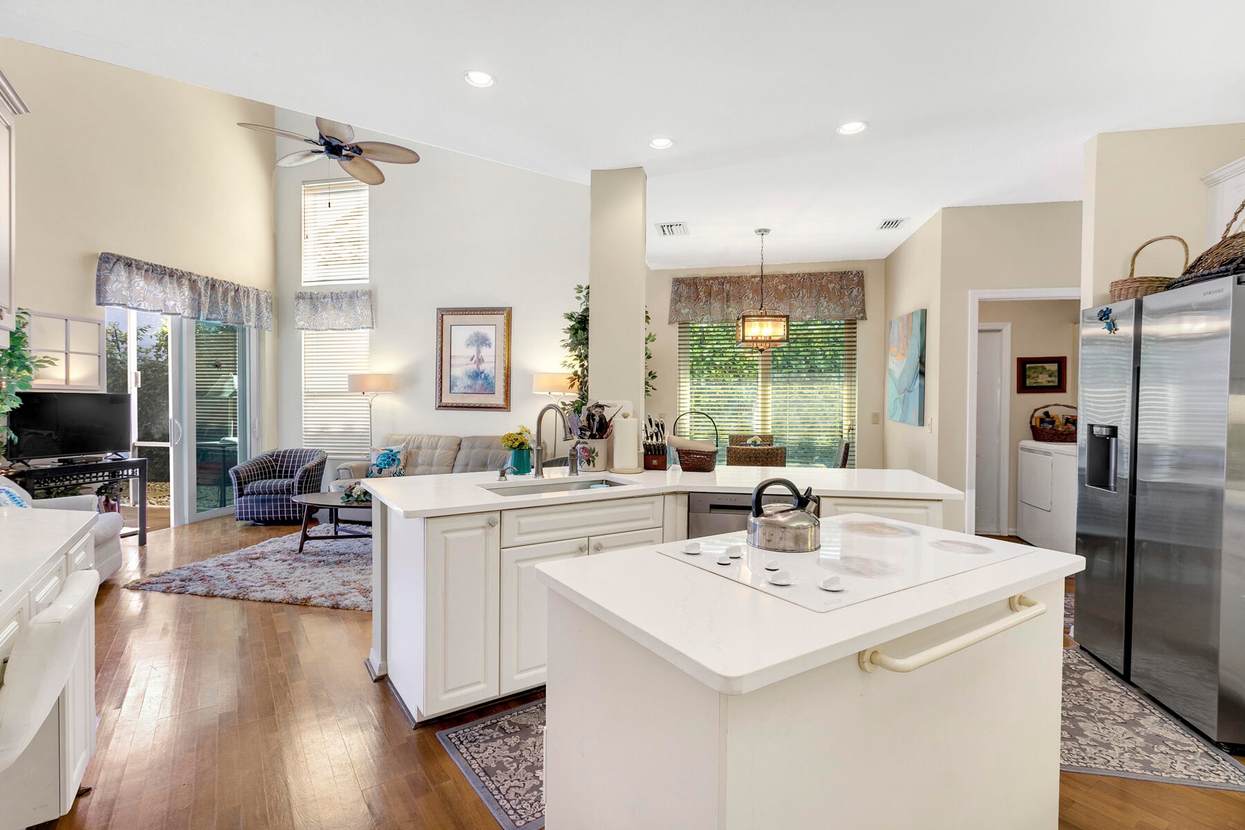 Updated & Beautifully Maintained SFH in One of the Most Prestigious Gated Communities of Eastpointe*3BR/2.5BA/2.5-Car Garage+Den+Loft*Spacious Master BE Conveniently Located on First Floor w/Walk-in Closet & Direct Access to Pool Area*Updated BA w/Double Vanities & Powder Area,Jetted Soaking Tub & Separate Shower*White Kitchen w/Quartz Countertops,Double Oven & Induction Cooktop*Both Guest BAs Renovated in Today's Modern Style*This Gorgeous Home Offers High Ceilings,Open Concept Floor Plan,Serene Lake View,Along with a Wrap-Around Screened & Covered Patio & Heated Pool Perfect for Daily Living & Entertaining*All Impact Windows & Sliders Doors*Enjoy Two Clubhouses w/Amazing Amenities:2 Golf Courses,2 Pools & Spa,TechnoGym,Tennis & Pickle-Ball Courts,Playground,Dining & 24-hour security!