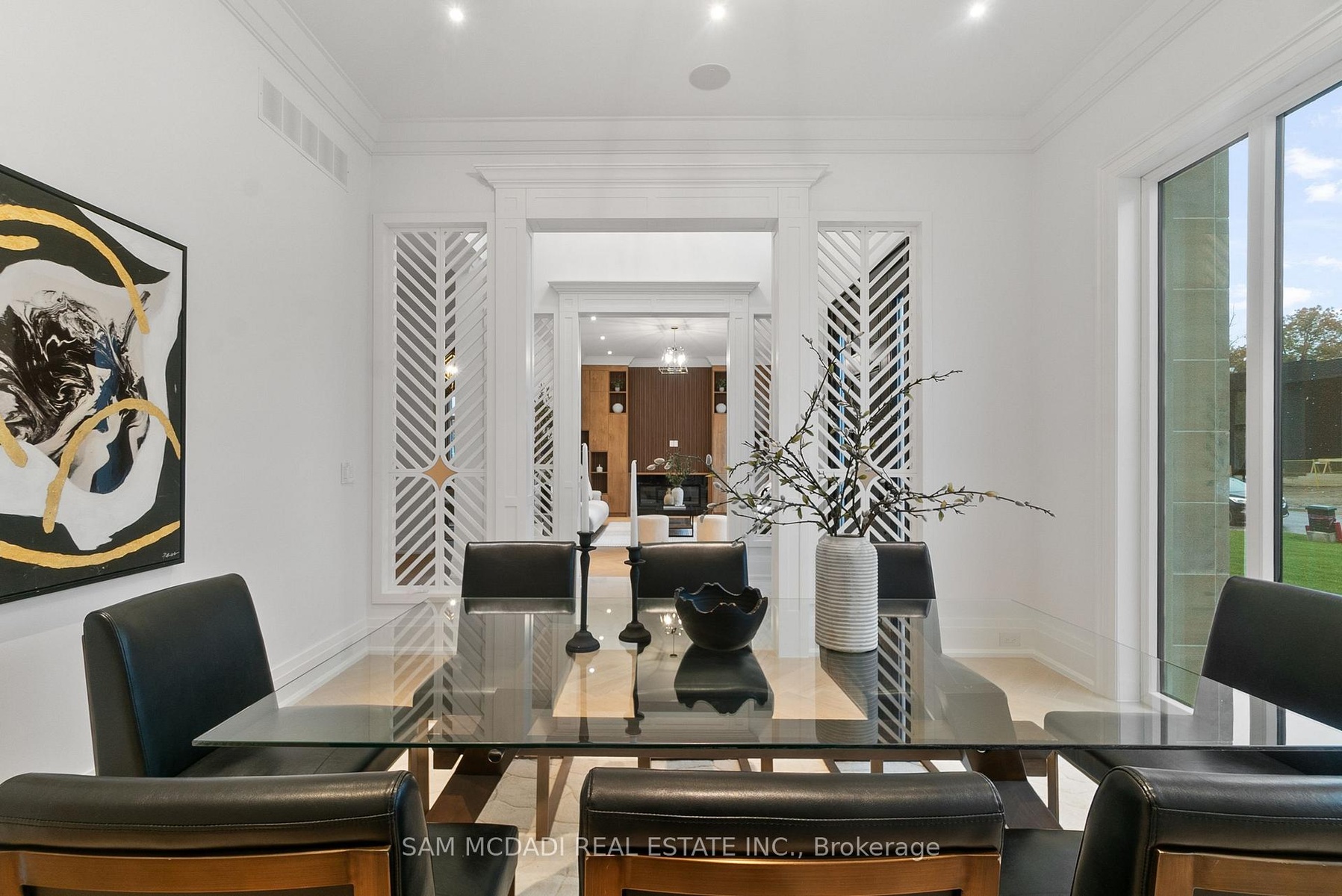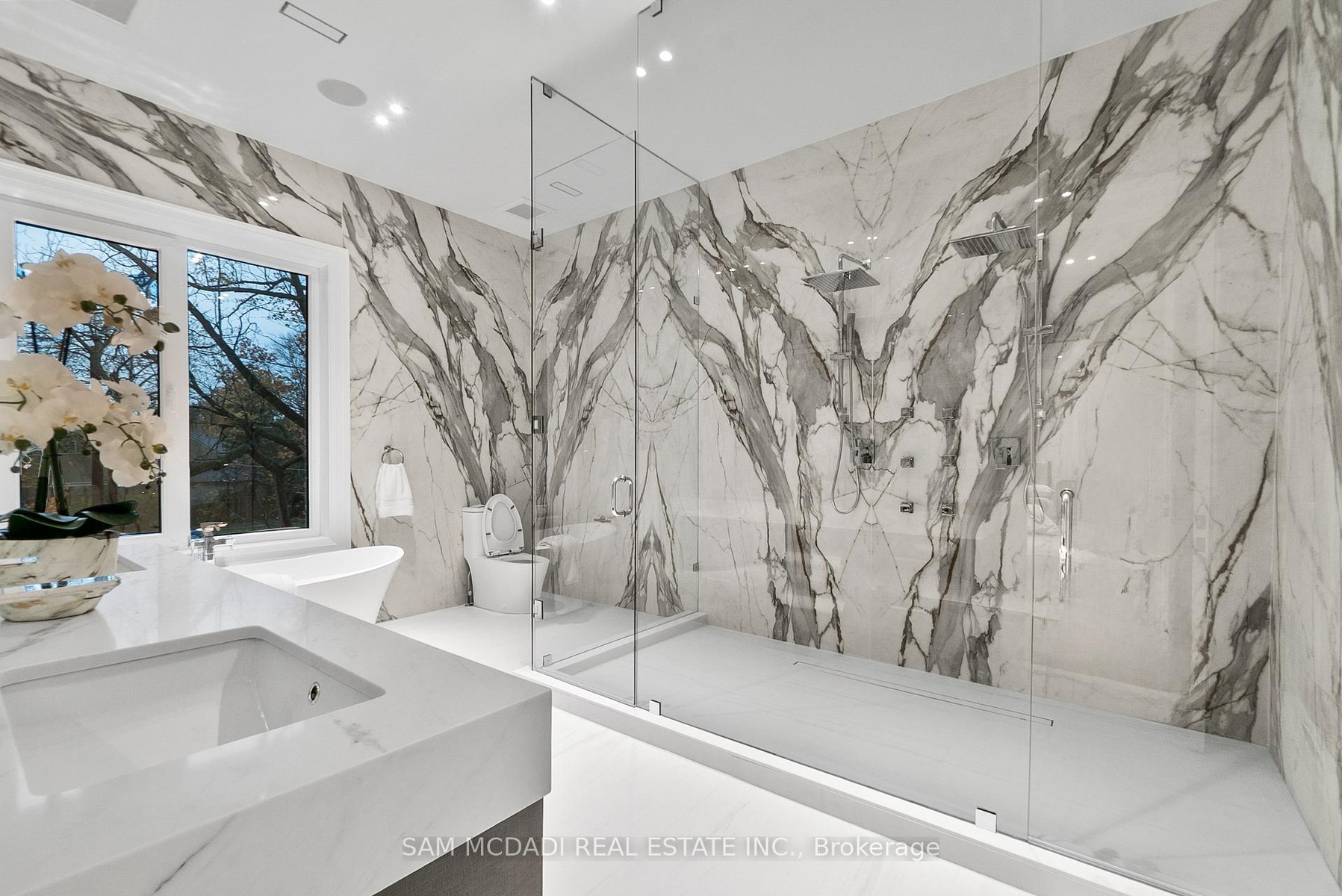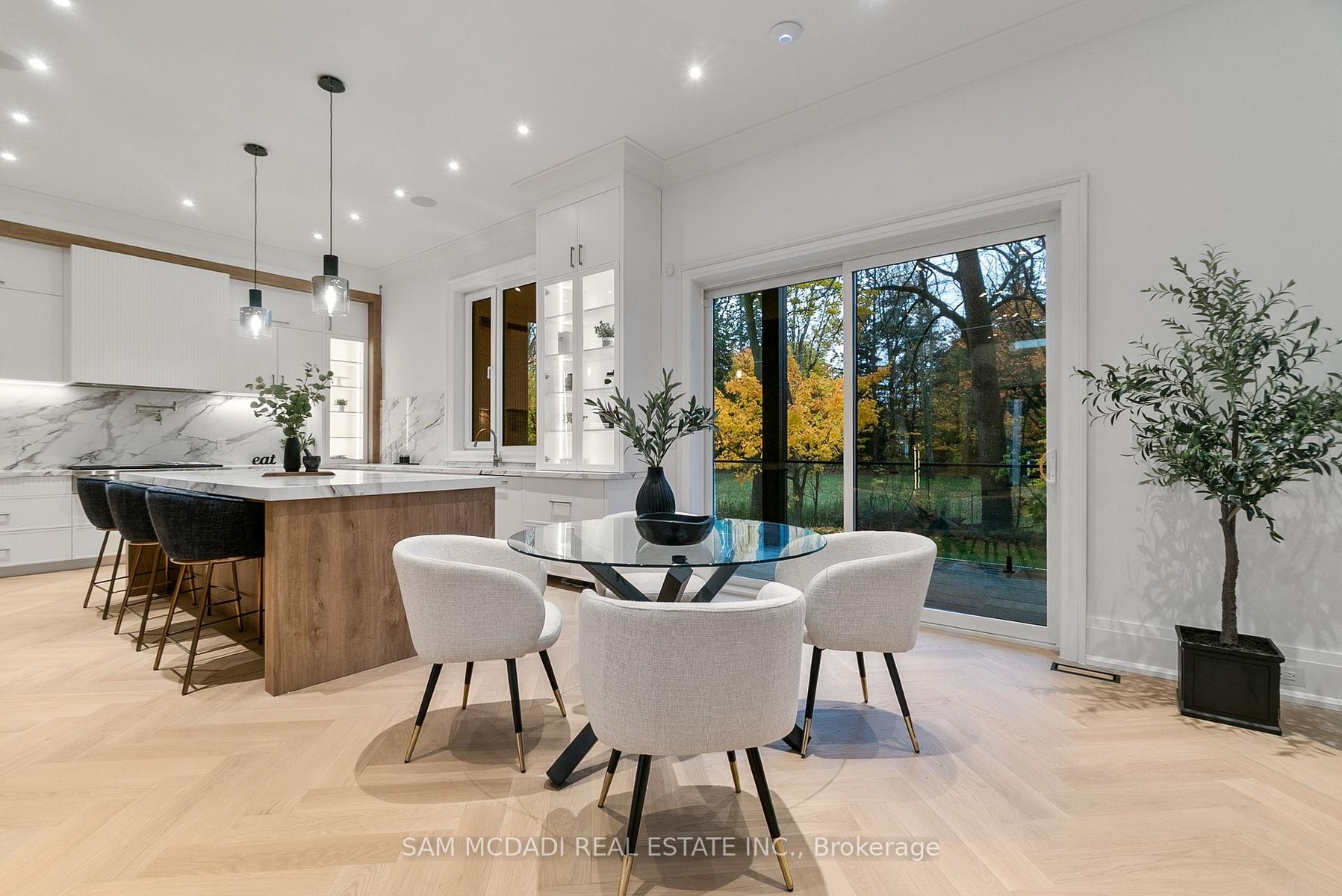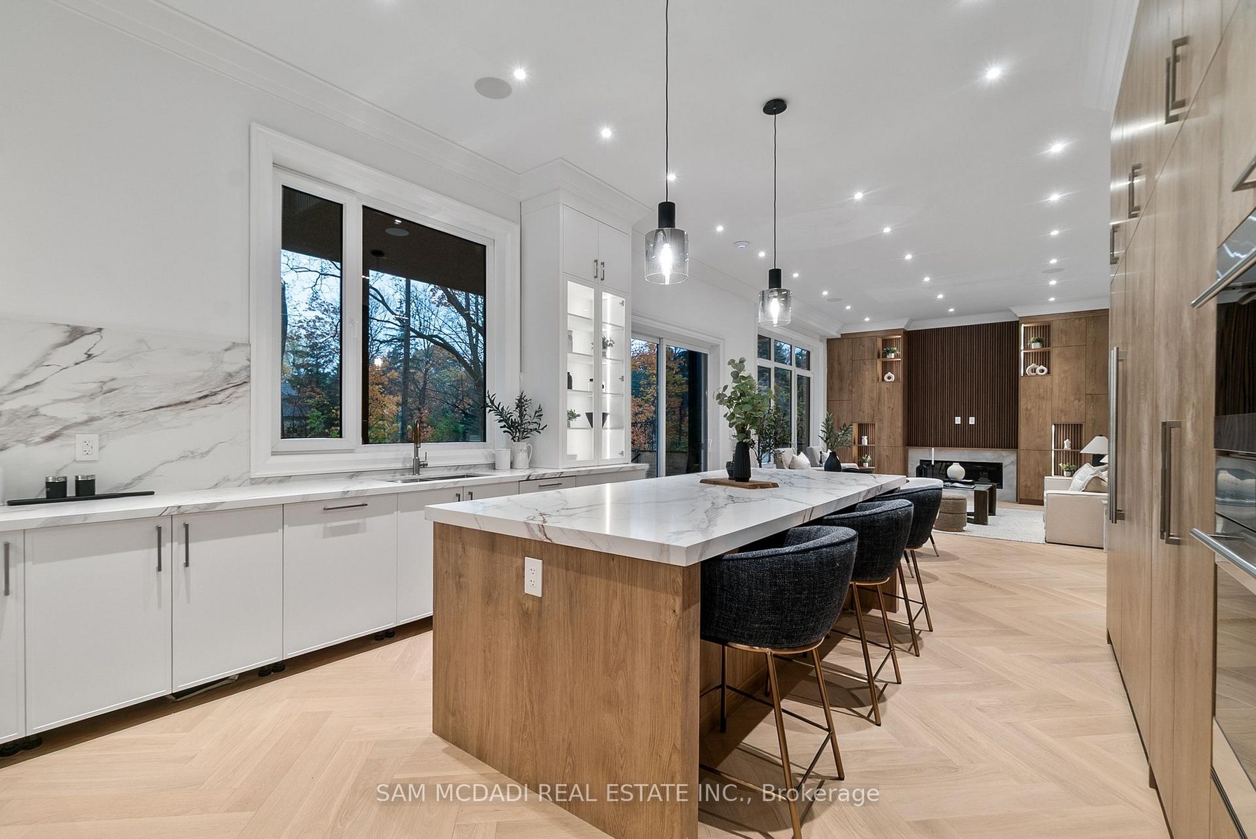 Set within one of Oakville's most distinguished enclaves, 84 Pebbleridge Place is a newly built modern estate that epitomizes architectural artistry and offers over 7,000 SF of refined living space. Poised on a private lot, this residence showcases a brick and limestone exterior, full-height glass walls a curated palette of luxurious finishes for the most discerning buyer. A grand double-height foyer introduces the home w/ polished marble-style porcelain and bespoke detailing. Beyond, herringbone hardwood floors flow through expansive principal rooms to a family room defined by a sleek wood feature wall, gas fireplace, and integrated Control4 automation for effortless entertaining. The designer kitchen is both statement and function, featuring an oversized island, full-height custom cabinetry, and Calacatta-style quartz counters w/ a custom backsplash. It opens directly to a covered deck w/ a gas fireplace, perfect for al fresco dining and evenings. An elevator and striking skylit staircase lead to the upper level, where four bedrooms each feature walk-in closets, tray ceilings, and private ensuites finished to spa-like standards. The primary suite is a serene retreat w/ a boutique-style dressing room and five-piece ensuite boasting a freestanding tub, oversized glass shower, full-height stone surrounds, and heated flooring. The lower level continues the theme of luxury and versatility, offering a heated basement w/ large-format porcelain slab flooring throughout. Designed for both relaxation and entertainment, this level includes a secondary kitchen, dining area, expansive living space, fitness room w/ cushioned flooring, an acoustically designed theatre, and three additional ensuite bedrooms, all enhanced by full-size windows and a separate entrance. Additional highlights include: a rough-in sauna, built-in speakers, and recessed lighting elevate comfort and ambiance, while upper-level laundry & a tandem garage w/ epoxy flooring complete this modern masterpiece.
