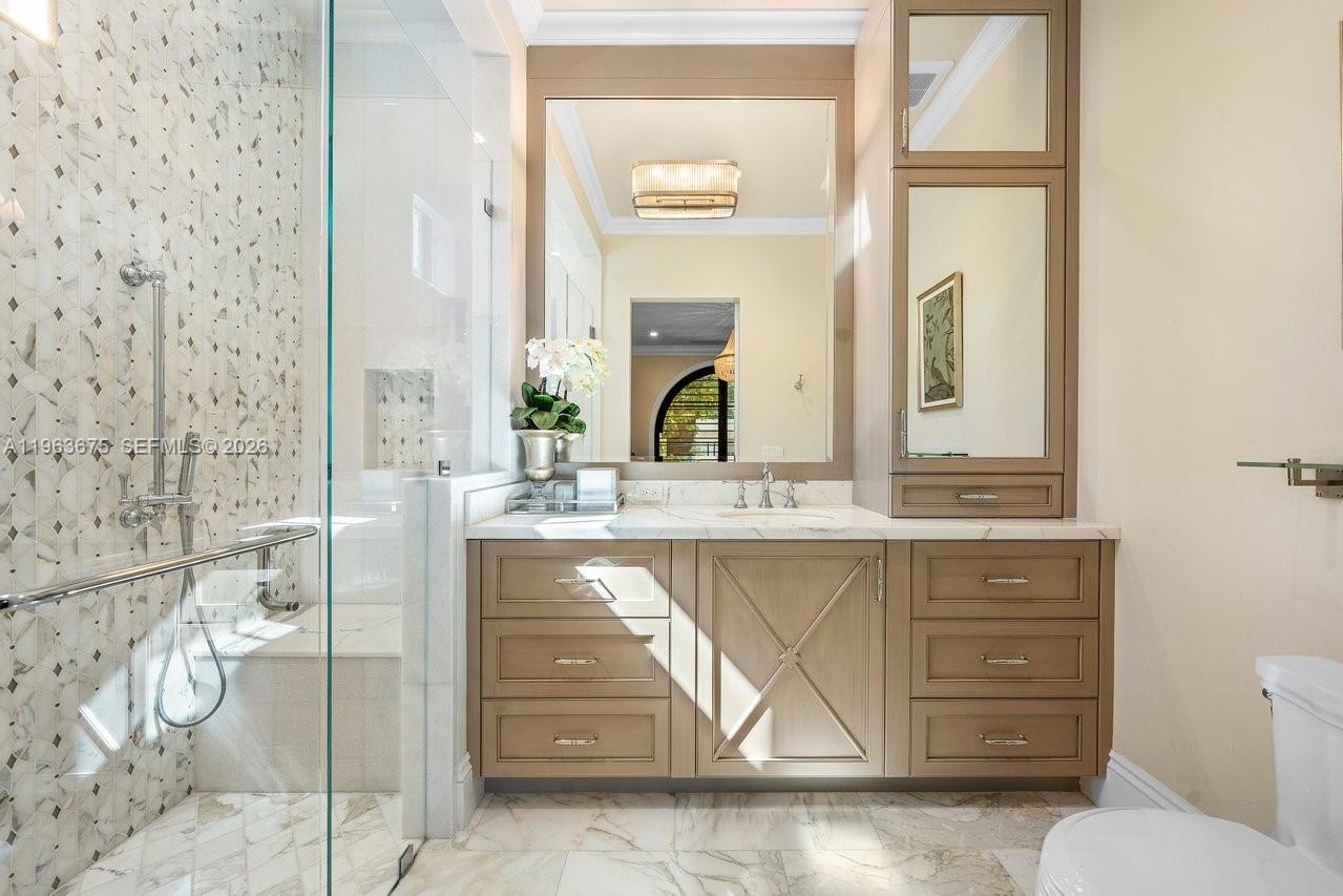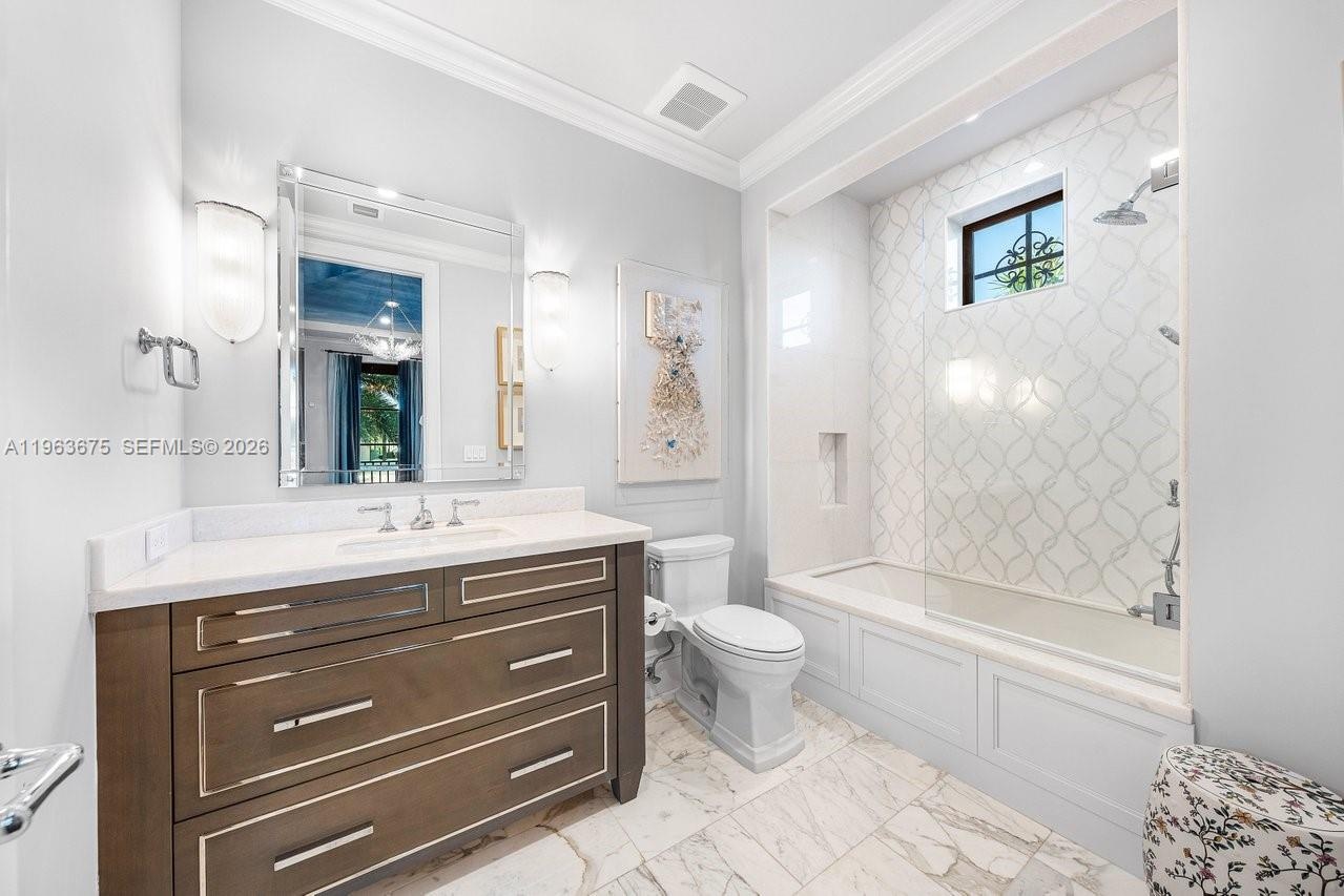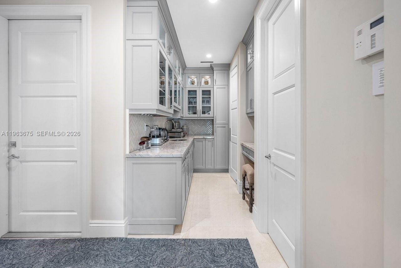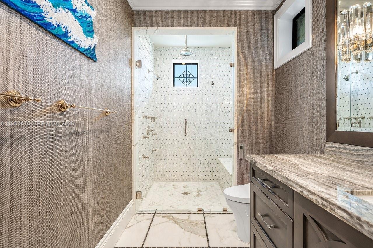 The main level reveals a breakfast room, butler’s pantry, executive office with cylindrical aquarium and custom millwork, wet bar, VIP guest suite, cabana bath, and integrated service spaces. The waterfront primary suite offers serene water views, his-and-hers spa-caliber baths, boutique-style dressing rooms, and a private balcony. Three additional ensuite guest suites, secondary laundry, media lounge, rooftop terrace with full bath and summer kitchen, saltwater pool and spa, two summer kitchens, climate-controlled garages with golf cart bay, and generator complete this exceptional Fort Lauderdale estate.