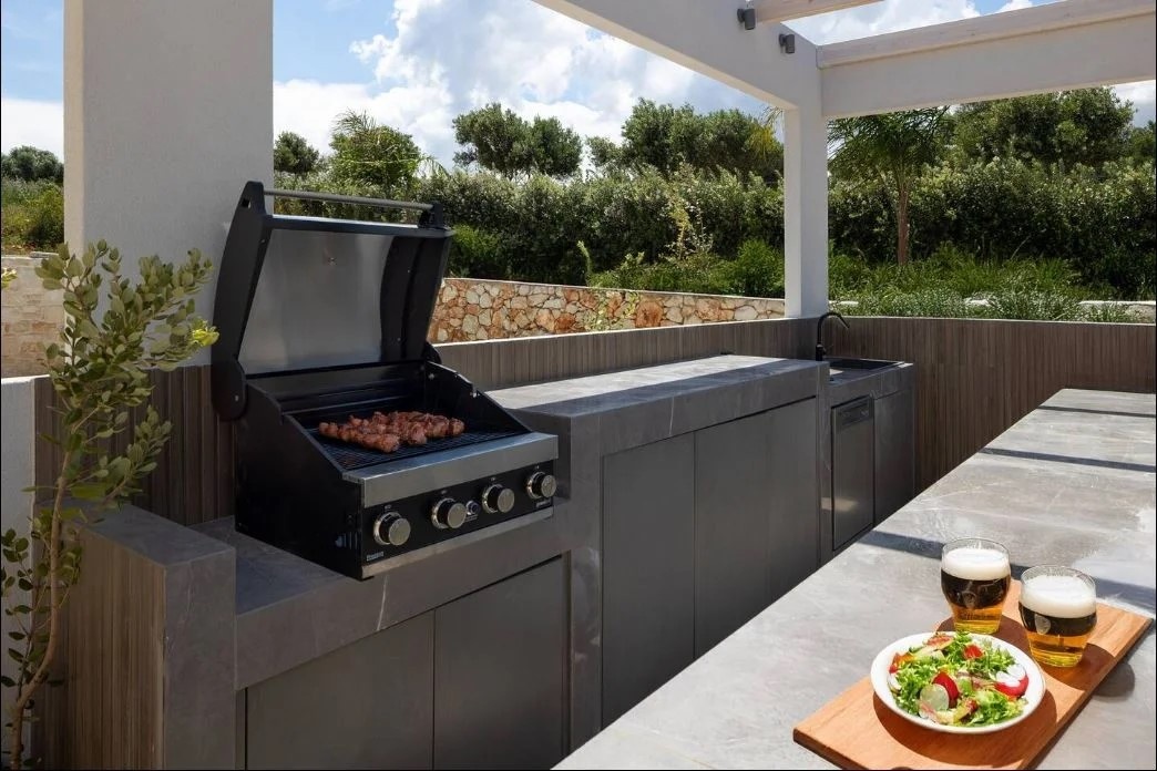 Designed for effortless outdoor living, the property features a spacious terrace with a large private swimming pool that stretches toward the horizon. The outdoor area includes a covered dining space and a fully furnished outdoor kitchen complete with a BBQ, sink, and preparation area, ideal for enjoying meals al fresco.