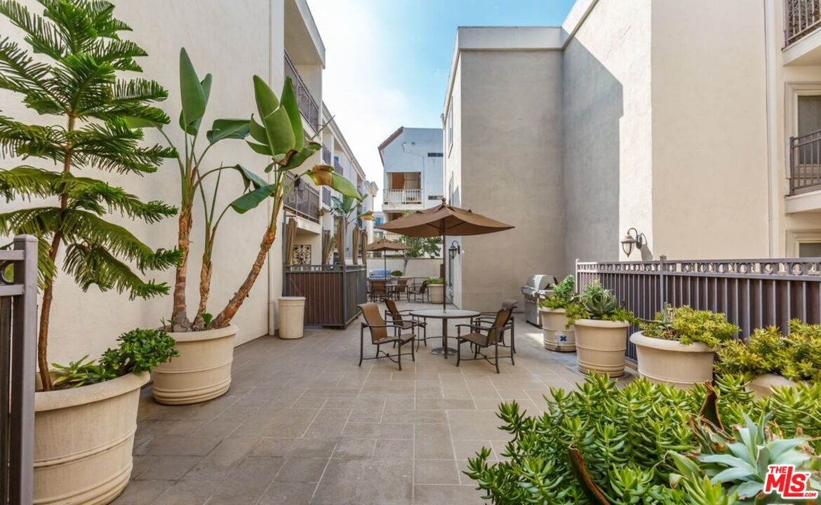 Designer Remodeled condo with incredible flow & views of treetops throughout. Centrally located sophisticated & modern building has state-of-the-art gym, resort-like pool, BBQ area w/outdoor dining & video controlled access. Bright & huge living & dining areas flow for roomy, comfortable everyday living & is ideal for entertaining. There is a huge breakfast bar opening to the updated kitchen, custom Seagrass wallpaper, white stone tiled fireplace & sliding door opening to the balcony, which looks out to the peaceful residential tree-lined street. Gracious primary ensuite has enormous custom walk-in closet + 2nd closet & wall to wall windows. Updated primary ensuite bathroom has thick Carrera Marble countertop. Updated 2nd full bathroom has custom banana leaf wallpaper, Carrera Marble countertop & rain showerhead. The spacious 2nd bedroom has tons of natural light & easy access to the hall bathroom. This unit has it all! In unit washer/dryer combo, central AC & heat, recessed lights w/dimmers throughout, double pane windows, new Vandyck hardwood flooring throughout, Plantation Shutters, Wainscoting, 2 parking spaces in secure garage, great storage & water & gas paid for by owner. Both bathrooms have Terrazzo tiled floors & glass tiled showers. Located in the heart of LA, blocks from Cedars-Sinai, hip shops, cafes & restaurants! Central location is close to Beverly Hills, the Westside & West Hollywood, making it ideal for LA living. Great opportunity to live in an updated & stylish unit, within a modern building with amenities, in one of the best & walkable neighborhoods in LA!