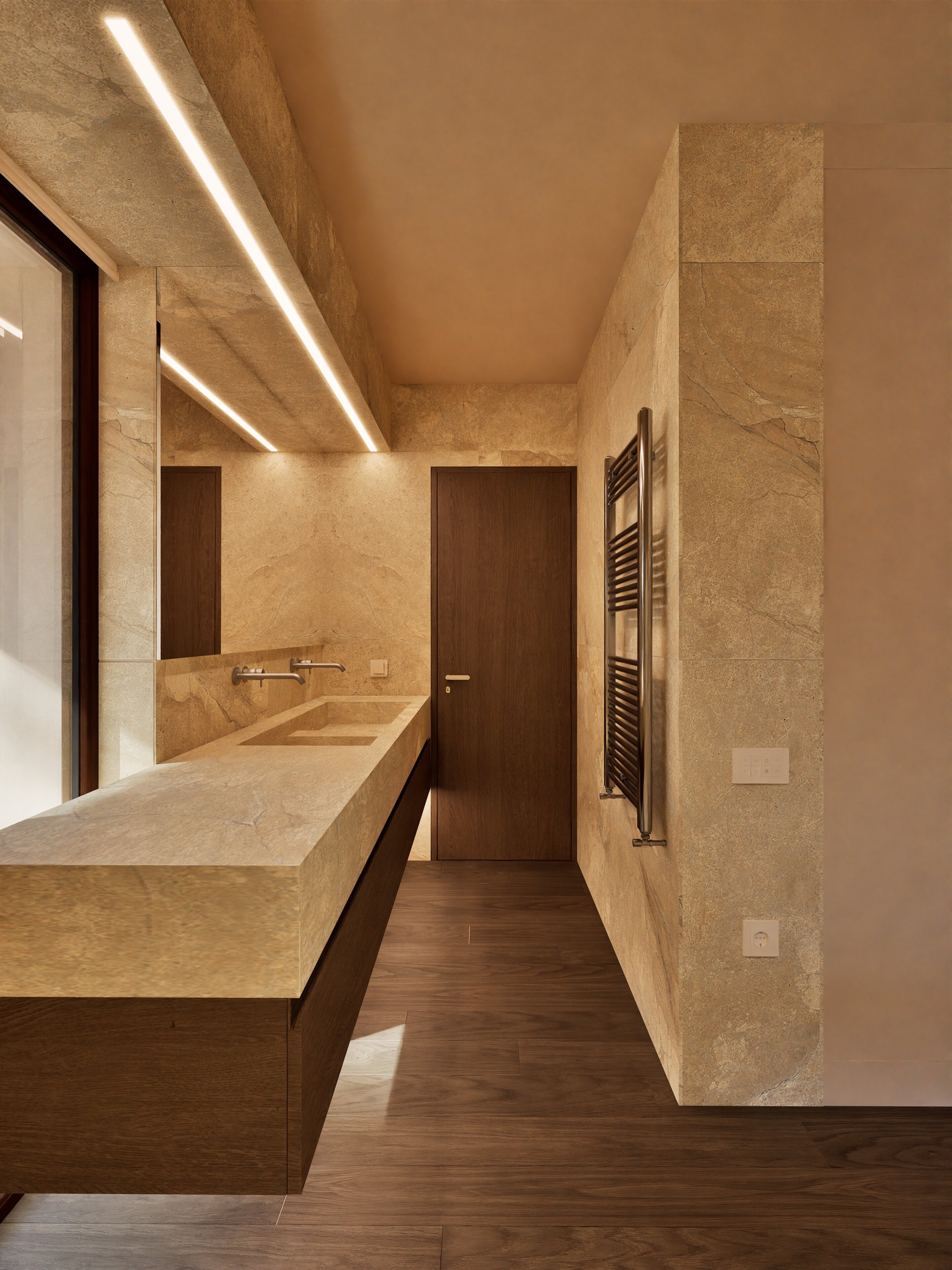 The ground floor hosts the extra spacious double-ceiling (5.5m height) living room & dinning room (69.03 m2), the kitchen area (27.85 m2) as well as the WC and the elevator & stairways units.