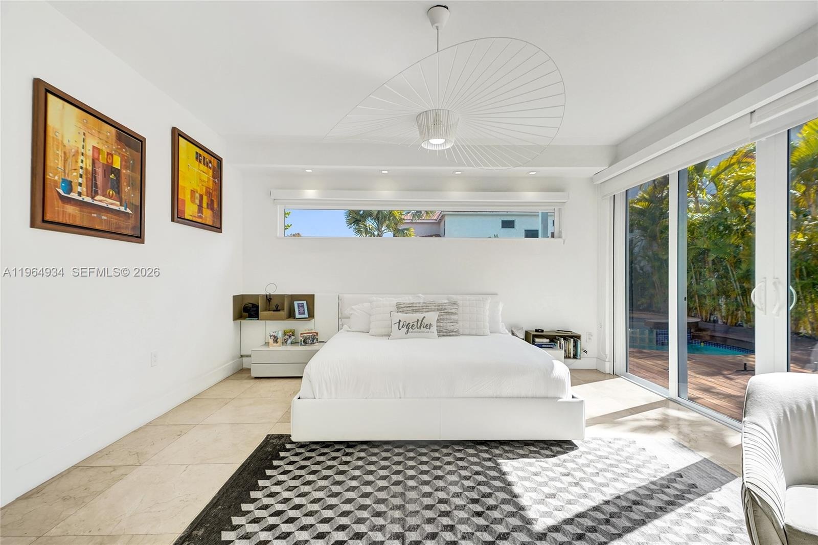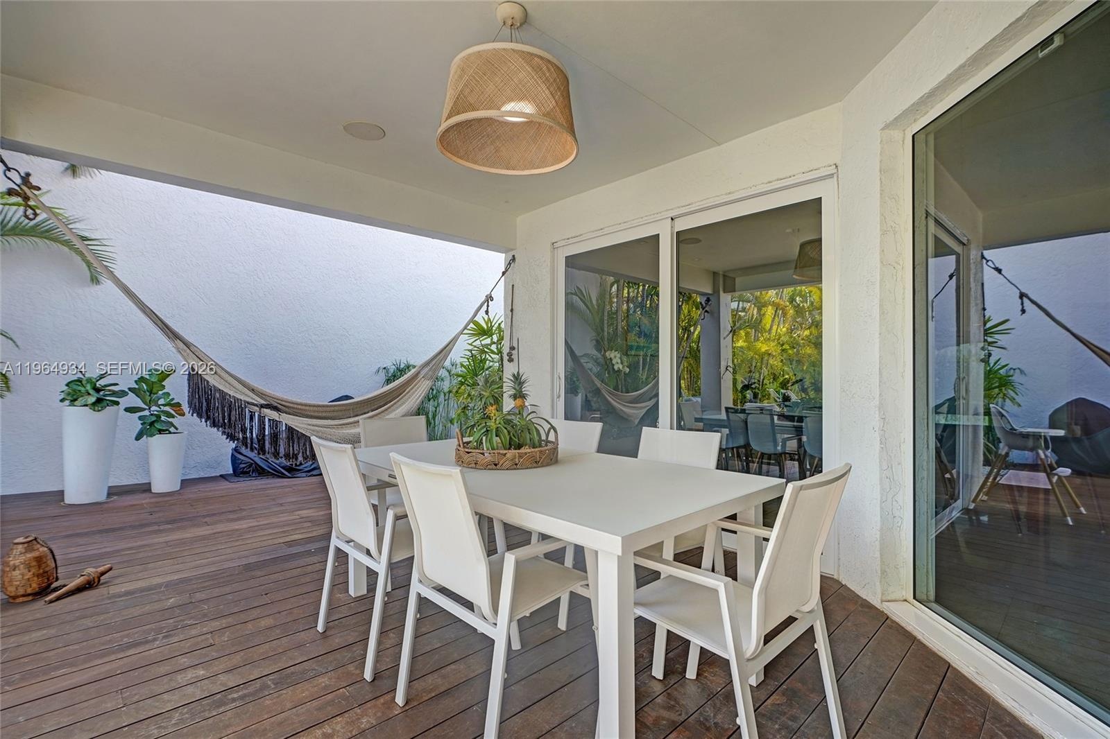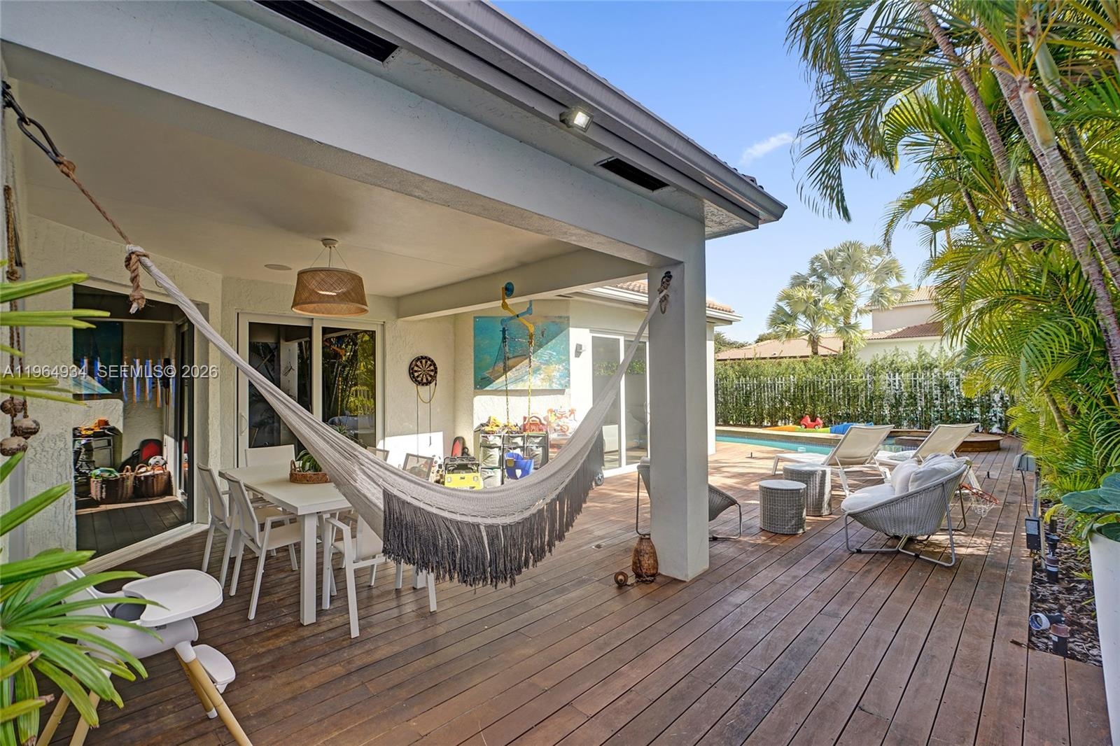 The indoor-outdoor flow leads to a private backyard with a wood deck, pool, and jacuzzi, creating the perfect South Florida lifestyle setting.