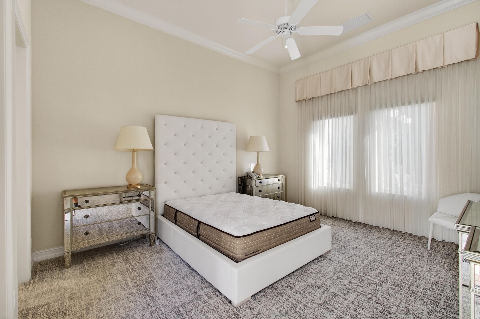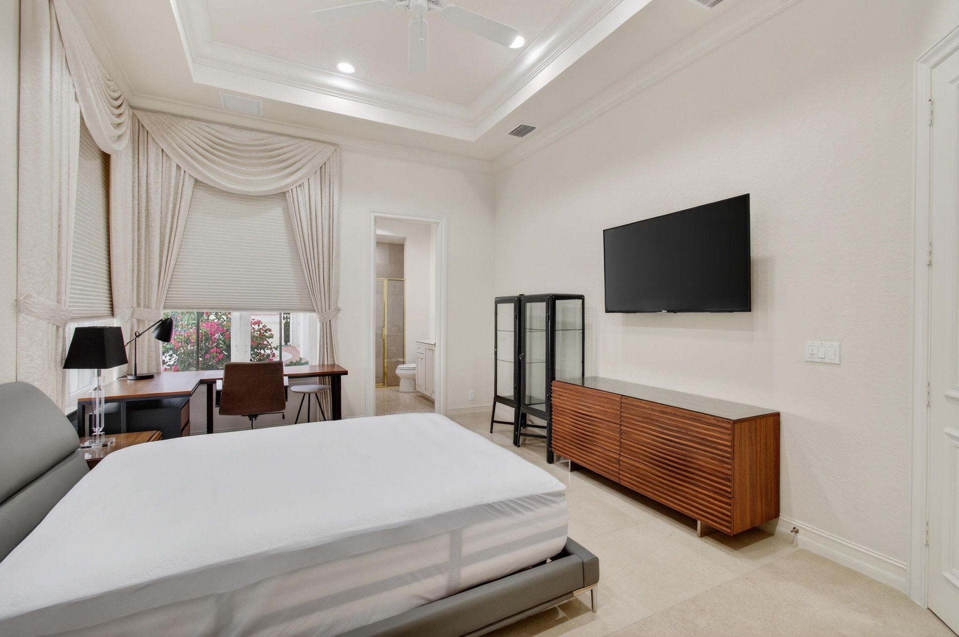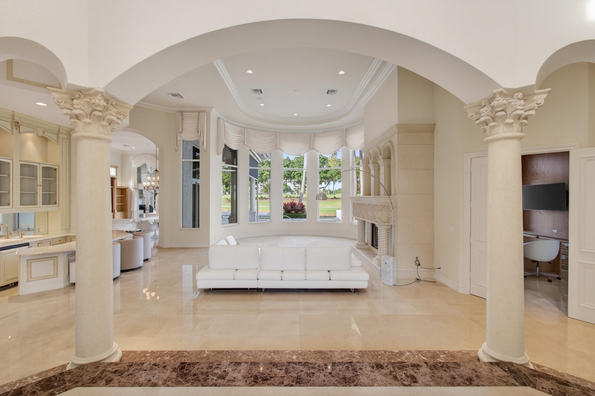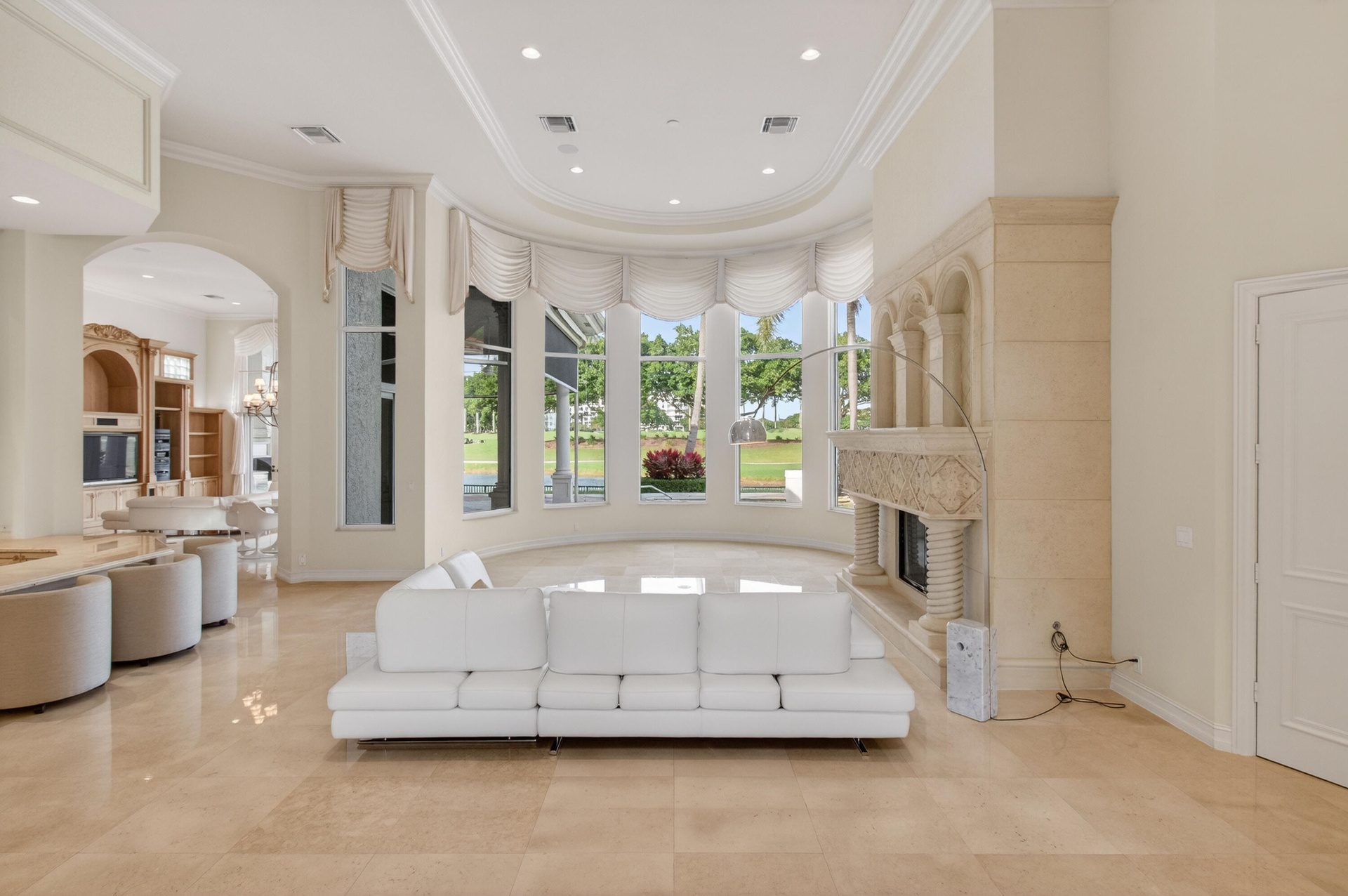 The property features five bedrooms, including four en-suite guest rooms, as well as a private guest house, gym, office/retreat, a four-car garage, and a gated private entrance. High ceilings and a thoughtfully designed floor plan create a seamless flow throughout the home, complemented by expansive golf course and lake views that define luxury living in Boca Raton. The primary suite is ideally positioned to capture sweeping views of the manicured grounds and lake, and includes an indulgent spa-style bathroom with separate vanities, dual showers, soaking tub, water closets, and generous walk-in closets. The richly finished hardwood-paneled office offers a quiet sanctuary separate from the main living areas.