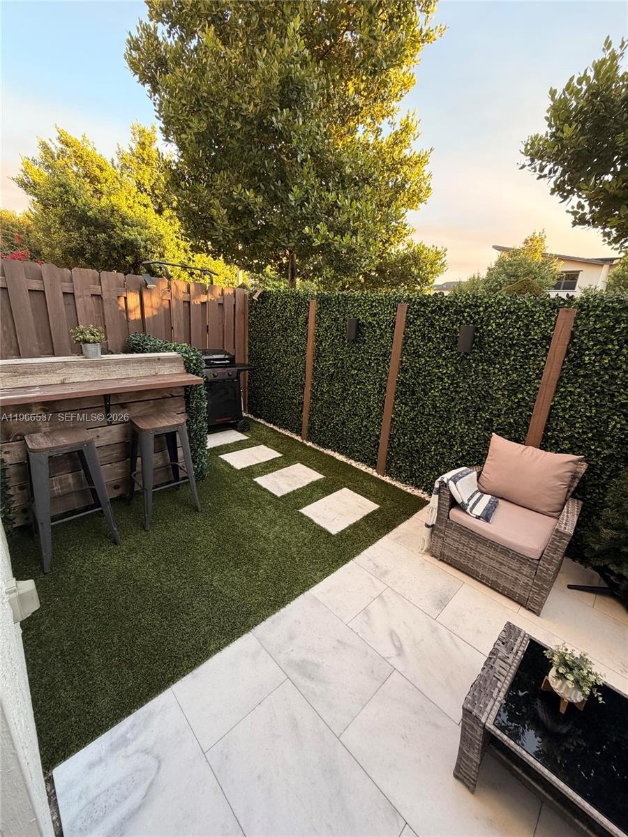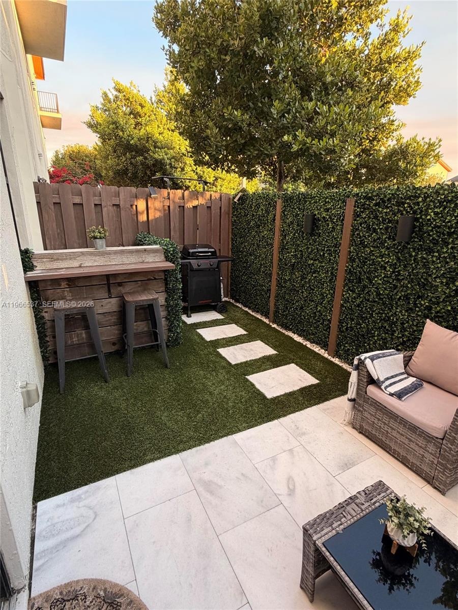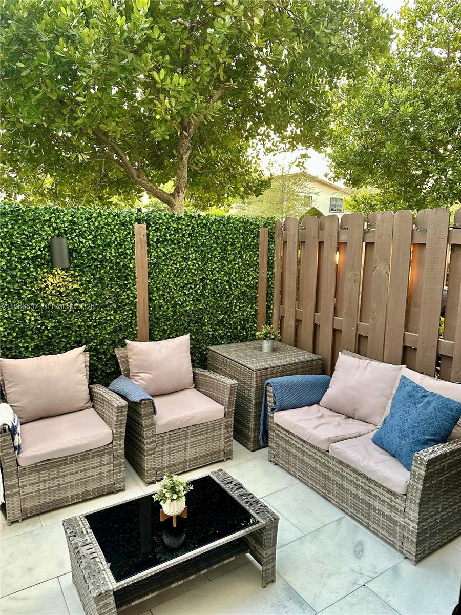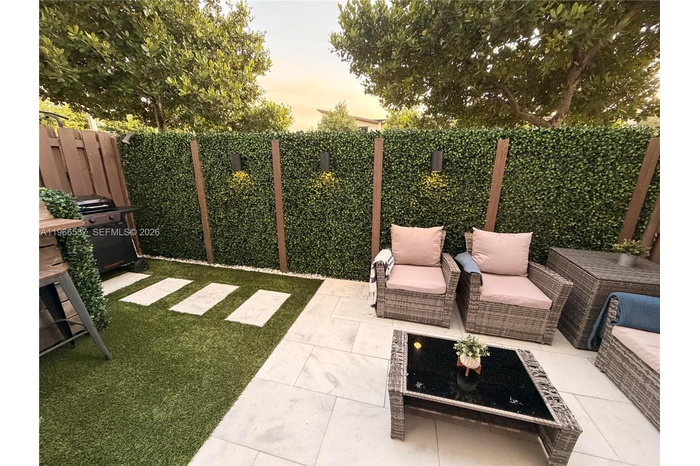 Recently renovated private patio designed as a comfortable outdoor living space for relaxing or hosting guests. Residents enjoy access to the Grand Central Clubhouse with resort-style amenities including fitness center, sauna, resort pool, kid's splash pool, tennis and basketball courts, and social/event rooms.