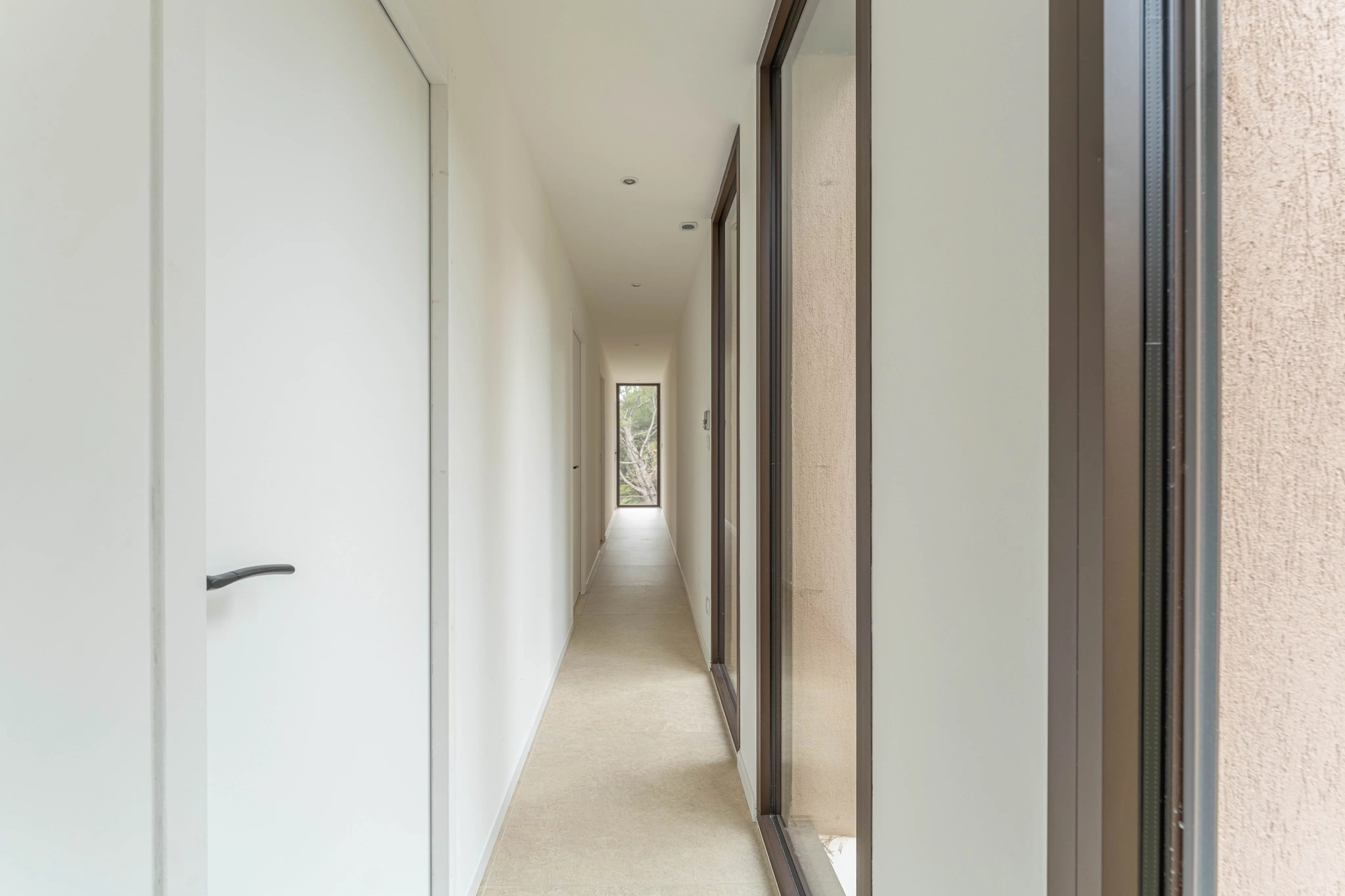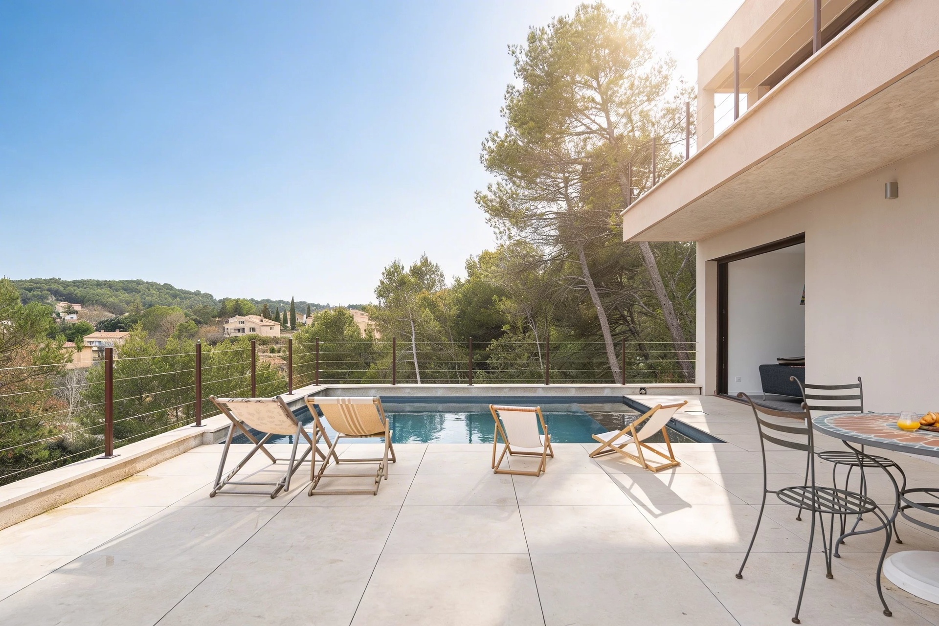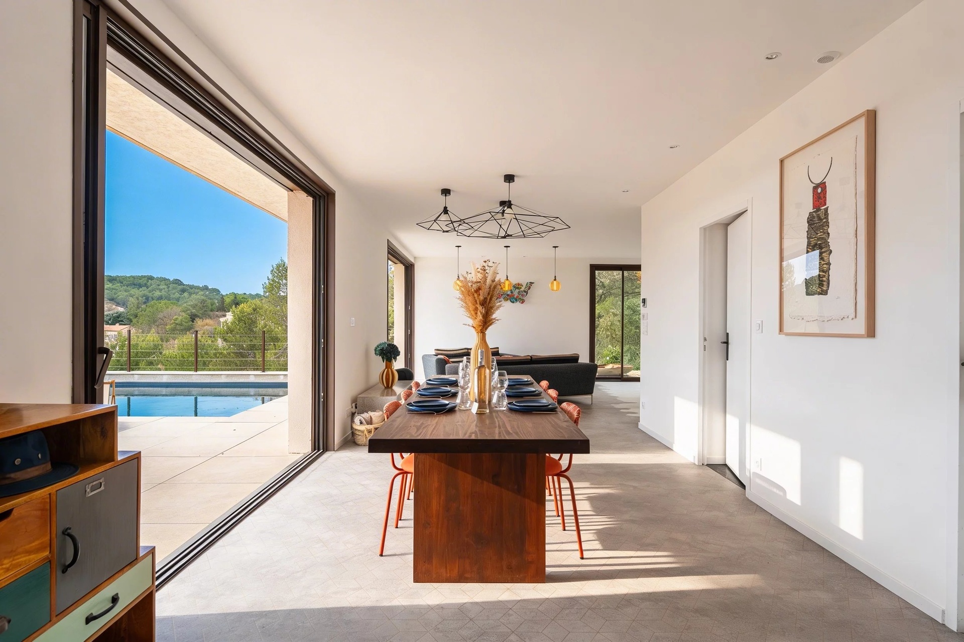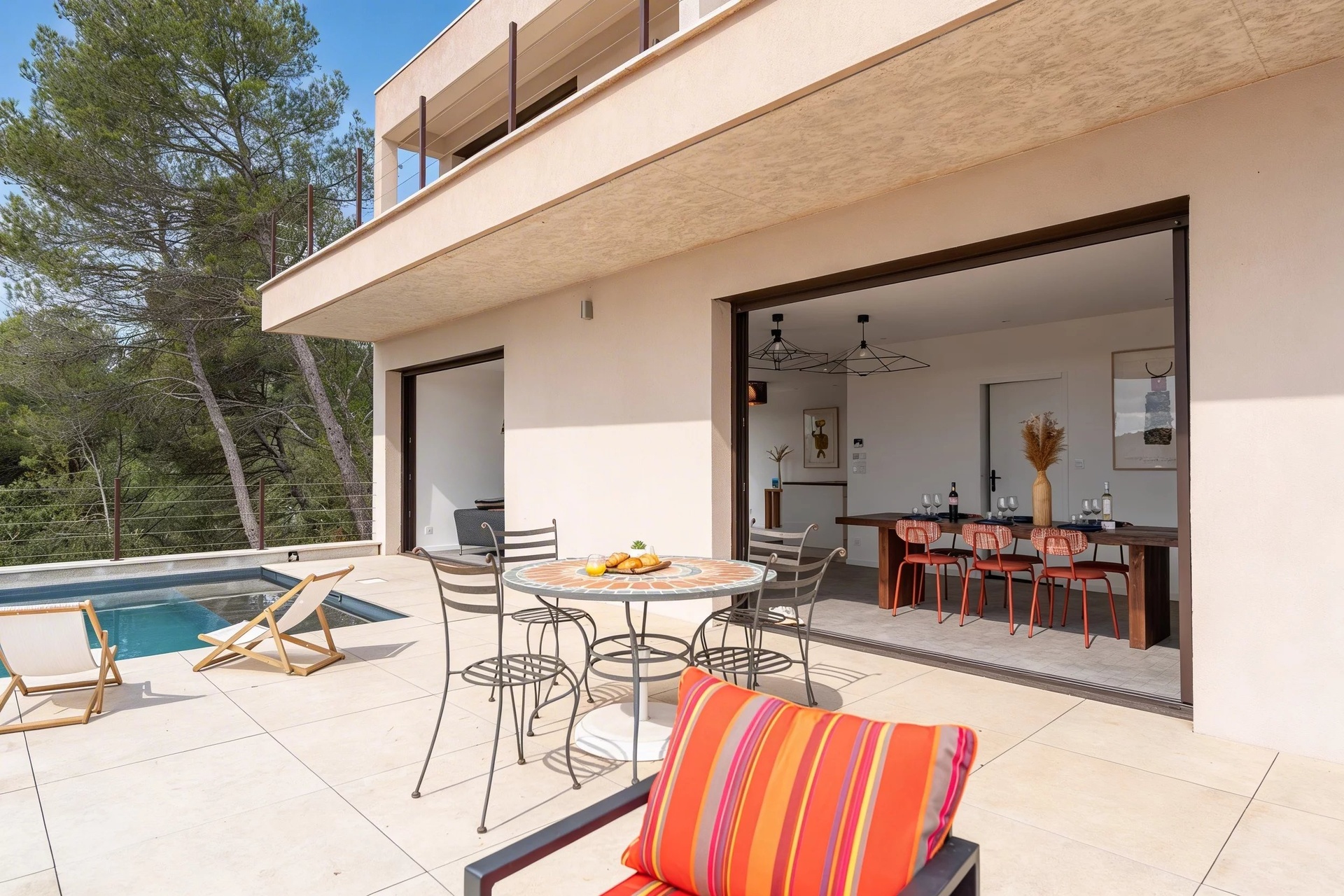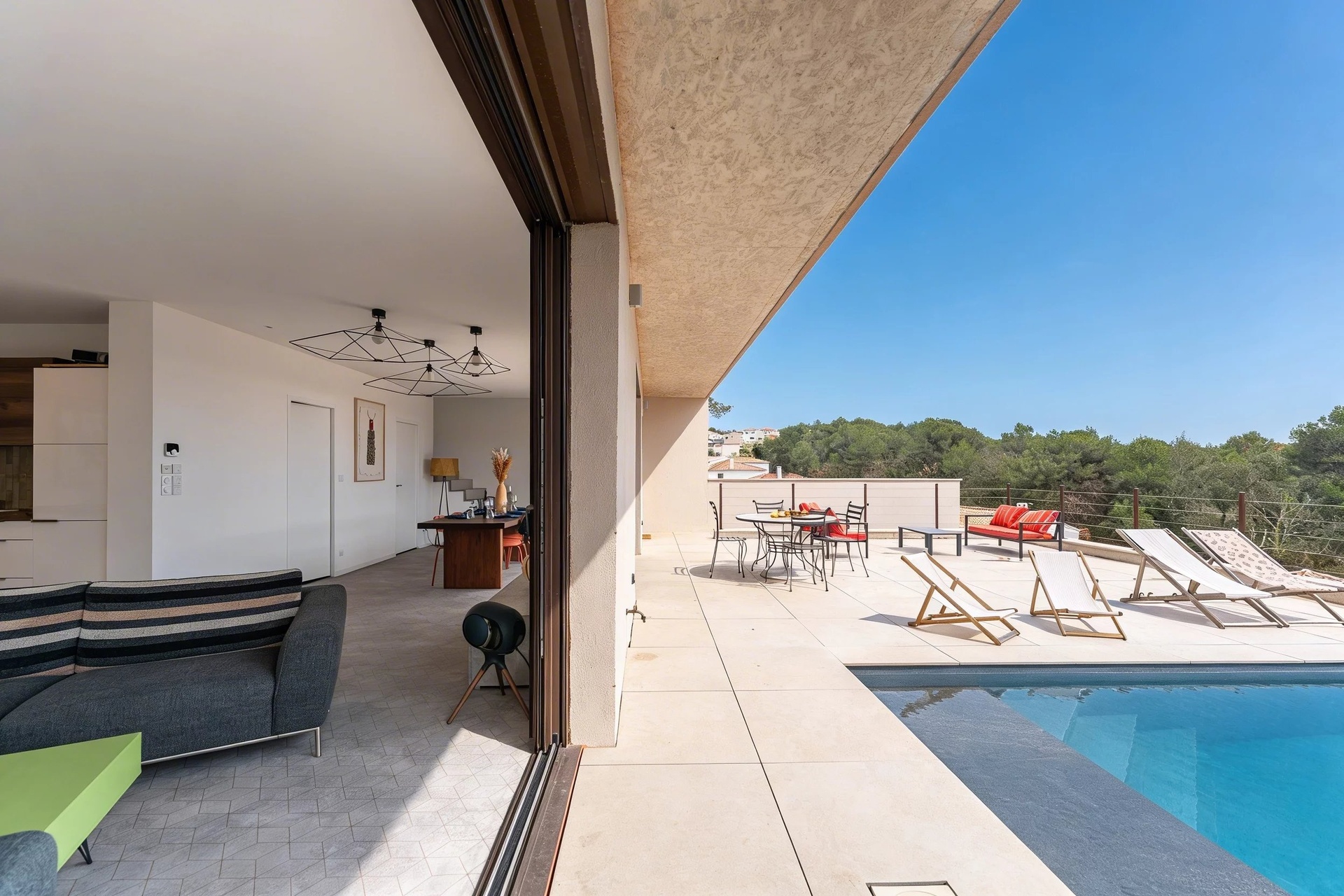From the moment you enter, the ground floor impresses with its generous volumes and fluid layout. Large pocket sliding glass doors blur the boundary between indoor and outdoor spaces, creating a seamless connection to the south-facing terrace and swimming pool, as well as to the pine forest to the west.
