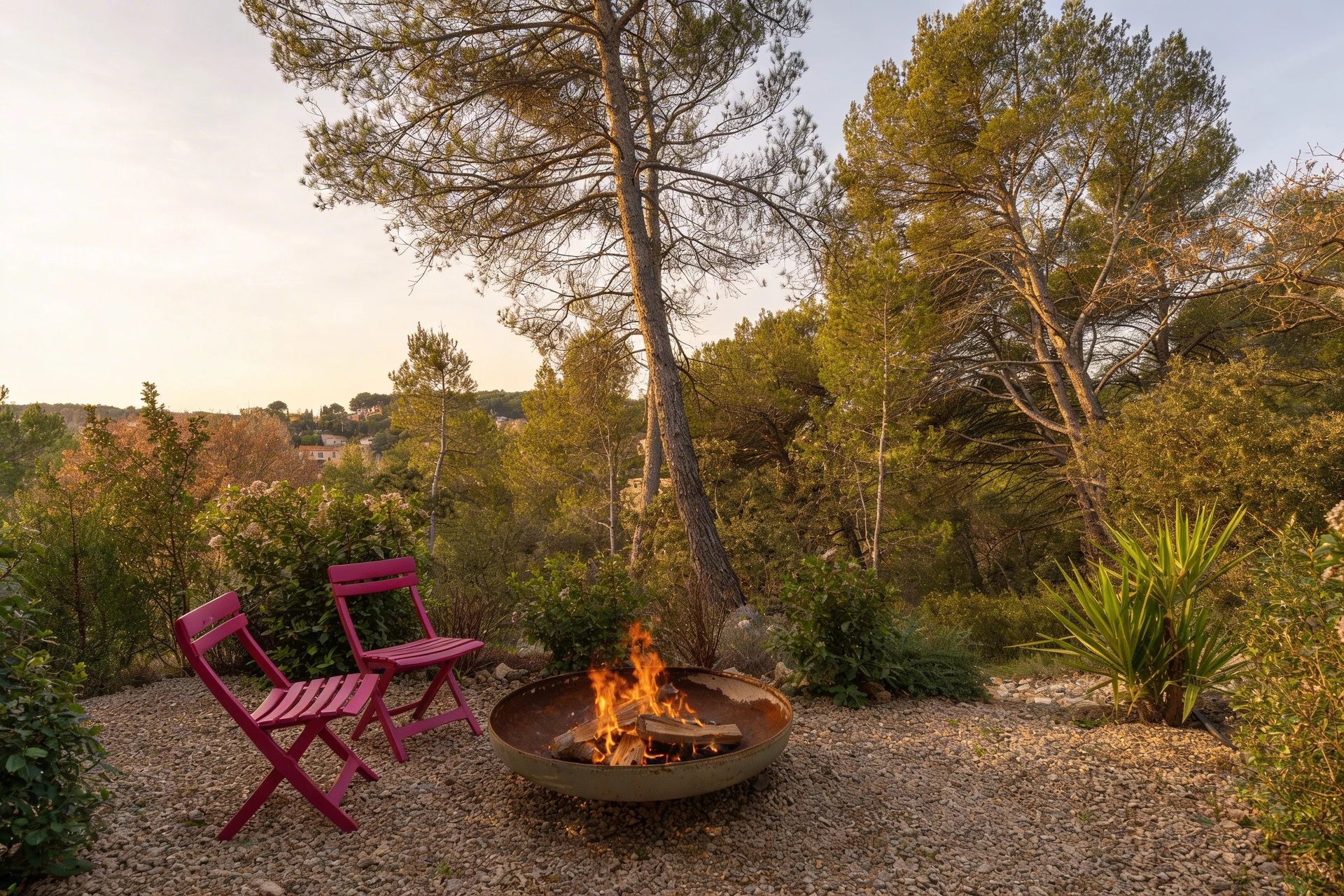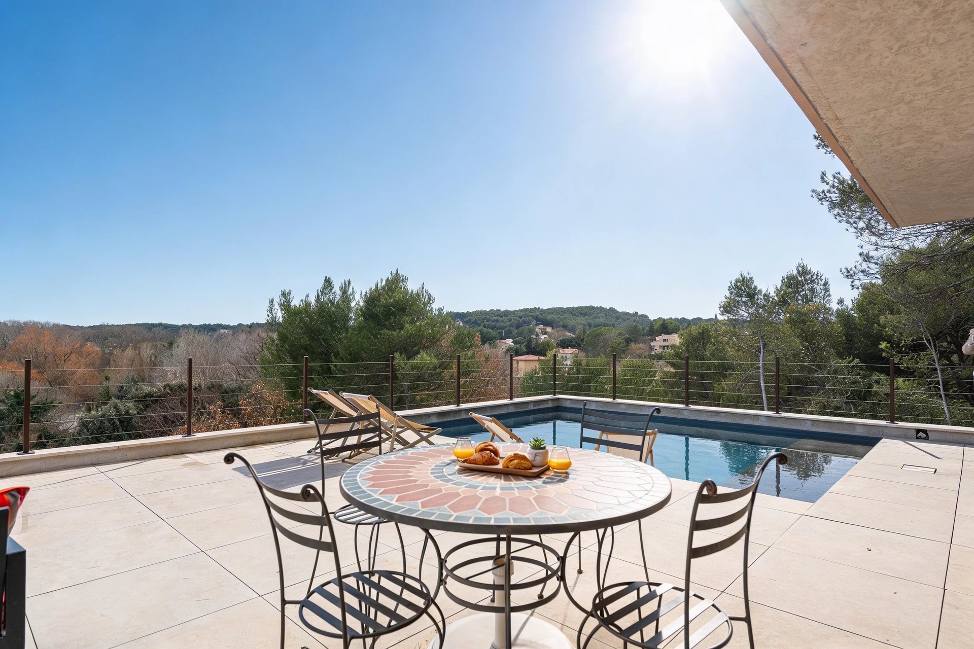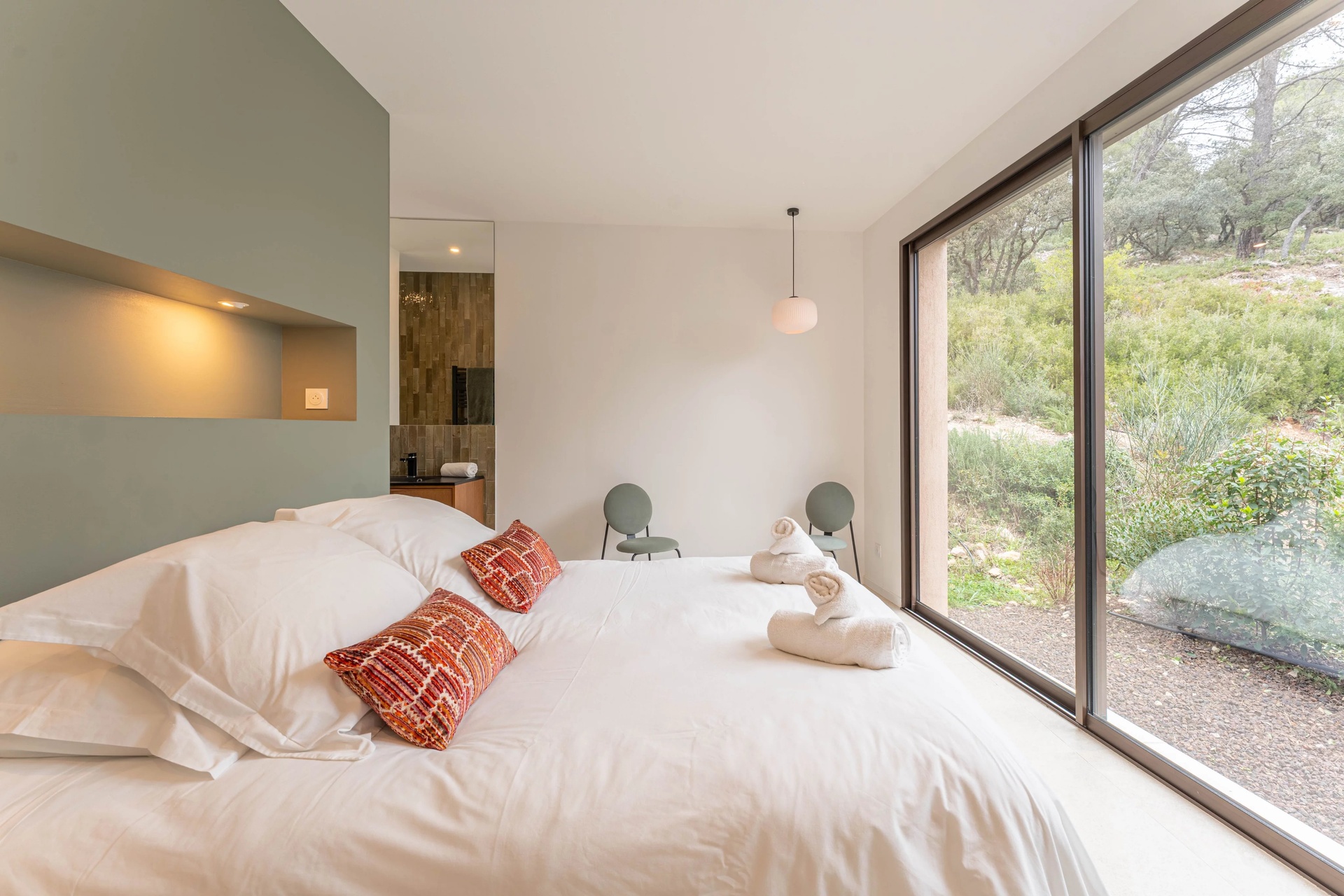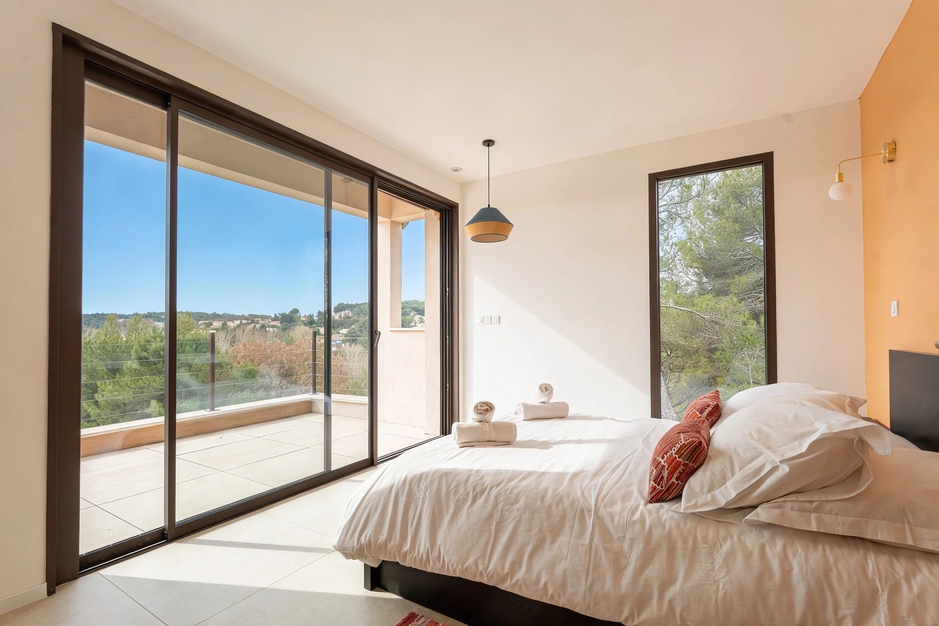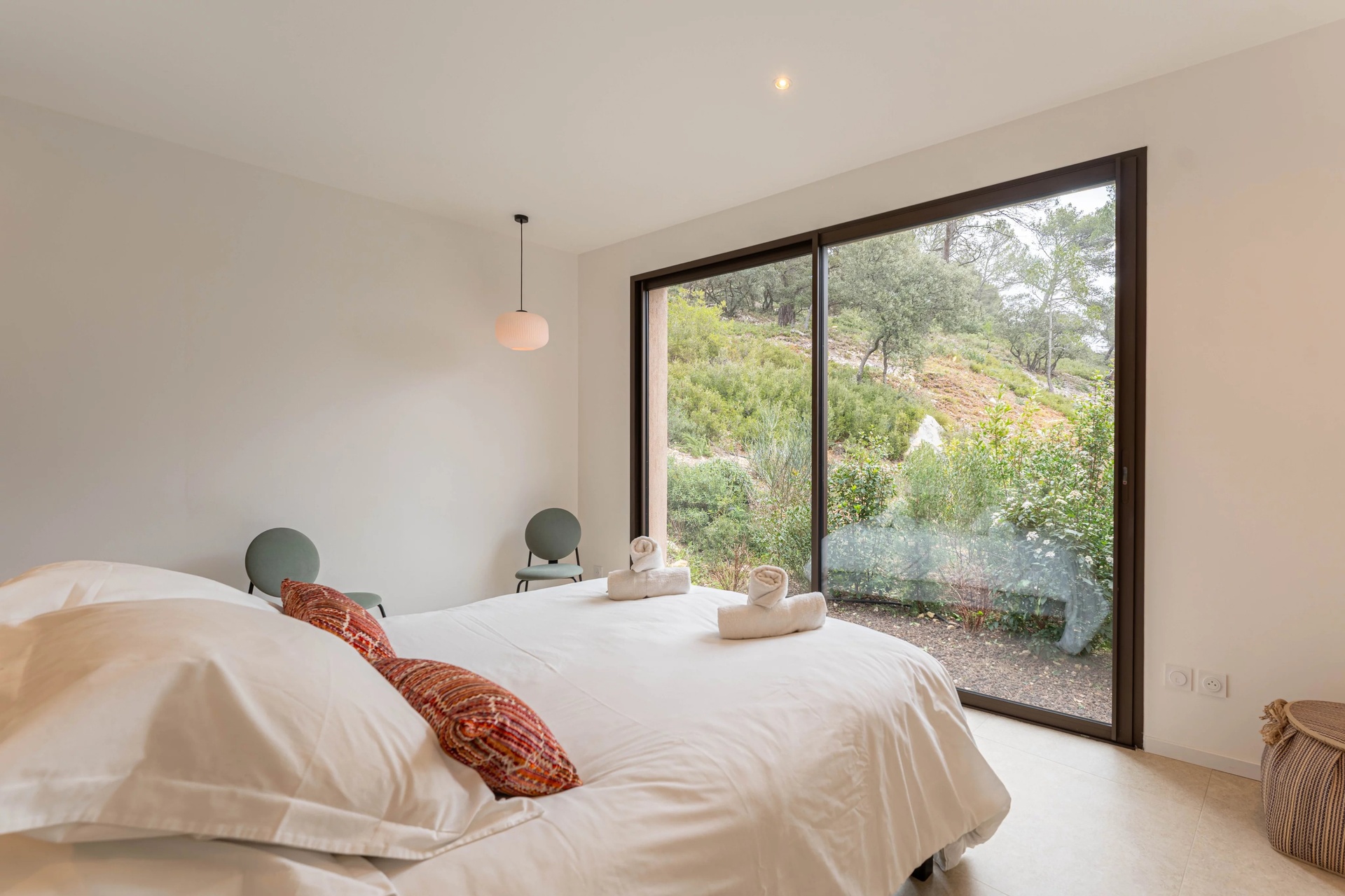 The south-facing bedrooms benefit from panoramic views over the countryside, while the master suite enjoys dual east-west exposure, offering a peaceful and intimate atmosphere overlooking the garrigue and the forest.