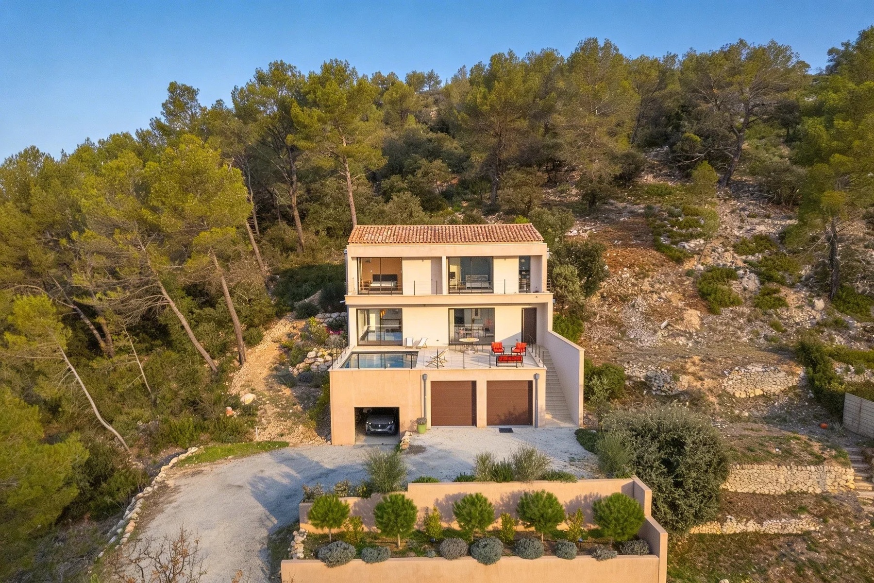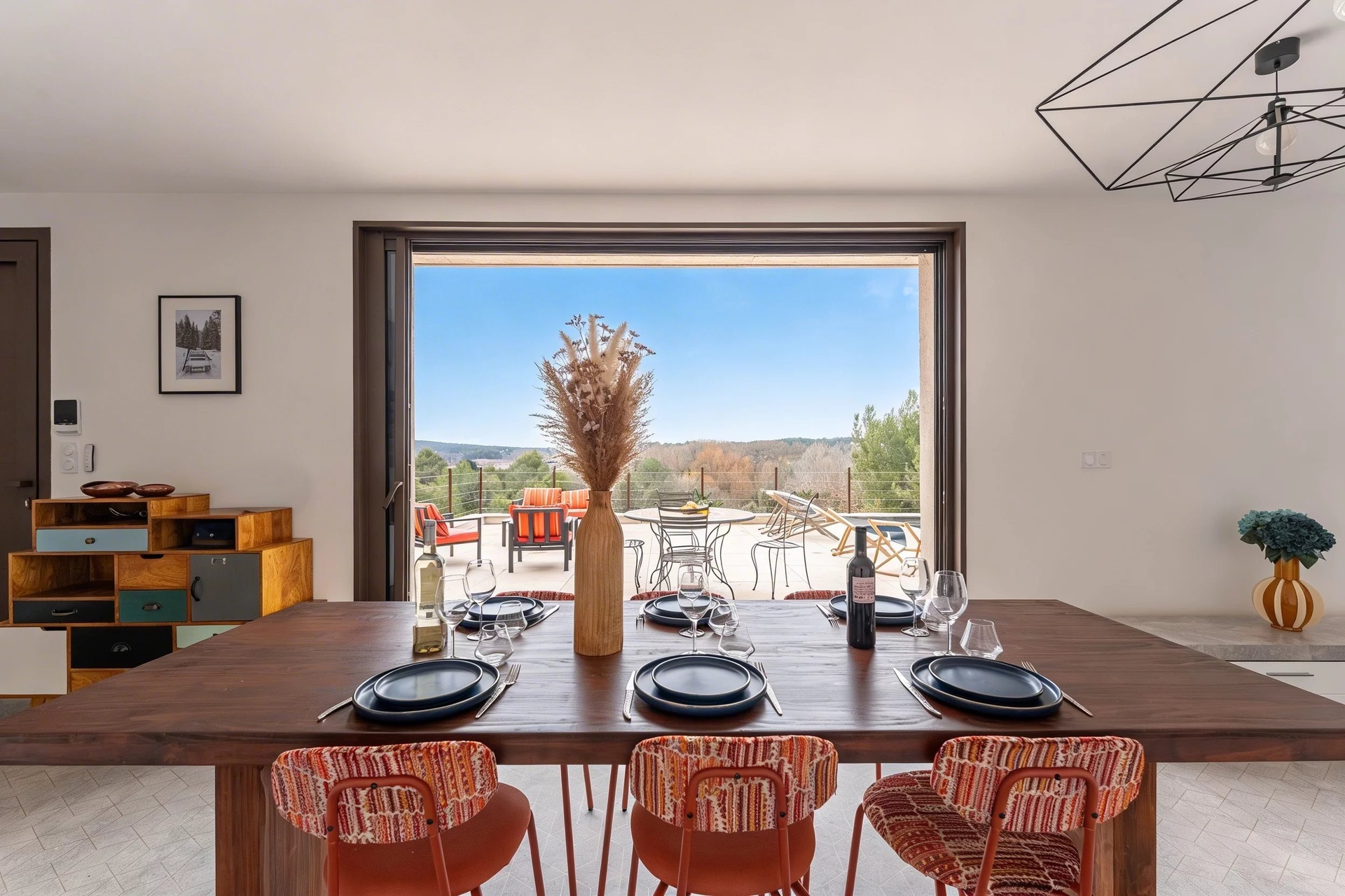 De Ferla presents for sale a magnificent contemporary villa built in 2025, ideally located in a dominant position on the heights of Rognes, in the heart of the sought-after Pie Fouquet estate. This new 170 sqm architect-designed home embodies a rare lifestyle, combining architectural elegance, modern comfort, and immersion in the Provençal countryside.