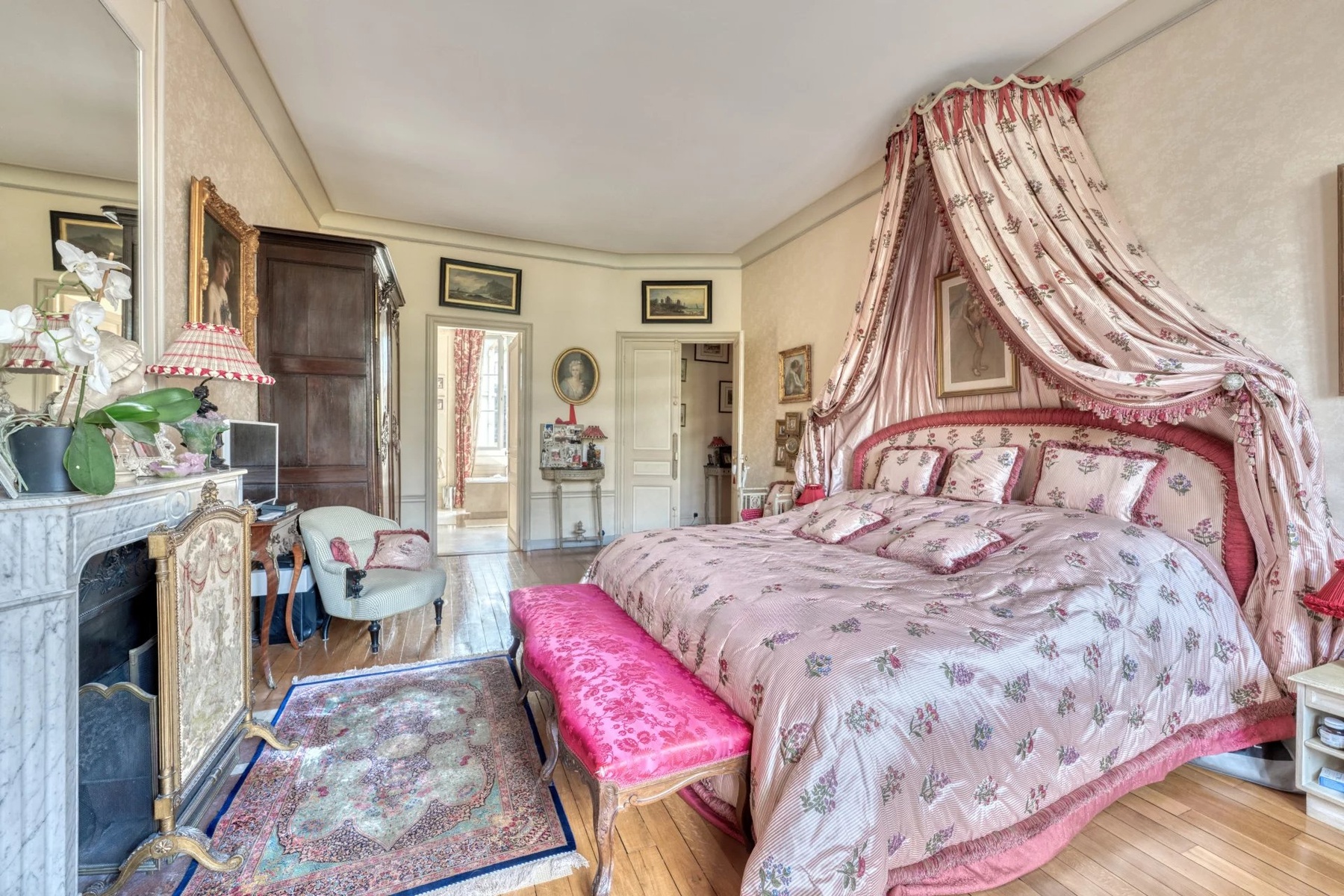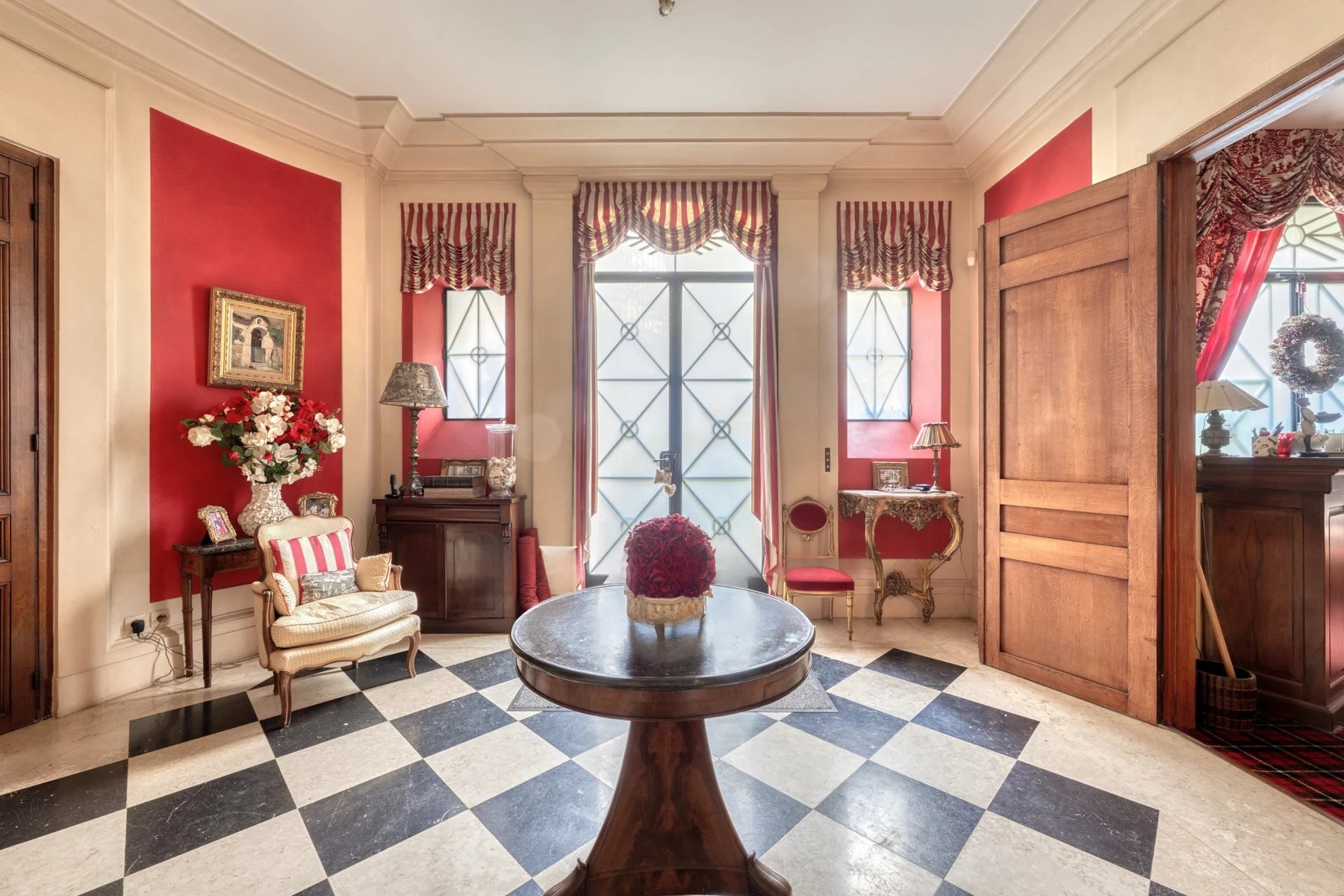 The garden-level entrance leads to a vast family kitchen opening onto the exterior, a billiard room and service areas, all linked by a freestone staircase. The upper levels feature superb reception rooms with preserved decorative features, as well as a master suite and several spaces that can be used as bedrooms or offices. The top floor offers further bedrooms, storage space, a workshop and direct access to the roof terrace.