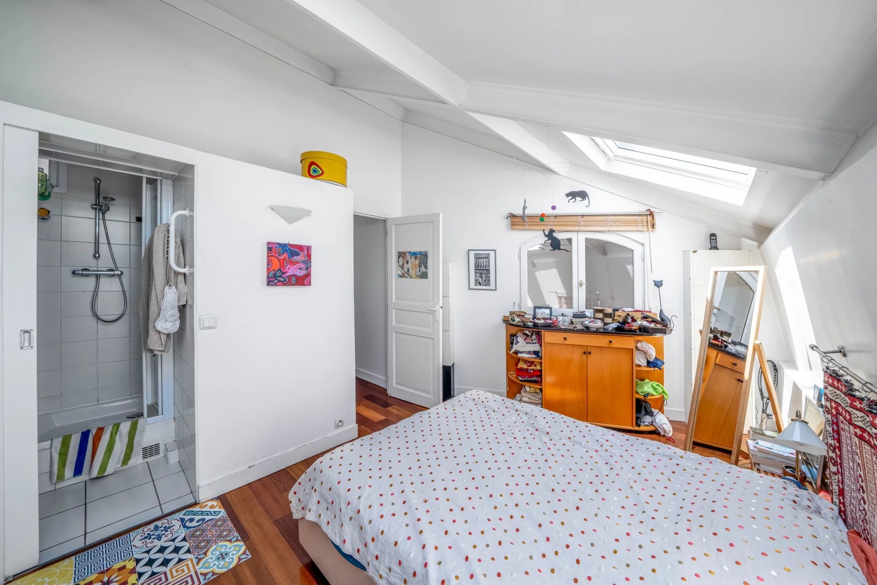 Mairie du 14ème : Rooftop on the top two floors of an old building with an elevator. This exceptional 165m2 property (155m2 carrez) comprises, on the first level, an entrance hall, an independent fitted and equipped kitchen, a 56m2 living room with 6m high ceilings opening onto a terrace, a bedroom, a laundry room, a separate toilet and plenty of storage space. Upstairs, four additional bedrooms, including a master suite with en-suite shower room, bathroom and separate toilet. And two roof terraces for a total of 36m2 with no overlooking views over the rooftops of Paris and the Eiffel Tower. Exceptional, calm and bright loft with triple exposure and unobstructed view over the rooftops of Paris.