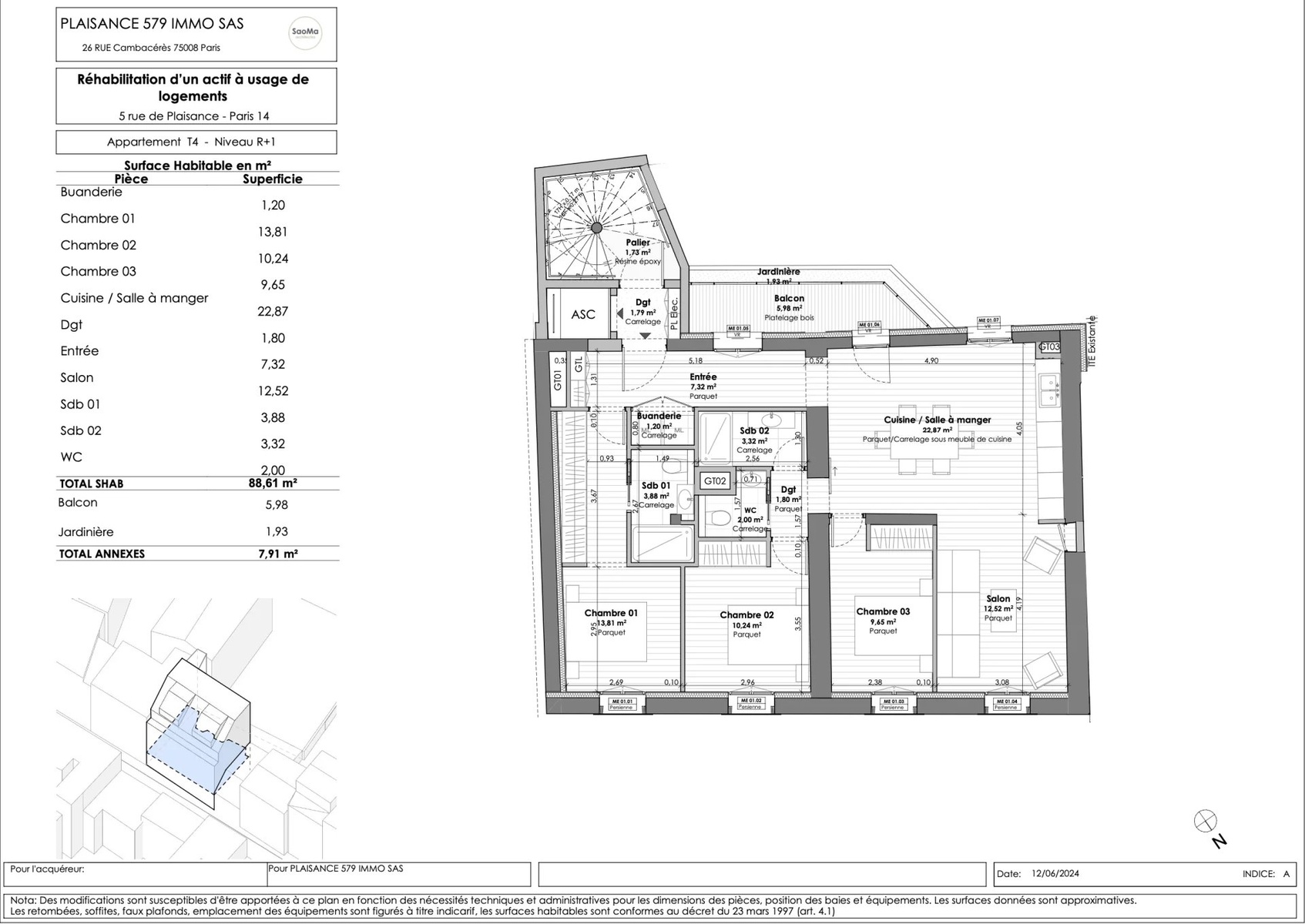 VIR (Vente d'Immeuble à Rénover): On the 1st floor with elevator of a renovated old building of very good standing, a stone's throw from the Pernety metro station, in the heart of a shopping district, a 96.30 m2 Carrez law four-room apartment comprising an entrance hall, a living room, an open-plan fitted and equipped kitchen opening onto a balcony, a laundry room, three bedrooms, two bathrooms and a separate toilet. Large bicycle/stroller room on ground floor and cellars accessible by elevator in basement. Liberal professions permitted. All the charm of the old with the advantages of modern construction. Creation of outdoor and planted spaces, contributing to the quality of the homes, urban refreshment and plant continuity.