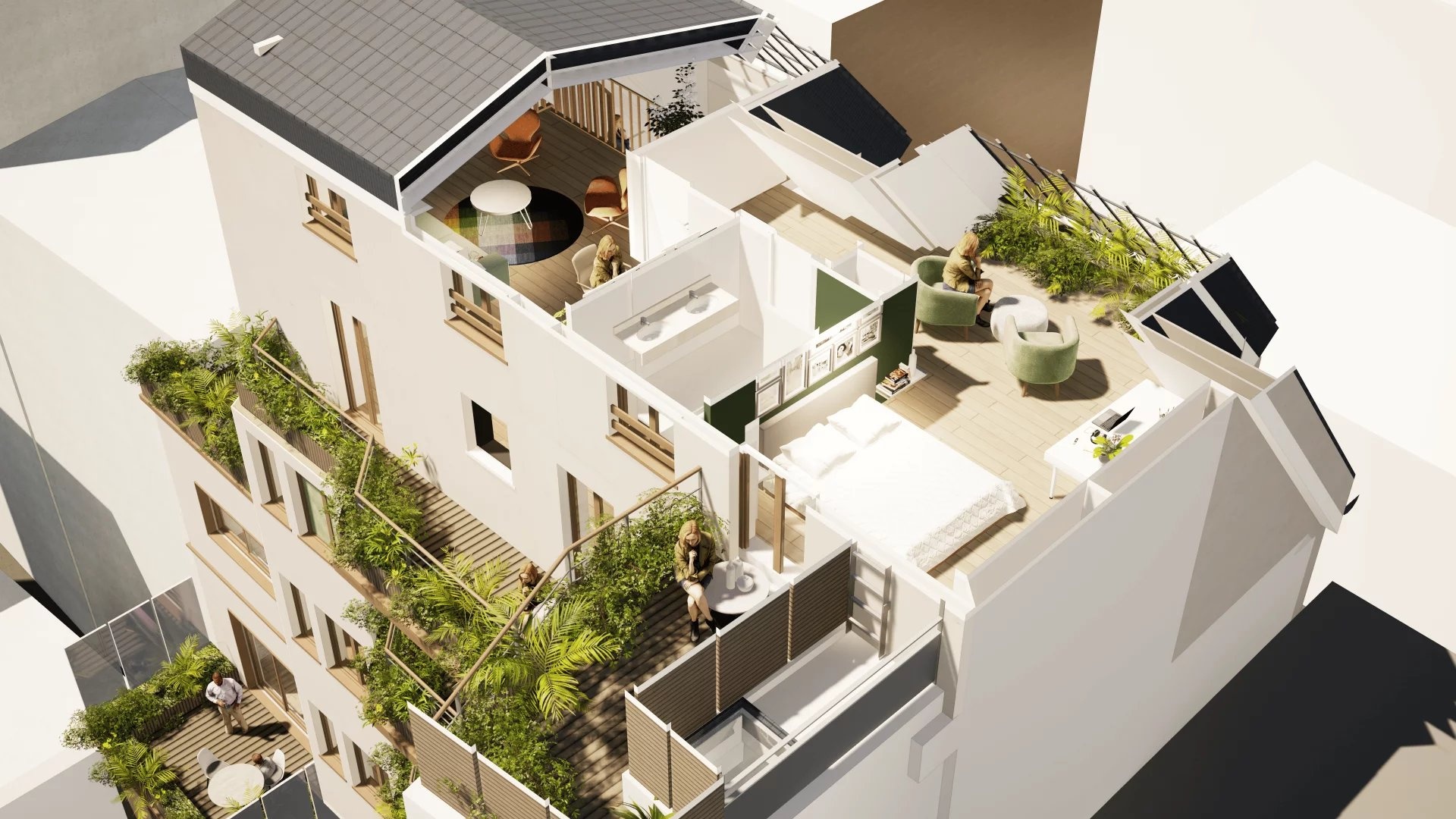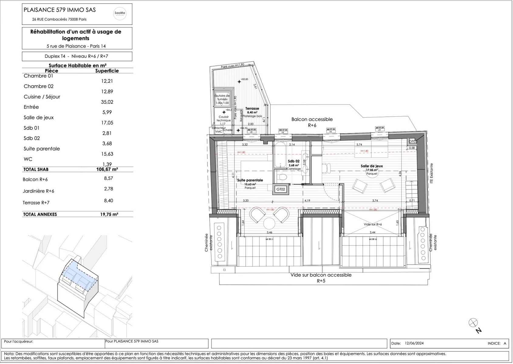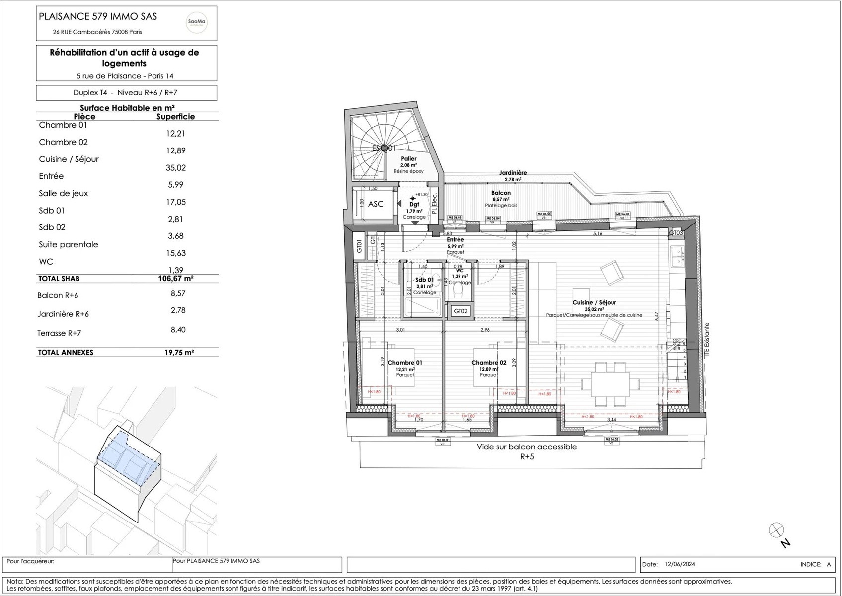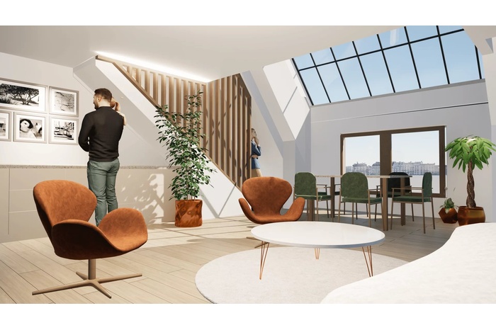 VIR (Vente d'Immeuble à Rénover): On the 6th, 7th and last floor with elevator of a renovated old building of very good standing, a stone's throw from the Pernety metro station, in the heart of a shopping district, a five-room duplex apartment of 133.55 m2 loi Carrez. On the 6th floor, this property comprises an entrance hall, a vast 35 m2 living room opening onto a 9 m2 balcony/terrace, an open-plan fitted and equipped kitchen, a laundry room, 2 bedrooms, a shower room and a separate toilet. On the 7th and top floor: a vast master suite with living area and bathroom opening onto a south-west-facing terrace, and a second living area of almost 20 m2. Quiet, light-filled apartment, with large skylights illuminating the various rooms. Large bike/stroller room on ground floor and cellars in basement accessible by elevator. Liberal professions permitted. All the charm of the old with the advantages of modern construction. Creation of outdoor and planted spaces, contributing to the quality of the homes, urban refreshment and plant continuity.