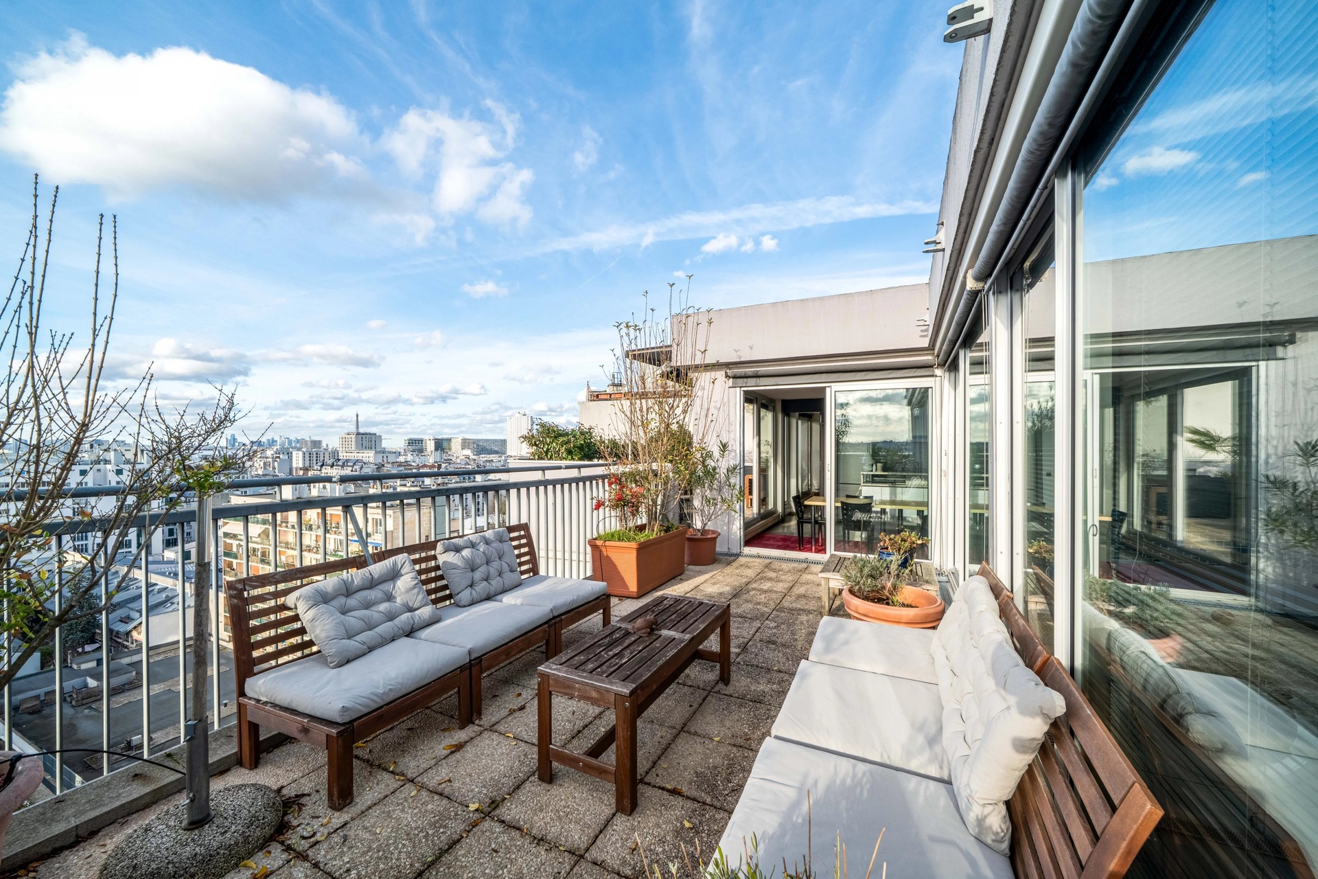 Les extérieurs, rares à cet étage, invitent à profiter pleinement d’un cadre privilégié : repas en plein air, moments de détente, vues dégagées et ensoleillement optimal.