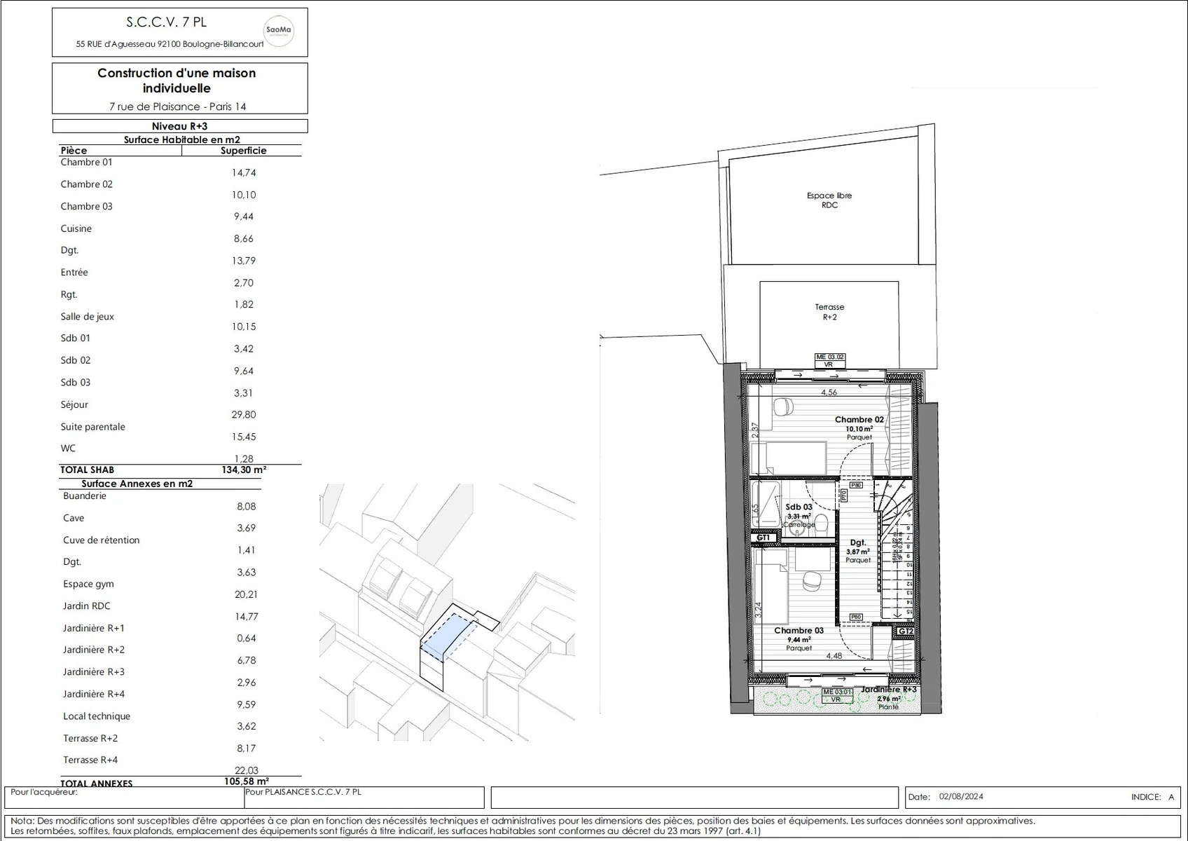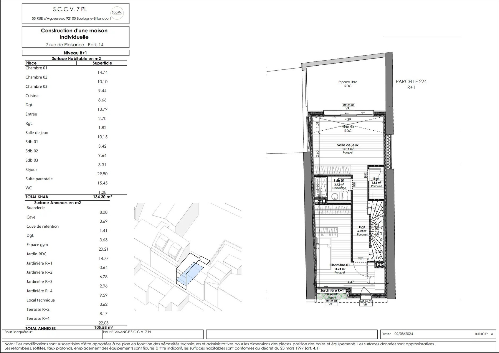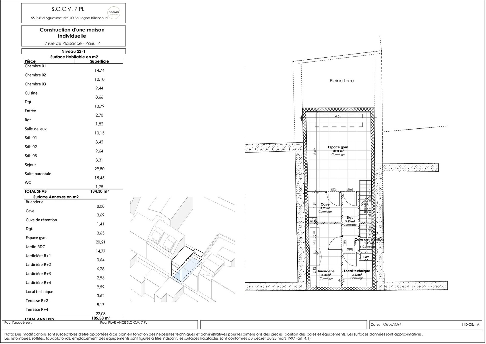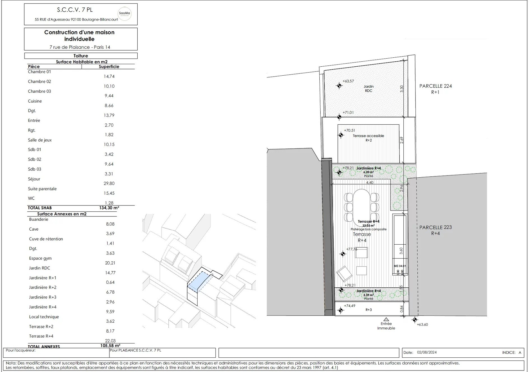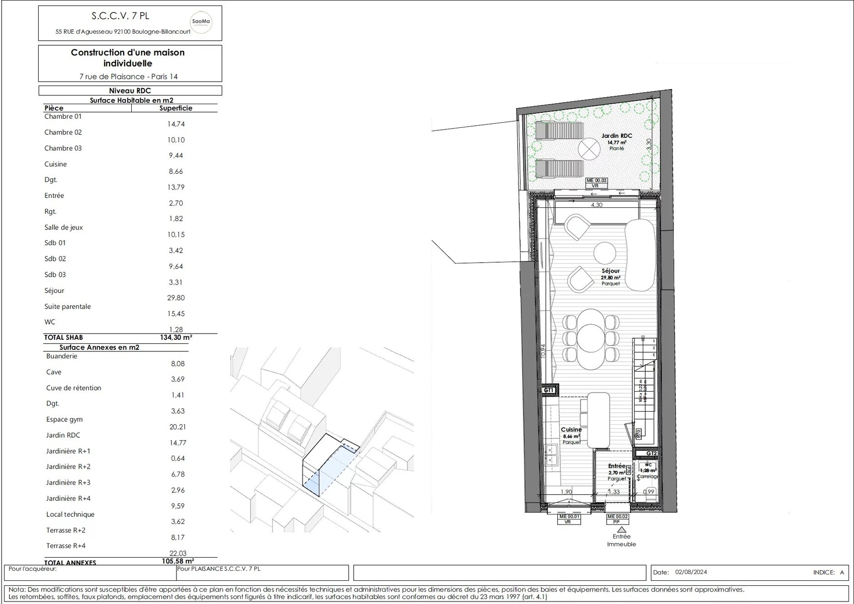 VENTE EN ETAT FUTUR D'ACHEVEMENT In the heart of the XIVth arrondissement of Paris, a modern house on plan of 174.95 m2 composed as follows: Ground floor: entrance hall, large living room opening onto a 15 m2 garden, open-plan fitted and equipped kitchen and WC. Second floor: bedroom, games room or additional bedroom, bathroom with WC and storage space. On the second floor, a master suite with direct access to an 8.15 m2 terrace. On the third floor, two bedrooms, a bathroom with WC and plenty of storage space. On the roof, a 22 m2 terrace surrounded by planters. Finally, in the basement, a 20.20 m2 gym area, a cellar, a laundry room and a machine room. Very quiet and bright. Unobstructed view of the garden. Crossing. Creation of outdoor and planted spaces, contributing to the quality of the homes, urban refreshment and plant continuity. Compliance with RE2020 environmental regulations. ECD A expected, given the project's intrinsic features and qualities. External shading for climate control and thermal comfort in summer