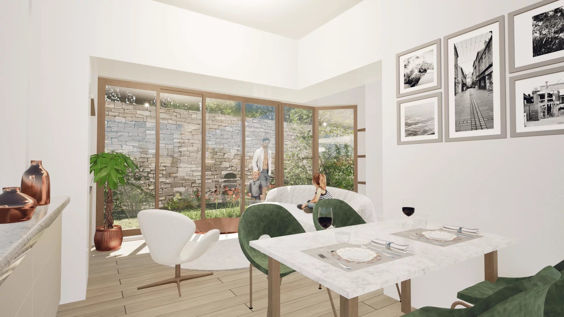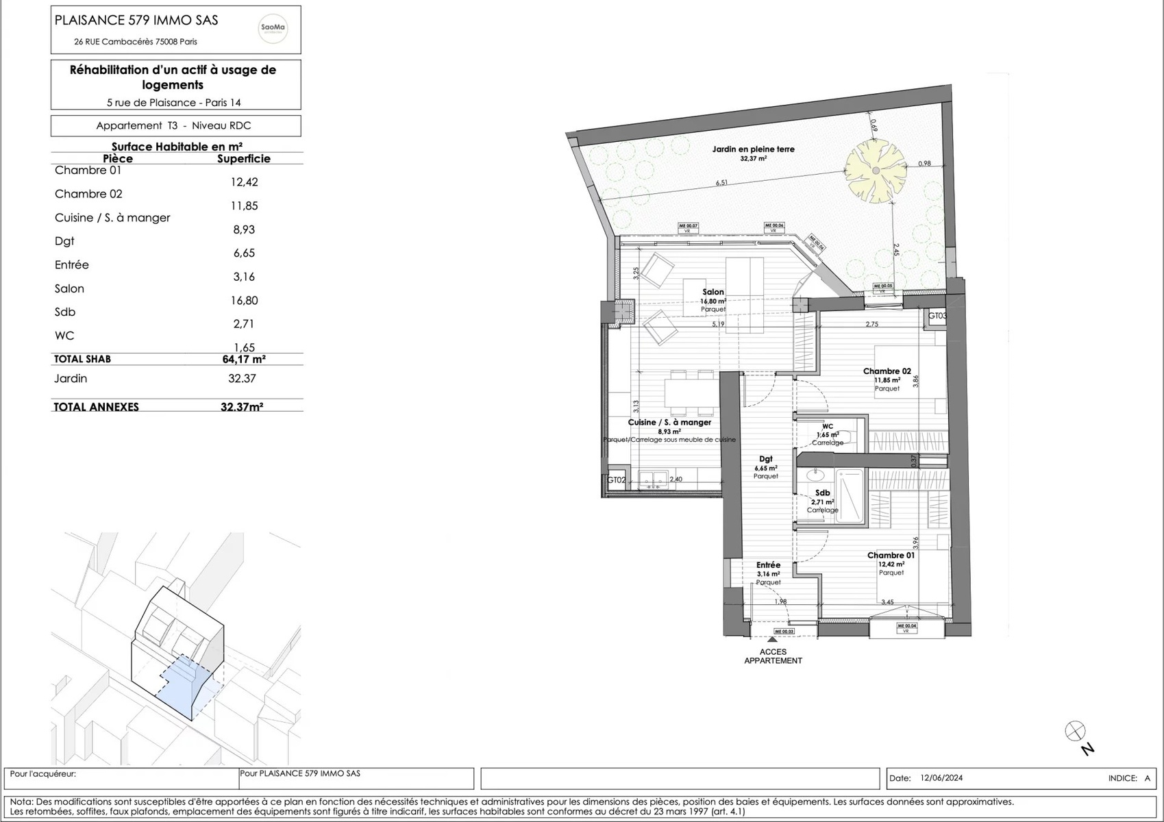 VIR (Vente d'Immeuble à Rénover): On the ground floor of an old, renovated building of very good quality, a stone's throw from the Pernety metro station, in the heart of a shopping district, a 63.15 m2 Carrez law three-room apartment comprising an entrance hall, a living room, an open-plan fitted and equipped kitchen opening onto a 32.35 m2 garden, two bedrooms, a bathroom and separate WC. Large bicycle/stroller room on the ground floor and cellars accessible by elevator in the basement. Liberal professions permitted. All the charm of the old with the advantages of modern construction. Creation of outdoor and planted spaces, contributing to the quality of the homes, urban refreshment and plant continuity.