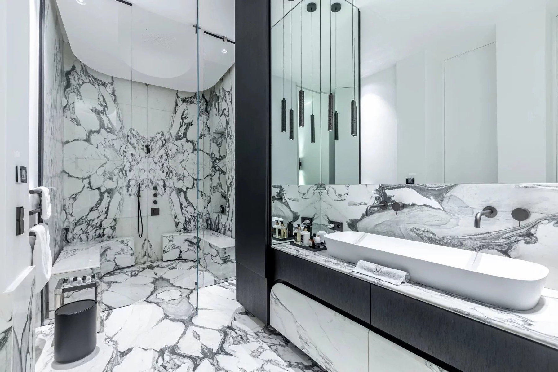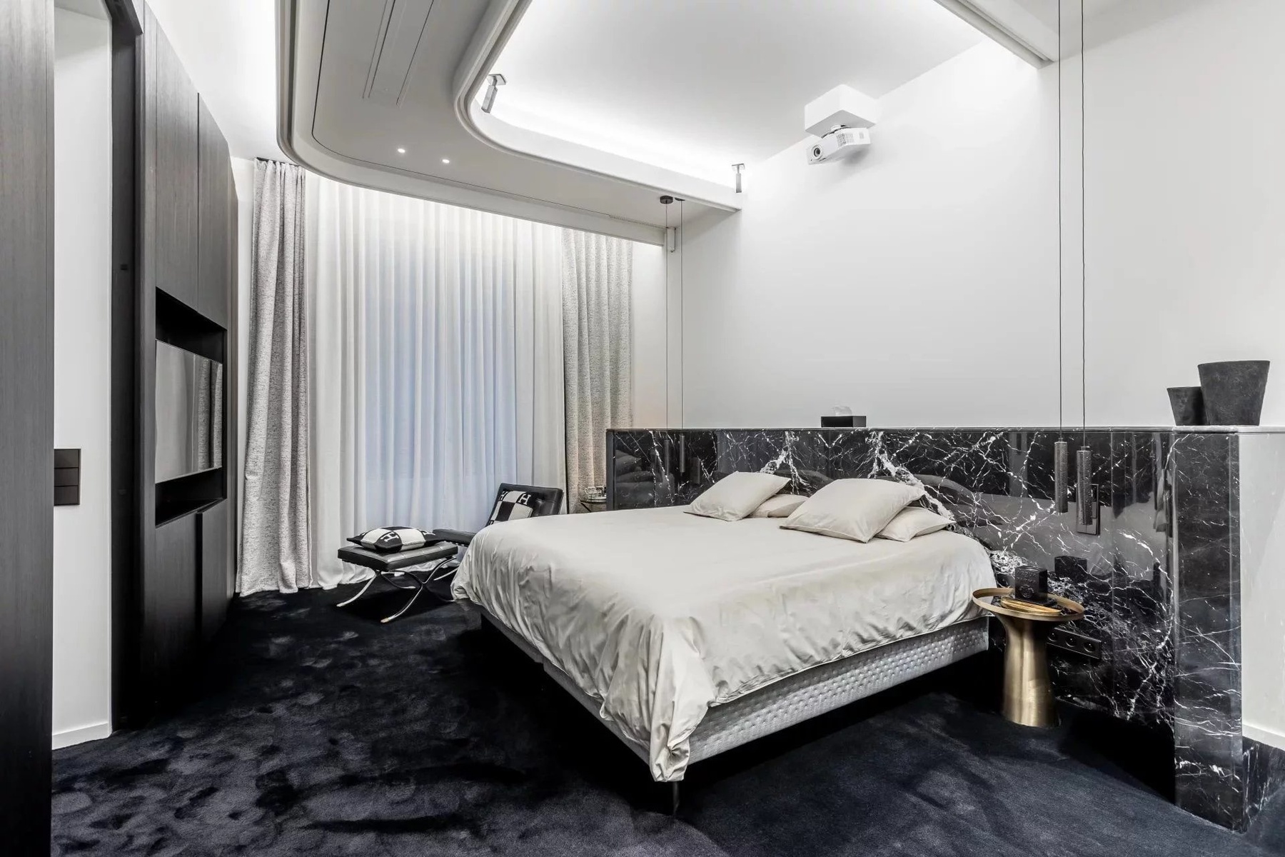 The apartment boasts a stunning living area with high ceilings and exquisite decor, complemented by an abundance of natural light streaming through large windows. The state-of-the-art kitchen and dining area are perfect for entertaining guests, featuring sleek finishes and contemporary fixtures that merge functionality with artistic flair.