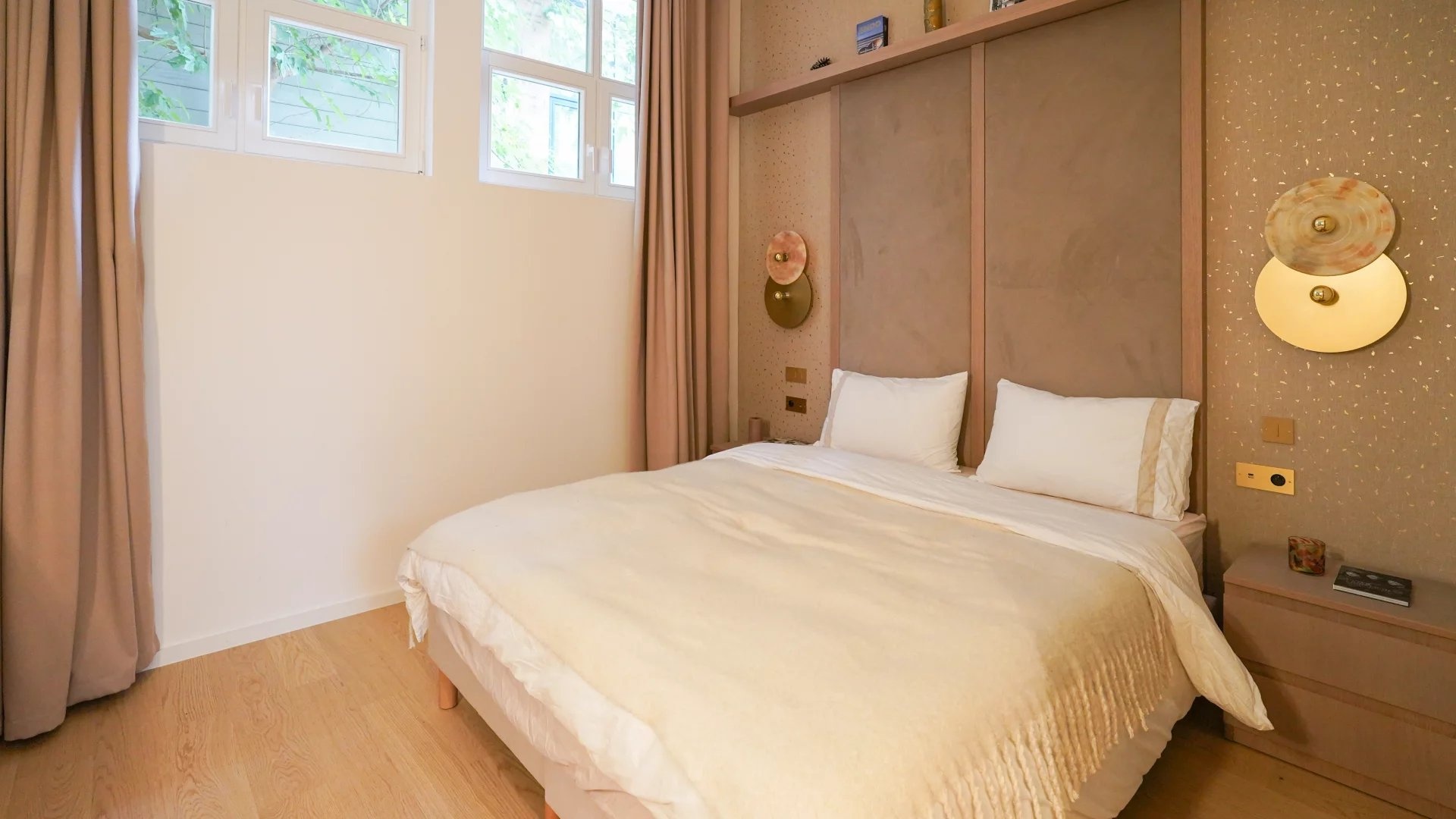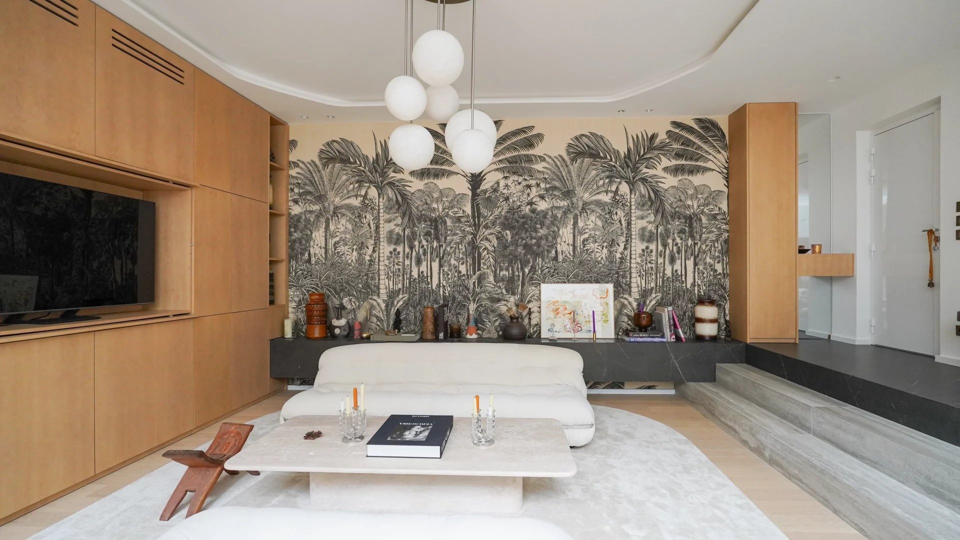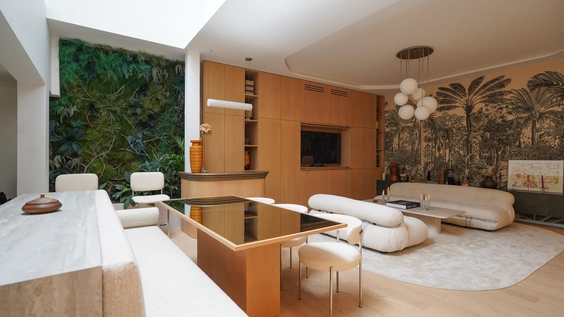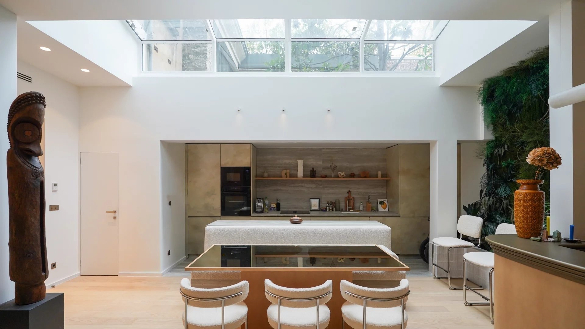 The main living area features an open-plan layout and contemporary design. Large bay windows provide abundant natural light, highlighting the tastefully selected furnishings. The integrated open-plan kitchen features top-of-the-range equipment, ideal for gourmets and entertaining.