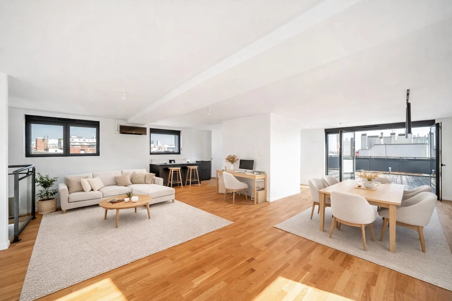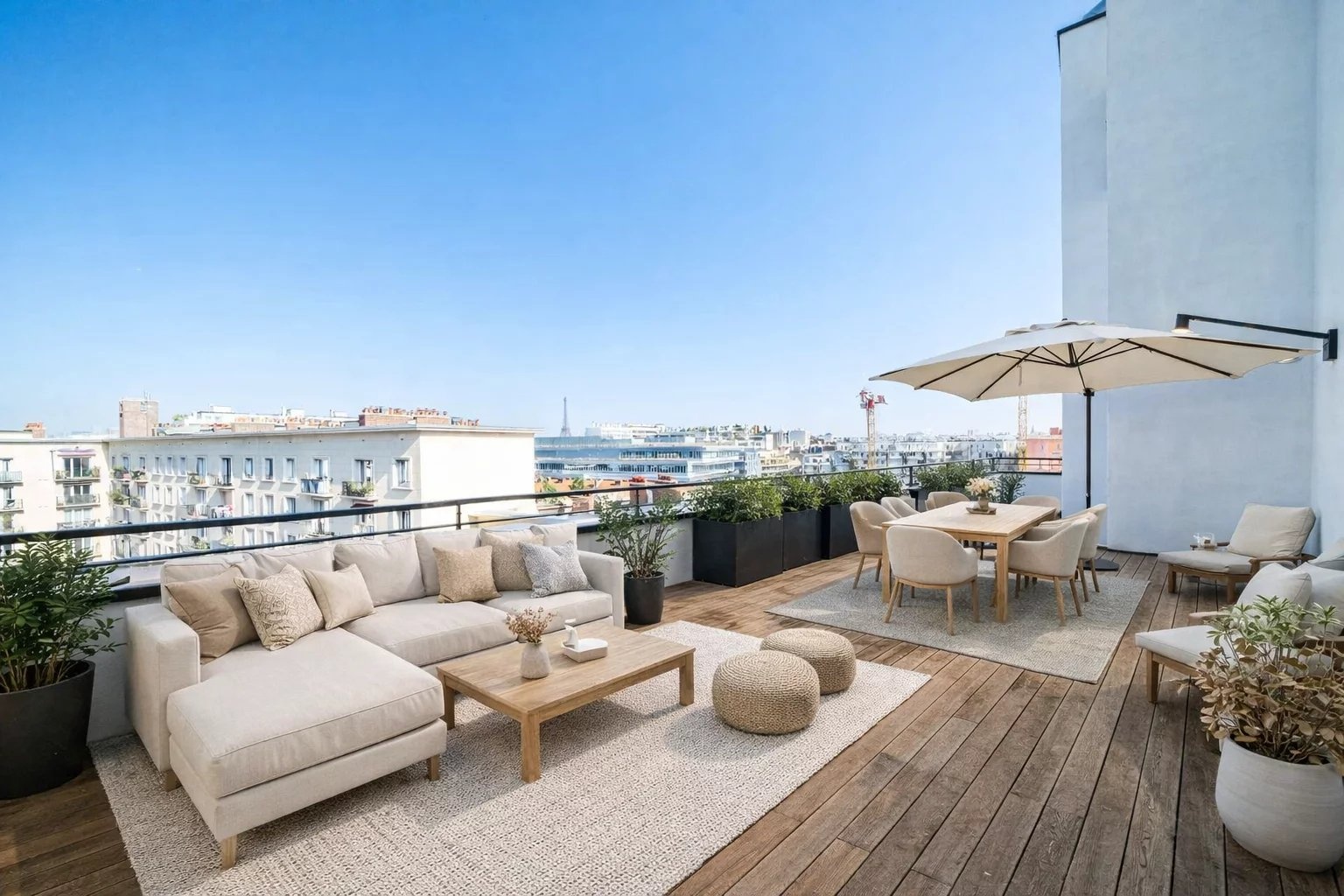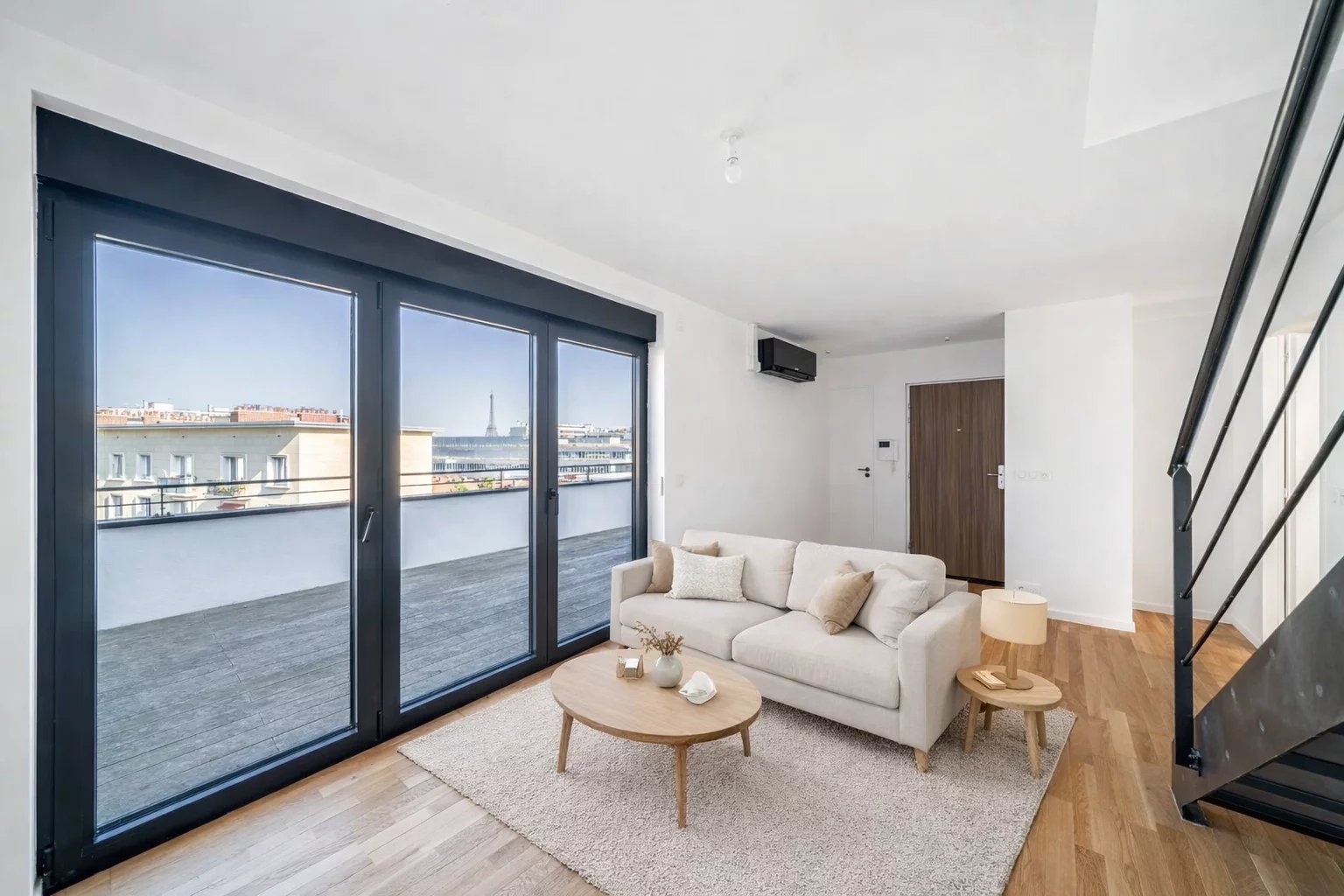 À l’étage supérieur : un grand double séjour avec cuisine ouverte, un second WC indépendant le tout prolongé par une grande terrasse exposée sud-ouest offrant une vue imprenable sur la Tour Eiffel