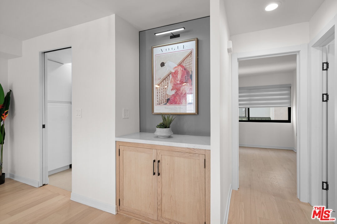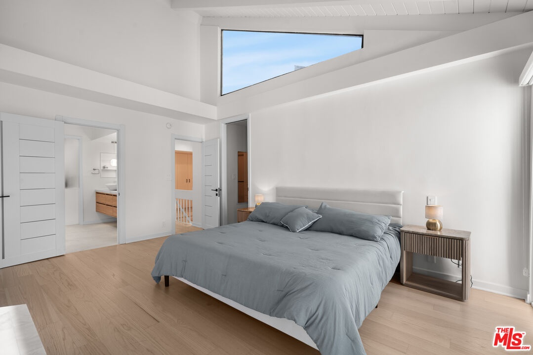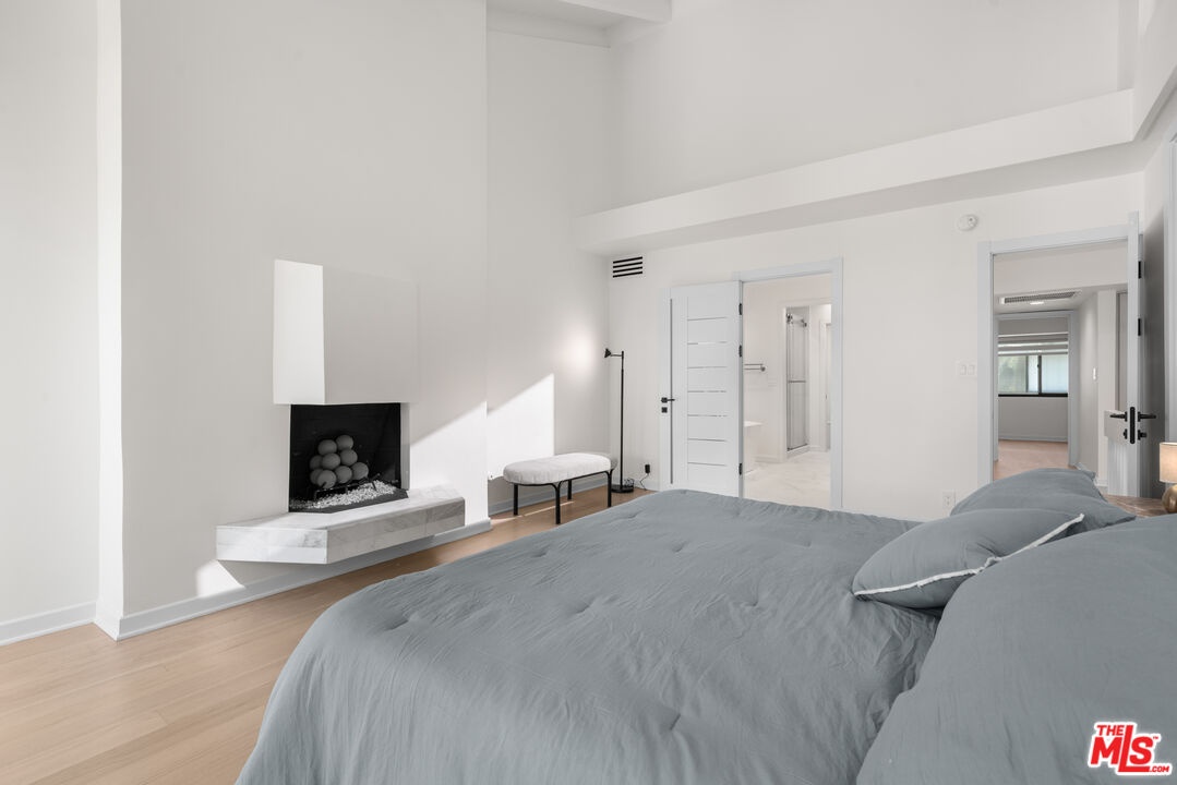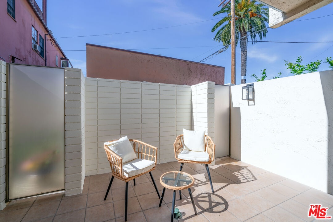 Tucked away in a quiet rear section of the luxurious El Camino townhomes, this corner residence provides a sense of privacy and calm rarely found in such a prime location thus giving it the feel of a single family home. This exquisitely remodeled three-bedroom, three-bathroom residence offers a rare opportunity to enjoy refined living in one of Beverly Hills' most coveted enclaves near iconic Rodeo Drive, just moments from Beverly Drive. Two side glass panels fill the living room with natural light, accentuating the striking marble fireplace. A private patio invites effortless indoor-outdoor living, while a designer wet bar with built-in wine cooler creates an inviting setting for intimate gatherings and elegant entertaining. The elevated dining area overlooks the living room and is highlighted by a statement chandelier. The European-style kitchen features sleek quartz countertops and brand-new Samsung Bespoke light gray glass appliances, blending timeless design with functionality. Modern doors with magnetic closures add refined architectural detail throughout. Upstairs, two luxurious primary bedrooms serve as serene retreats, each with a walk-in closet. One primary suite offers a marble fireplace, private balcony, and captivating views of the Century City skyline, while the spa-inspired bath is enhanced by dual skylights that bathe the space in natural light.Completing the residence are a two-car garage and close proximity to celebrated dining, boutiques, and parks. The property is located within the highly regarded Beverly Hills school district, offering excellent schools from elementary through high school.