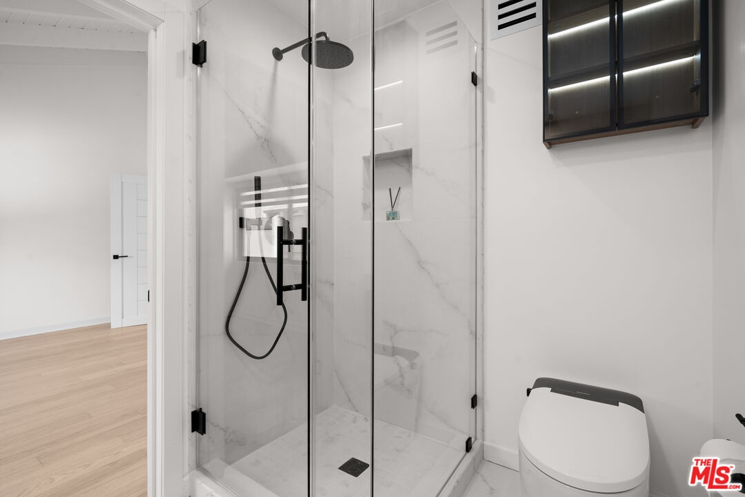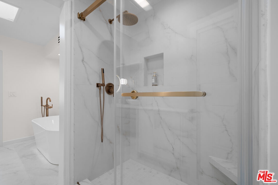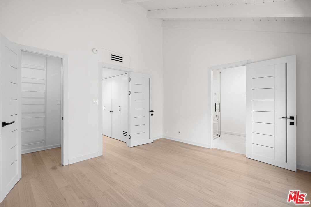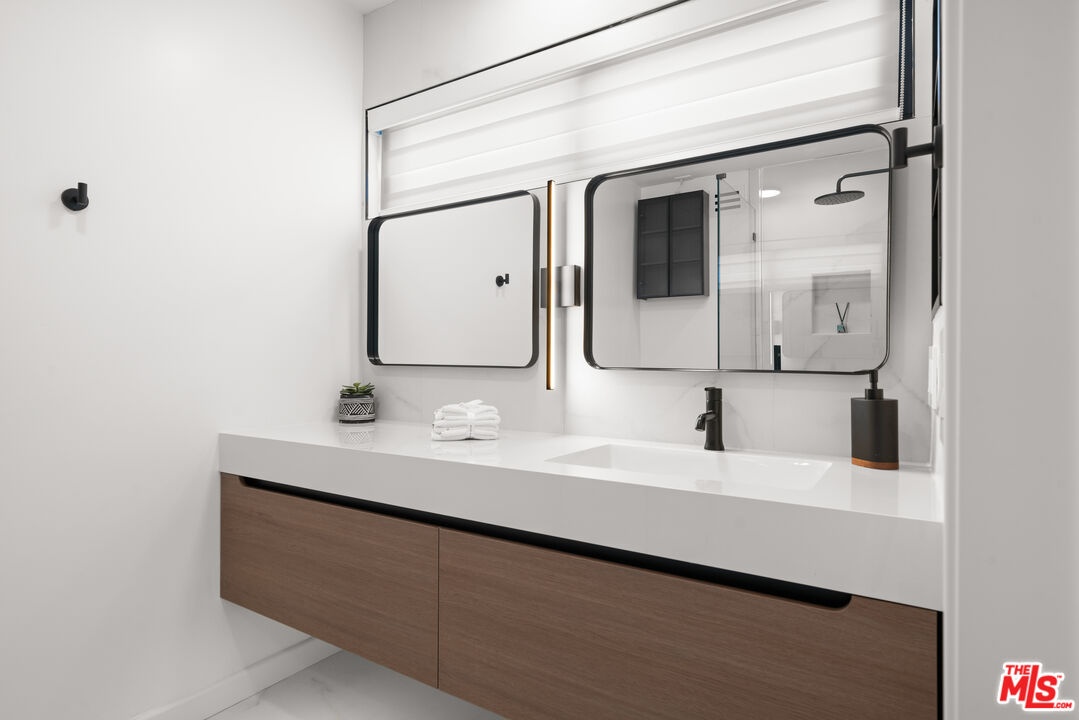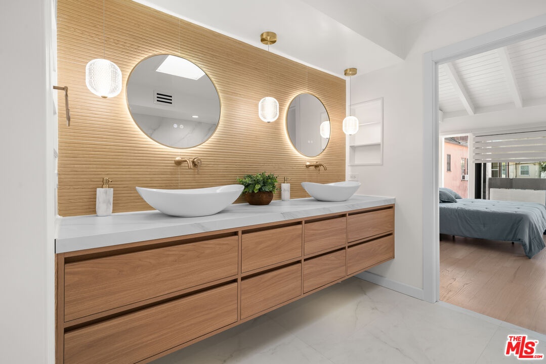 Tucked away in a quiet rear section of the luxurious El Camino townhomes, this corner residence provides a sense of privacy and calm rarely found in such a prime location thus giving it the feel of a single family home. This exquisitely remodeled three-bedroom, three-bathroom residence offers a rare opportunity to enjoy refined living in one of Beverly Hills' most coveted enclaves near iconic Rodeo Drive, just moments from Beverly Drive. Two side glass panels fill the living room with natural light, accentuating the striking marble fireplace. A private patio invites effortless indoor-outdoor living, while a designer wet bar with built-in wine cooler creates an inviting setting for intimate gatherings and elegant entertaining. The elevated dining area overlooks the living room and is highlighted by a statement chandelier. The European-style kitchen features sleek quartz countertops and brand-new Samsung Bespoke light gray glass appliances, blending timeless design with functionality. Modern doors with magnetic closures add refined architectural detail throughout. Upstairs, two luxurious primary bedrooms serve as serene retreats, each with a walk-in closet. One primary suite offers a marble fireplace, private balcony, and captivating views of the Century City skyline, while the spa-inspired bath is enhanced by dual skylights that bathe the space in natural light.Completing the residence are a two-car garage and close proximity to celebrated dining, boutiques, and parks. The property is located within the highly regarded Beverly Hills school district, offering excellent schools from elementary through high school.