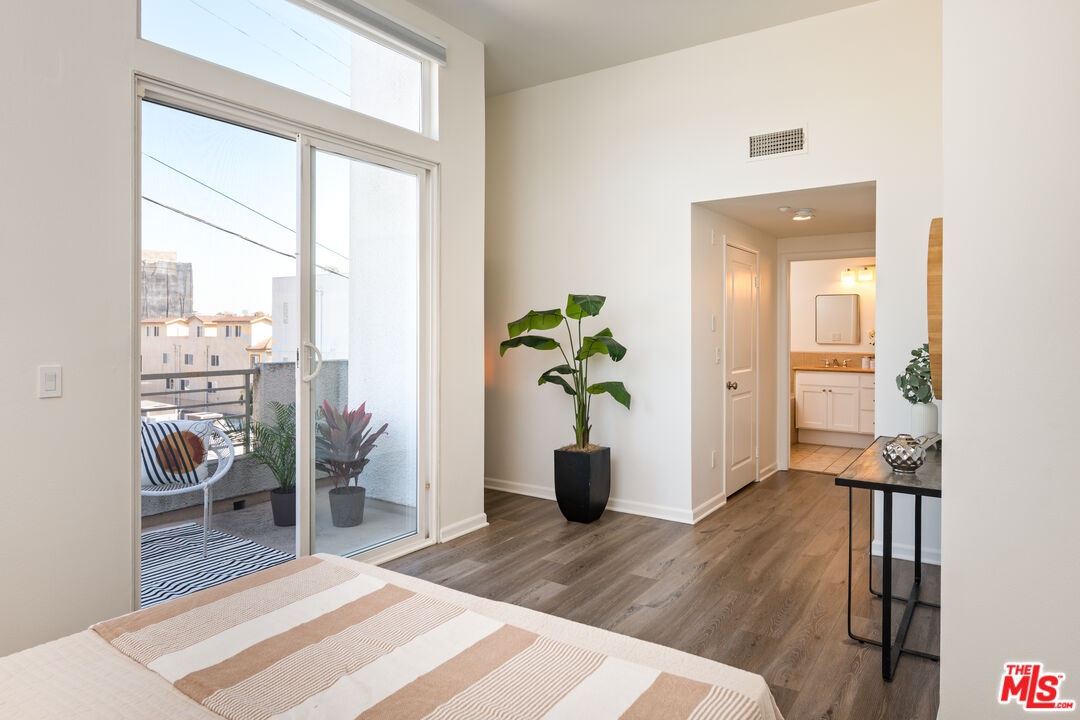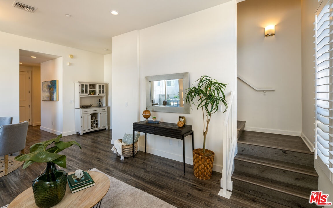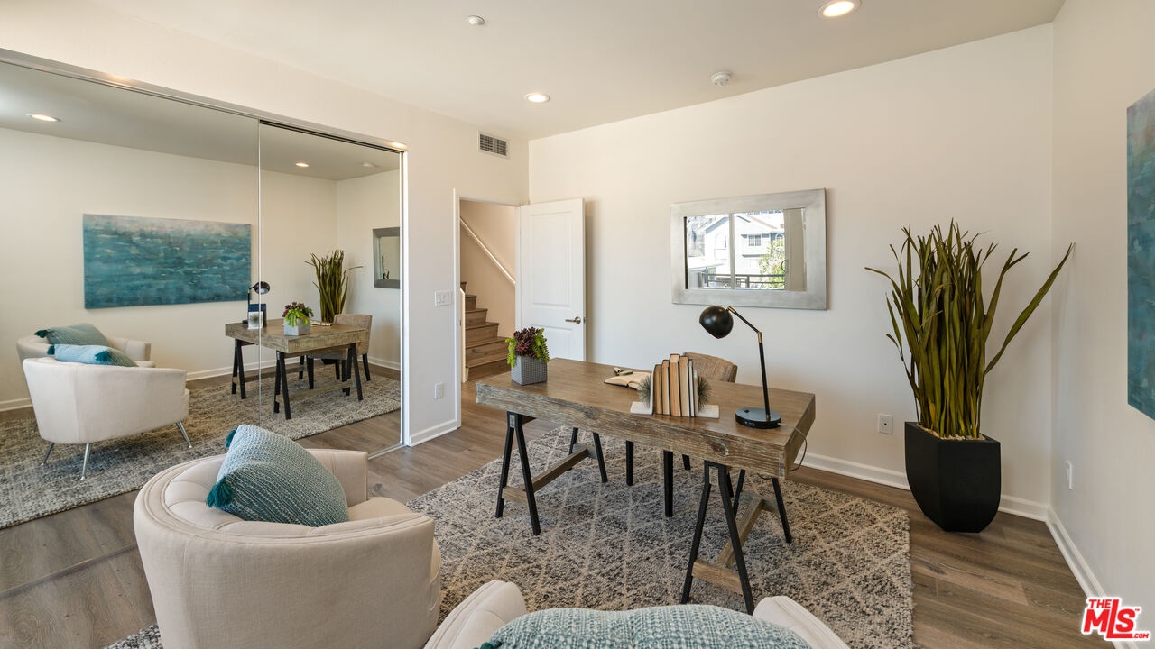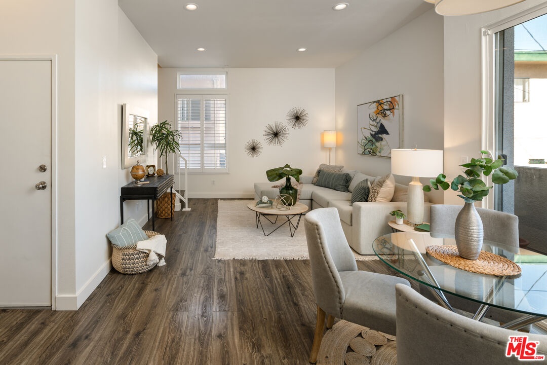 Beautifully updated and natural light filled, this corner unit townhome is located in a 9 unit gated community on Clarington Ave in the highly desirable Palms neighborhood, just moments from Culver City. Built in 2002, this tri-level residence offers approximately 1,554 square feet with 3 bedrooms and 2.5 baths, plus an attached side by side two car garage with direct entry and a 220V outlet for electric vehicle charging. The main level of the home features the kitchen, dining, living area, and powder room, perfect for both entertaining and everyday living. The updated kitchen showcases stainless steel appliances, white quartz countertops, and a classic subway tile backsplash. The bright living room boasts high ceilings and opens to a private balcony. On the second level, you will find two nicely sized bedrooms, both with natural light and generous closets, along with a full bath and laundry. The home is equipped with dual pane windows, newer dual pack heat pump HVAC system, and a Nest smart thermostat for modern comfort. The top floor is dedicated to the primary suite, featuring high ceilings, floor to ceiling windows with shutters, and a large ensuite bath complete with a soaking tub and double sinks. Step outside to the oversized wrap around private deck with north and east exposures, an ideal space for gardening, relaxing, or enjoying the views. In total, the home offers three private balconies, creating seamless indoor outdoor living. This secure gated community includes HOA coverage for water, sewer and building insurance. Ideally located just one block from the Metro Light Rail station with easy access to DTLA and Santa Monica, and only minutes from downtown Culver City's vibrant restaurants, shops, and entertainment. With convenient access to the 10 and 405 freeways, this home offers the perfect blend of comfort, privacy, and an unbeatable central location.