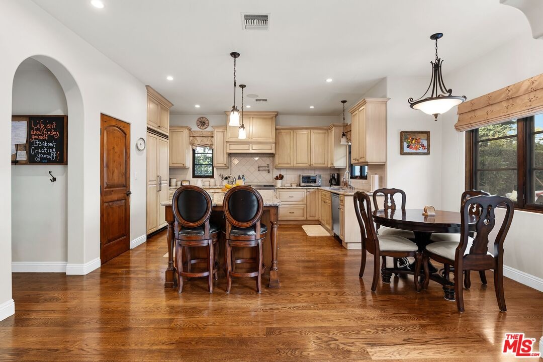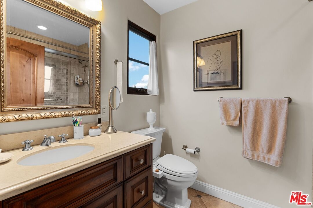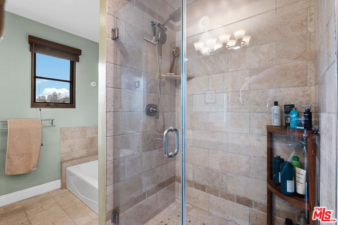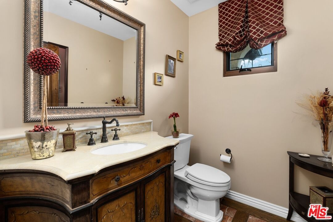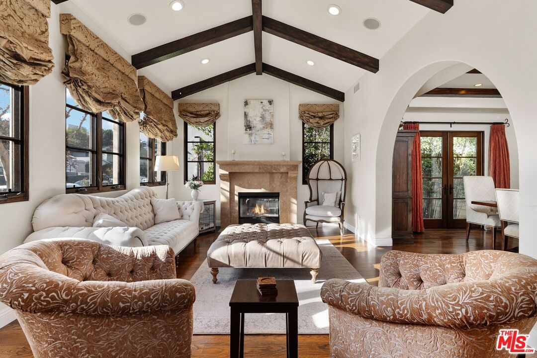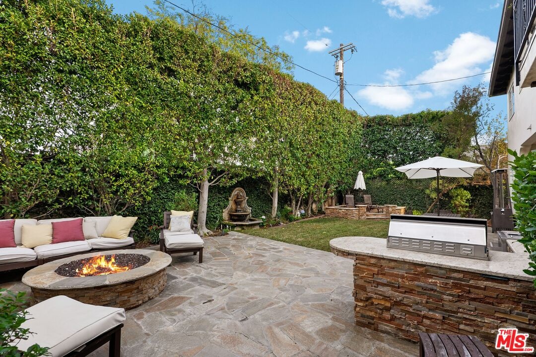 A stunning Italian/Mediterranean-inspired estate offering refined elegance, generous scale, and exceptional indoor-outdoor living. This expansive 5-bedroom, 4.5-bath residence is set behind a lush, private backyard designed for both relaxation and entertaining. The gracious living room features soaring beamed cathedral ceilings anchored by a magnificent marble fireplace, while the formal dining room impresses with a coffered ceiling ideal for elegant gatherings. The chef's kitchen showcases an oversized center island, Viking appliances, and opens seamlessly to an inviting family room with a custom fireplace. The first floor includes a private bedroom with adjacent full bath, a dedicated office, and an additional half bath, complemented by custom wood and marble flooring. A dramatic iron staircase beneath a custom skylight leads to an oversized upper landing, three additional bedrooms, two bathrooms, a laundry room, and an expansive primary master suite. The luxurious primary retreat features a custom fireplace, large walk-in closet, two additional closets, a grand spa-like bath with dual sinks, dual showers, and a Jacuzzi tub, plus a private balcony overlooking the backyard oasis. The outdoor space is highlighted by two fountains, beautiful flagstone hardscape, an oversized fire pit, and a built-in barbecue and beverage center perfect for entertaining year-round. Additional features include a tranquil Zen garden on one side of the home, a secured dog run with three cedar storage sheds on the other, and a two-car garage with secure overhead storage.