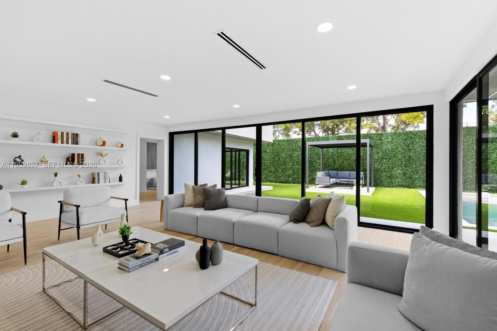 Experience Luxury living in this architectural masterpiece located in the highly coveted neighborhood of Bay Heights in Coconut Grove. This 5 bed 5 bath plus office house has undergone a complete renovation and transformation, combining modern elegance with timeless design. Set on a nearly 11,500 sqft. lot, this home is filled with natural light and features an open-concept floor plan connecting living, dining, and outdoor spaces. The living room boasts sliding glass doors that open on all sides, epitomizing for an indoor-outdoor lifestyle. Architectural highlights include sleek LED strip lighting, lush boxwood details, and warm slatted wood accents. The private backyard is surrounded by mature landscaping, a pool, BBQ area, and pergola. This property is TURN KEY with all new furniture, artwork, and TV’s included .Nestled in the 24/7 police-patrolled community of Bay Heights, this house is close to all the top schools and minutes away from the heart of Brickell, Kennedy Park, and Cocowalk.