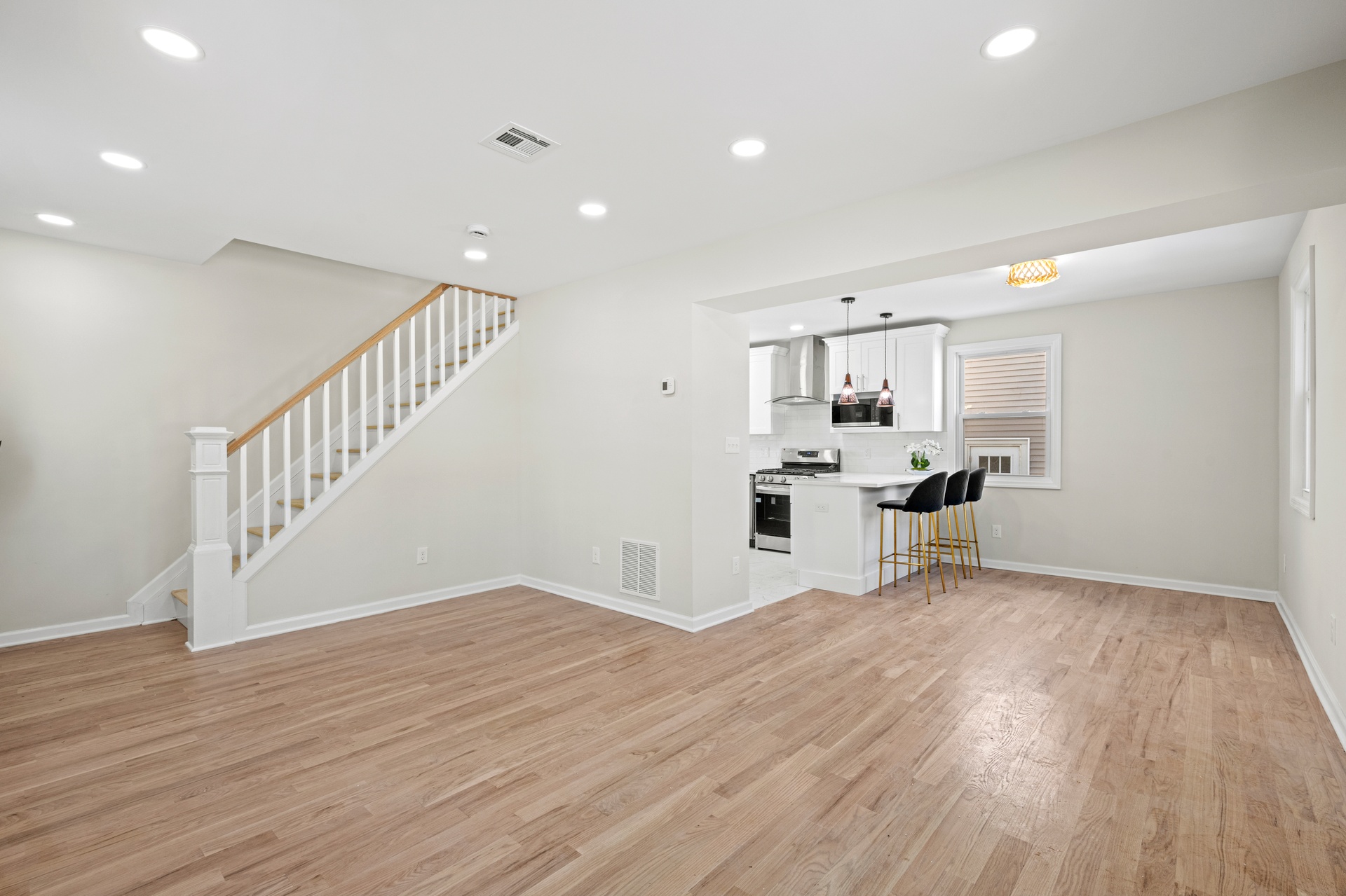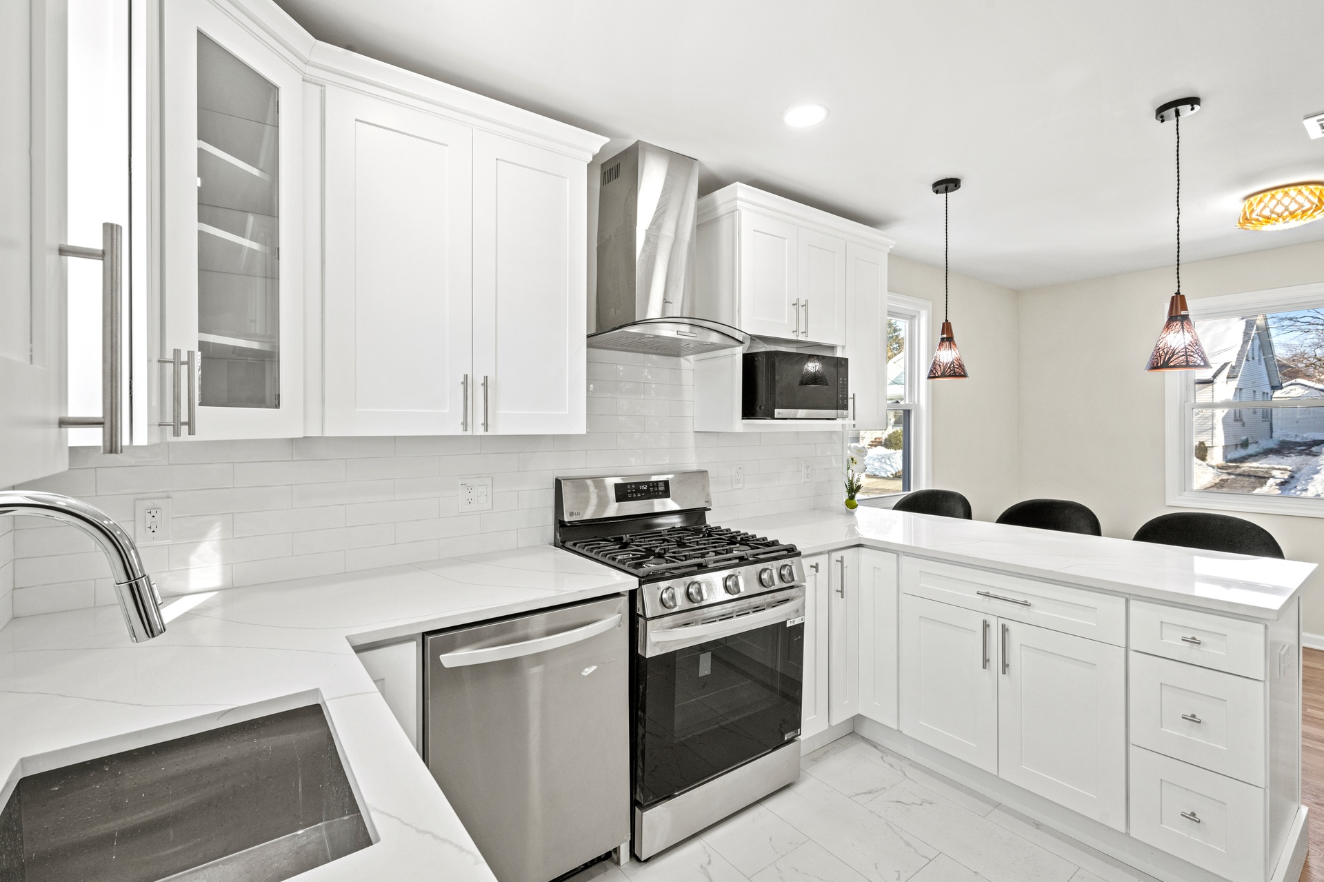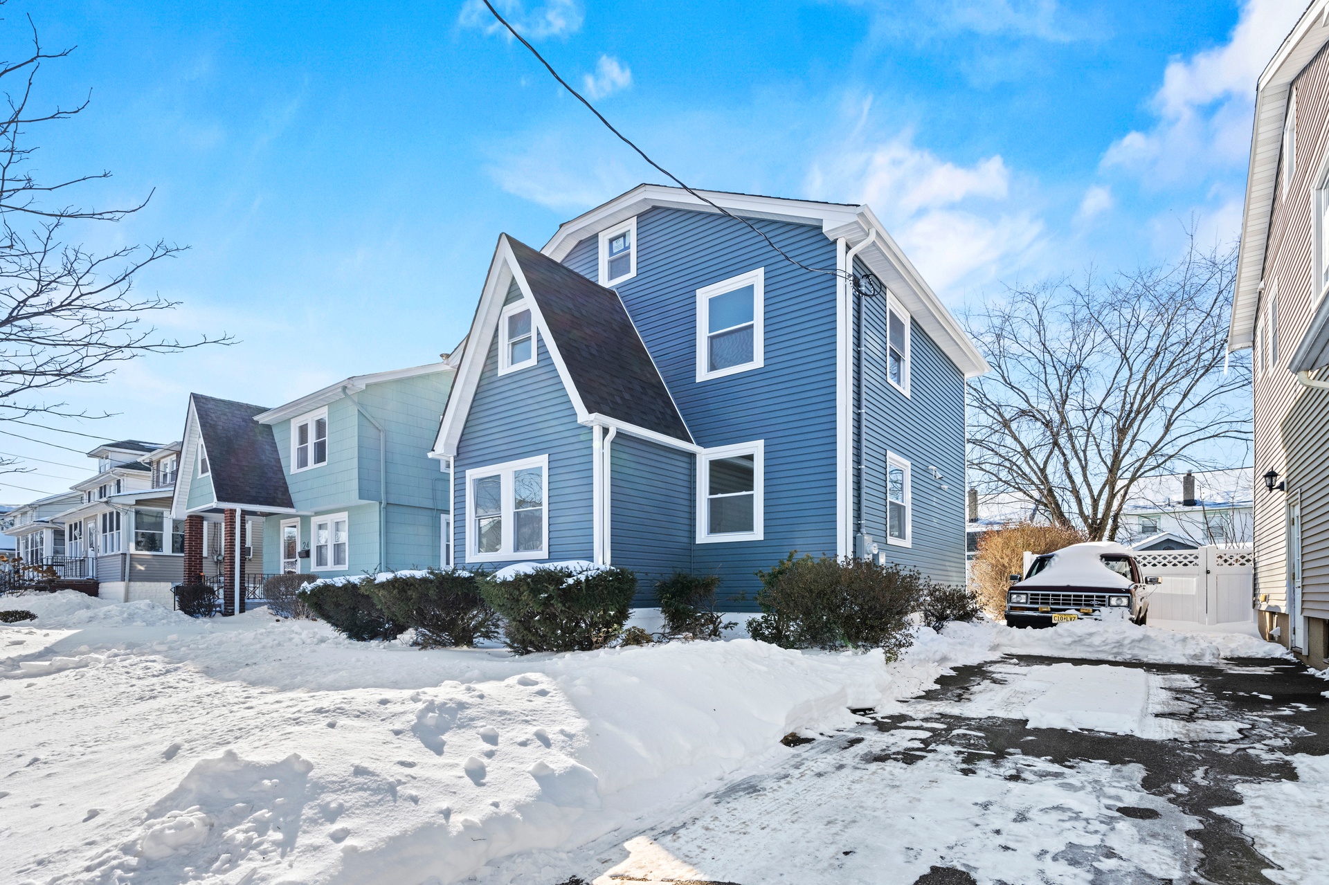 Outside, the property features a private driveway and an impressive three-car garage, providing exceptional parking and storage capacity. The exterior presents a clean and polished curb appeal that mirrors the interior renovation.