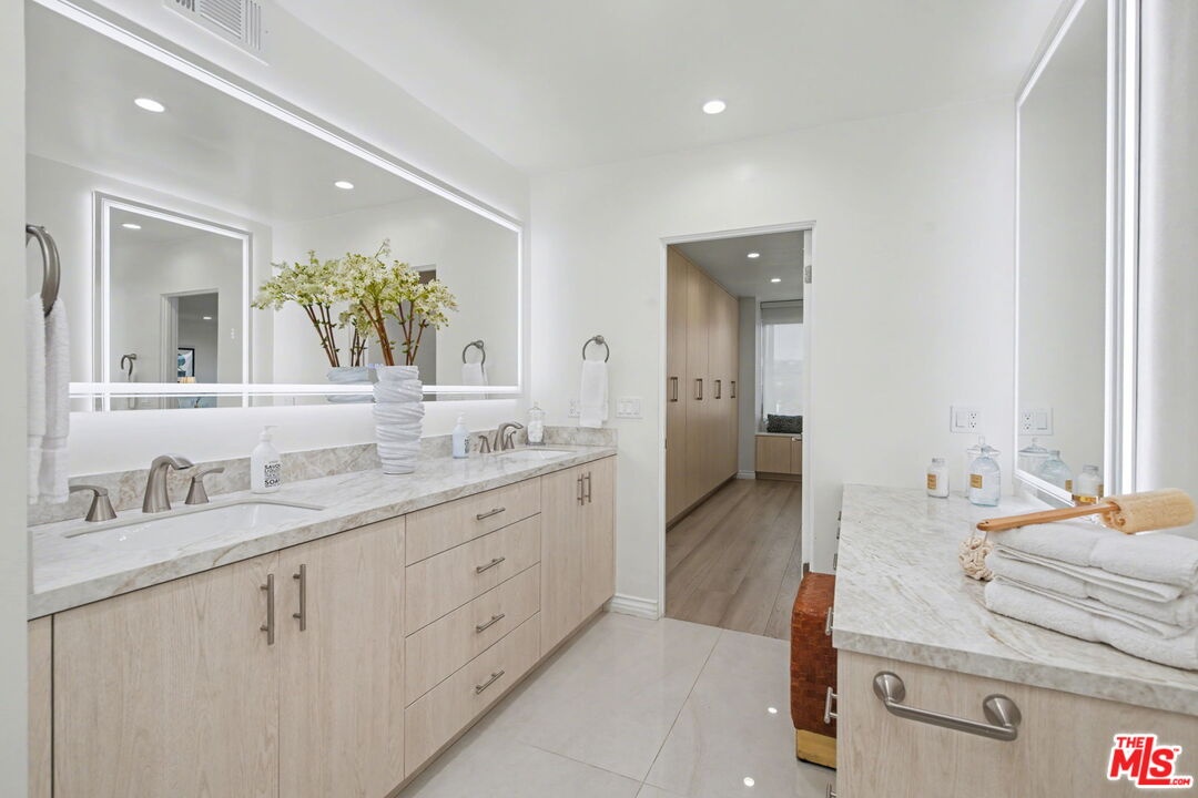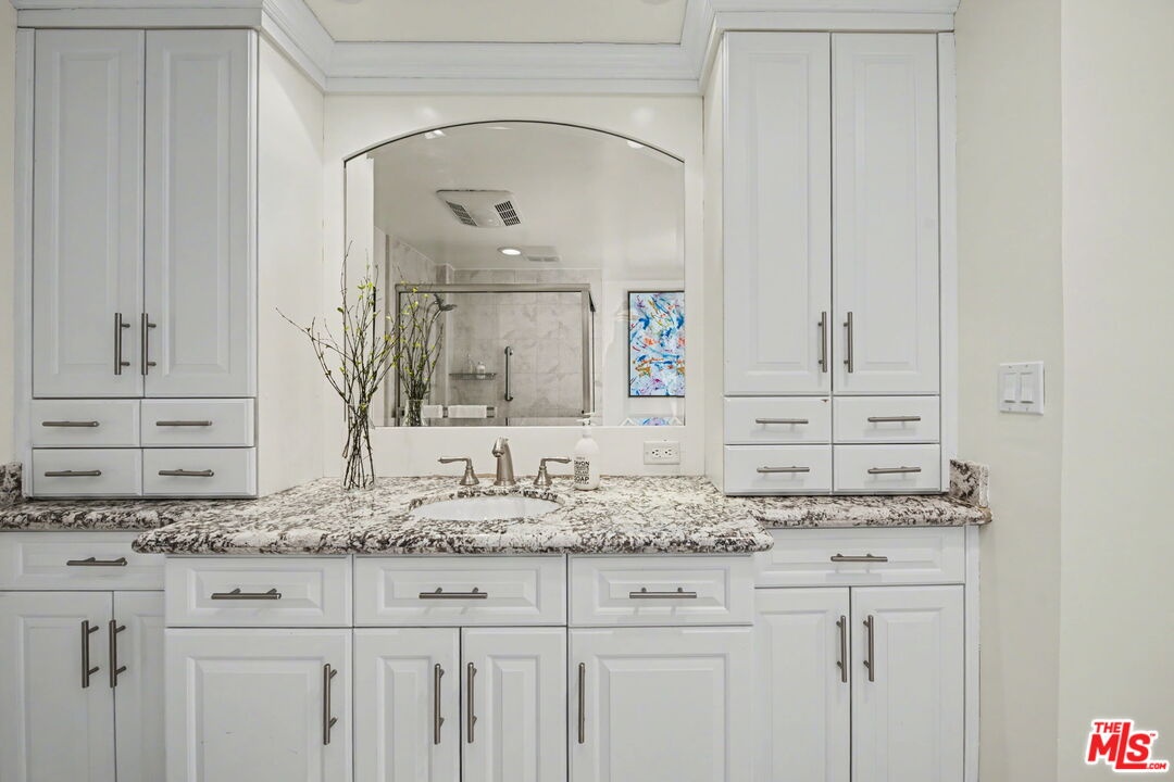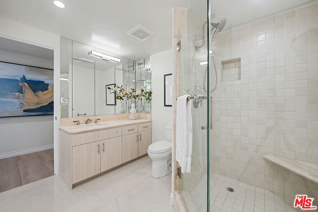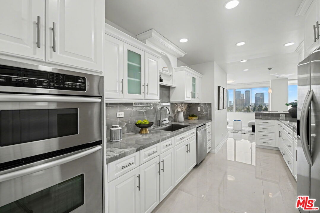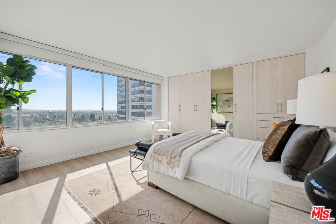 Newly remodeled Stunning Contemporary 5 bed/4.5 bath with unparalleled city, golf course and mountain views in the desired full service Comstock Towers on the Wilshire Corridor. Experience elevated living in this fully updated, sophisticated one level 3,100+sf condo. Showcasing breathtaking, unobstructed views of the Los Angeles Country Club golf course, Century City skyline, and surrounding mountains, this chic and spacious unit is designed for both grand entertaining and comfortable everyday living. A double-door entry opens to a light-filled, expansive floor plan featuring newer high-end designer finishes including marble and light oak hardwood flooring . The living room is framed by straight-on Century City views, enhanced by LED recessed lighting and custom auto shades. The open, fully remodeled kitchen includes stunning quartzite countertops, stainless steel appliances, a generous walk-in pantry, breakfast bar, and a separate breakfast room/flex space. A full laundry room with its own entrance and additional storage is conveniently located just off the kitchen.The dramatic dining room, surrounded by windows, captures stunning panoramic views, perfect for intimate dinners or large gatherings. Also includes a built-in entertainer's bar counter with wine storage. The grand primary suite is a private retreat, ideally positioned at the back of the unit, opposite side of the other 4 bedrooms, with panoramic unobstructed mountain and golf course views. The suite features newly built custom closets and shelving. The spa-inspired primary bath is completely renovated with quartz countertops, new cabinetry, dual sinks, a vanity area, oversized spa tub, and a luxurious rain shower. With 3 of the 5 bedrooms having en-suite bathrooms, all with newly installed custom closets and newer hardwood flooring. In addition, a beautifully remodeled full hallway bath and stylish powder room complete the layout. Additional highlights include updated hardware throughout, abundant storage with multiple closets and built-in shelving, and storage cabinetry in the entry hall. Sophisticated, spacious, and thoughtfully designed, and ideal proximity to Beverly Hills, UCLA and Westfield Century City Mall. Warner Avenue Elementary. Move-in ready!