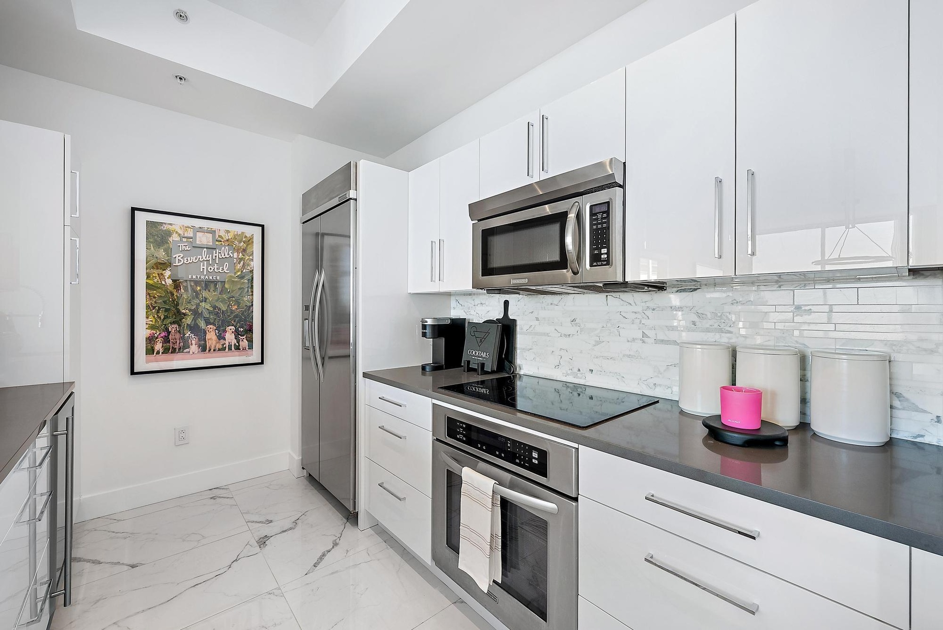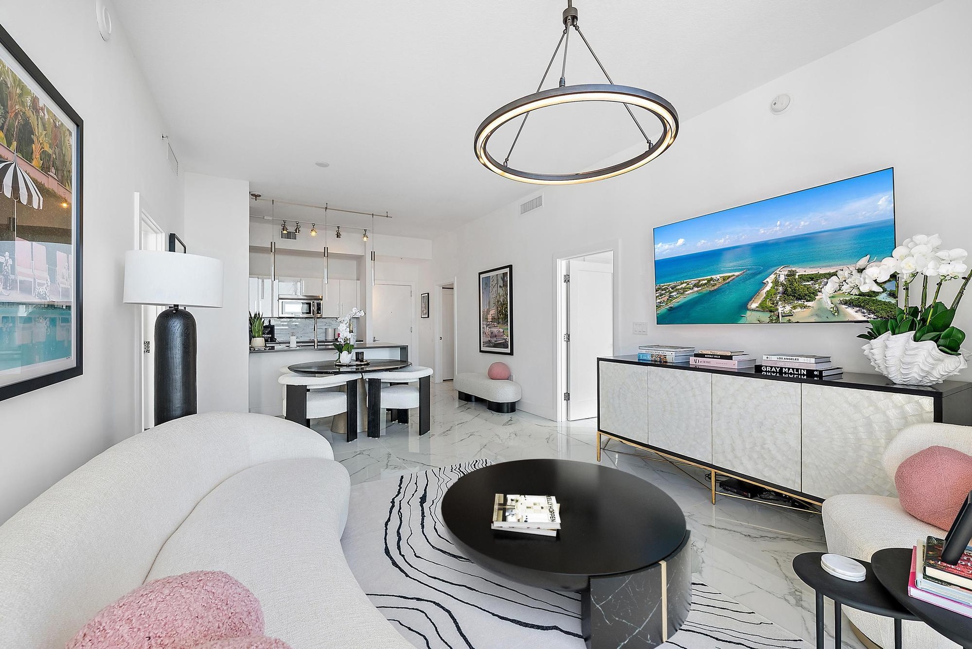 This impeccably renovated 2-bedroom, 2-bathroom penthouse features 10-foot ceilings and a coveted south exposure, offering sweeping views of the city skyline, Intracoastal Waterway, and the Atlantic Ocean. Every detail has been thoughtfully curated, blending modern luxury with classic California glamour.
