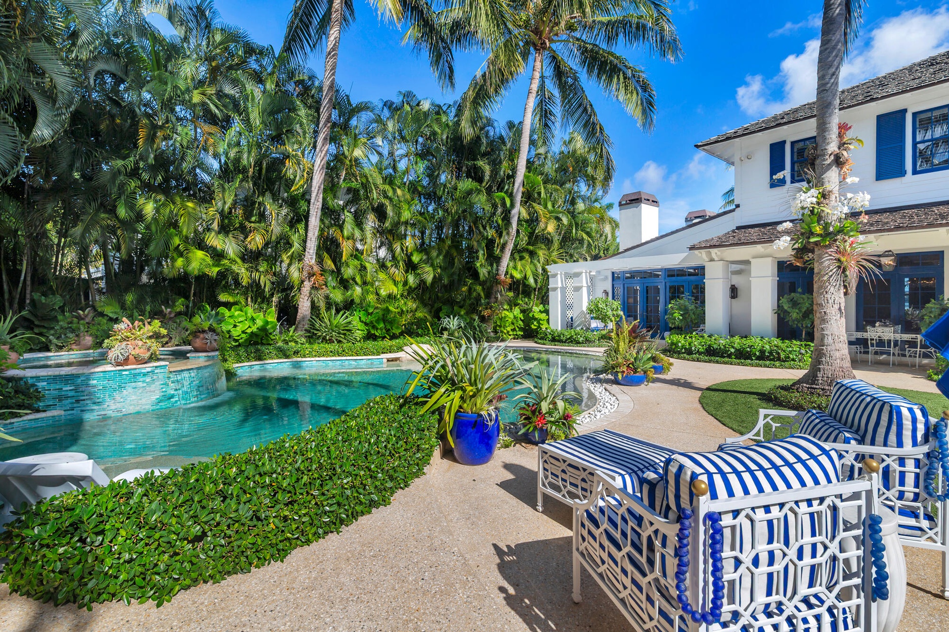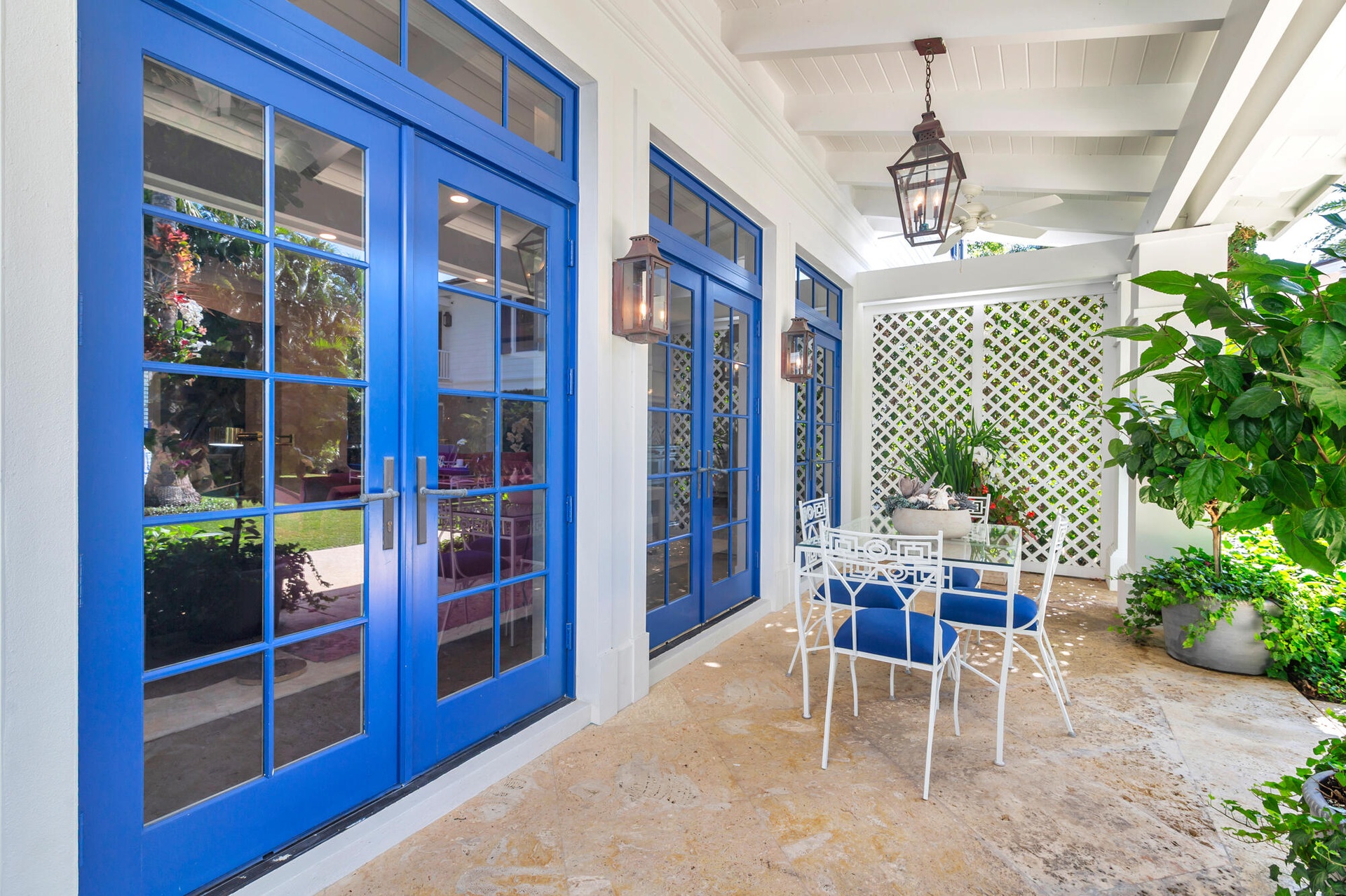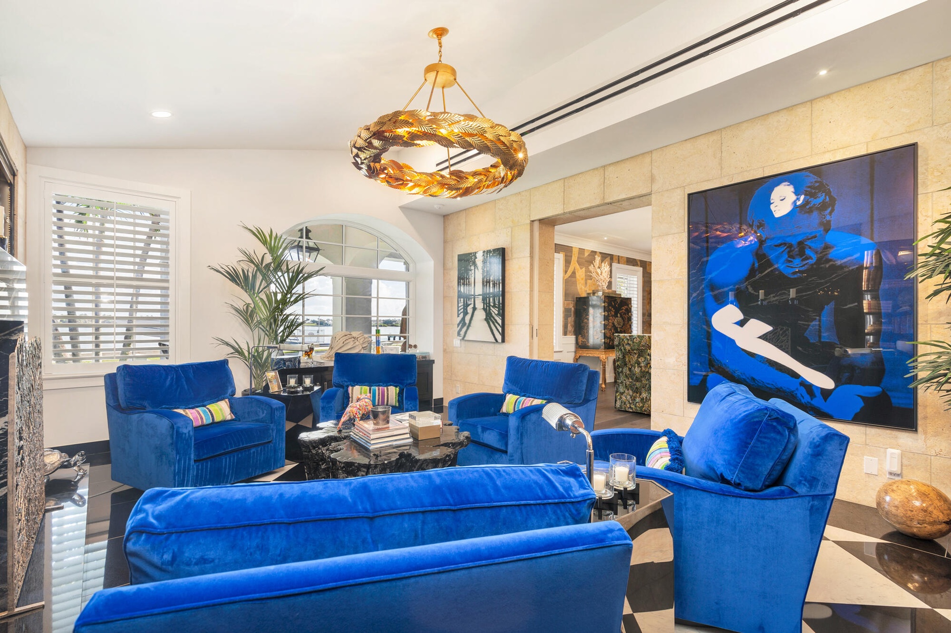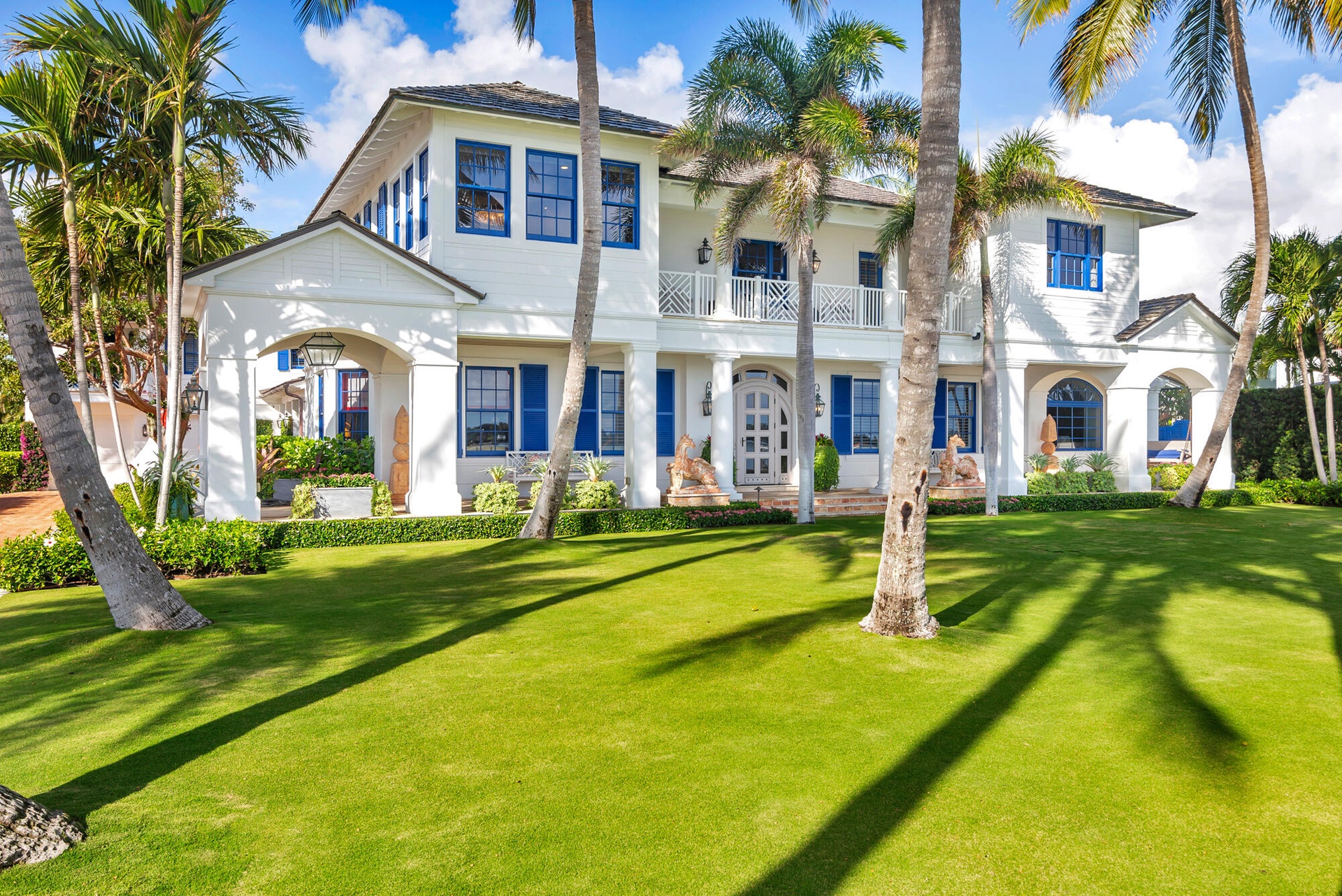 Originally envisioned by Roy & Posey Architects and completed by Island Construction in 2013 and now fully-transformed and elevated by the world-renowned Robert Trown and Associates, the estate spans over 9,000± square feet under roof and is composed of a main residence complemented by a separate guest house. The primary home includes five bedrooms and four and a half baths, with a first-floor bedroom currently enjoyed as an office, and a separate one-bedroom guest house replete with a full kitchen, vaulted ceilings, and private balcony. Oriented to capture wide-water views, the main living areas offer an open family room flowing into an eat-in kitchen, appointed with imported custom Italian cabinetry and a dramatic rare imported blue Sodalite island. The formal dining room frames the Intracoastal, while expansive glass doors open to covered loggias to create an effortless indoor-outdoor rhythm.