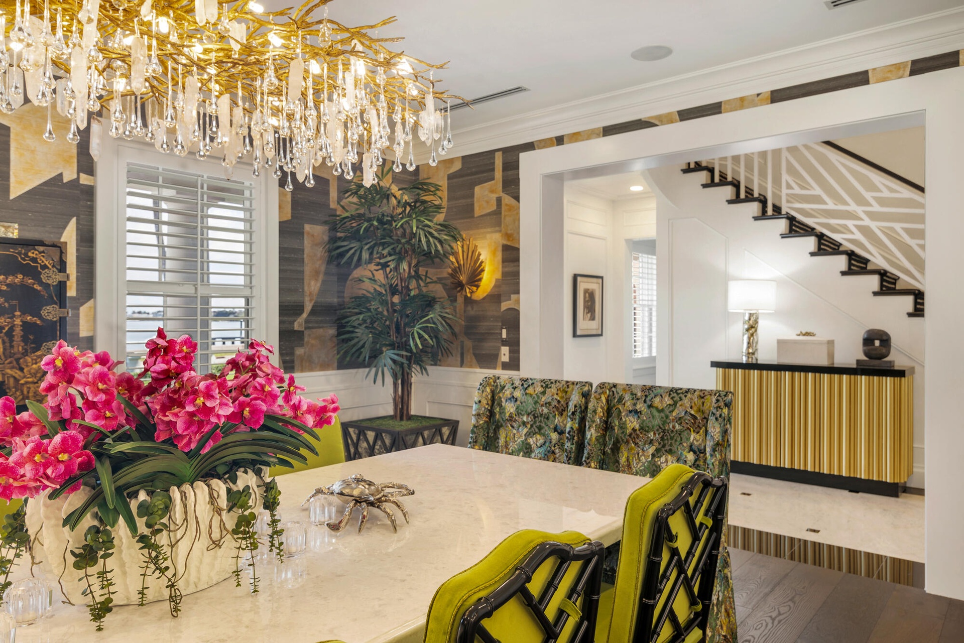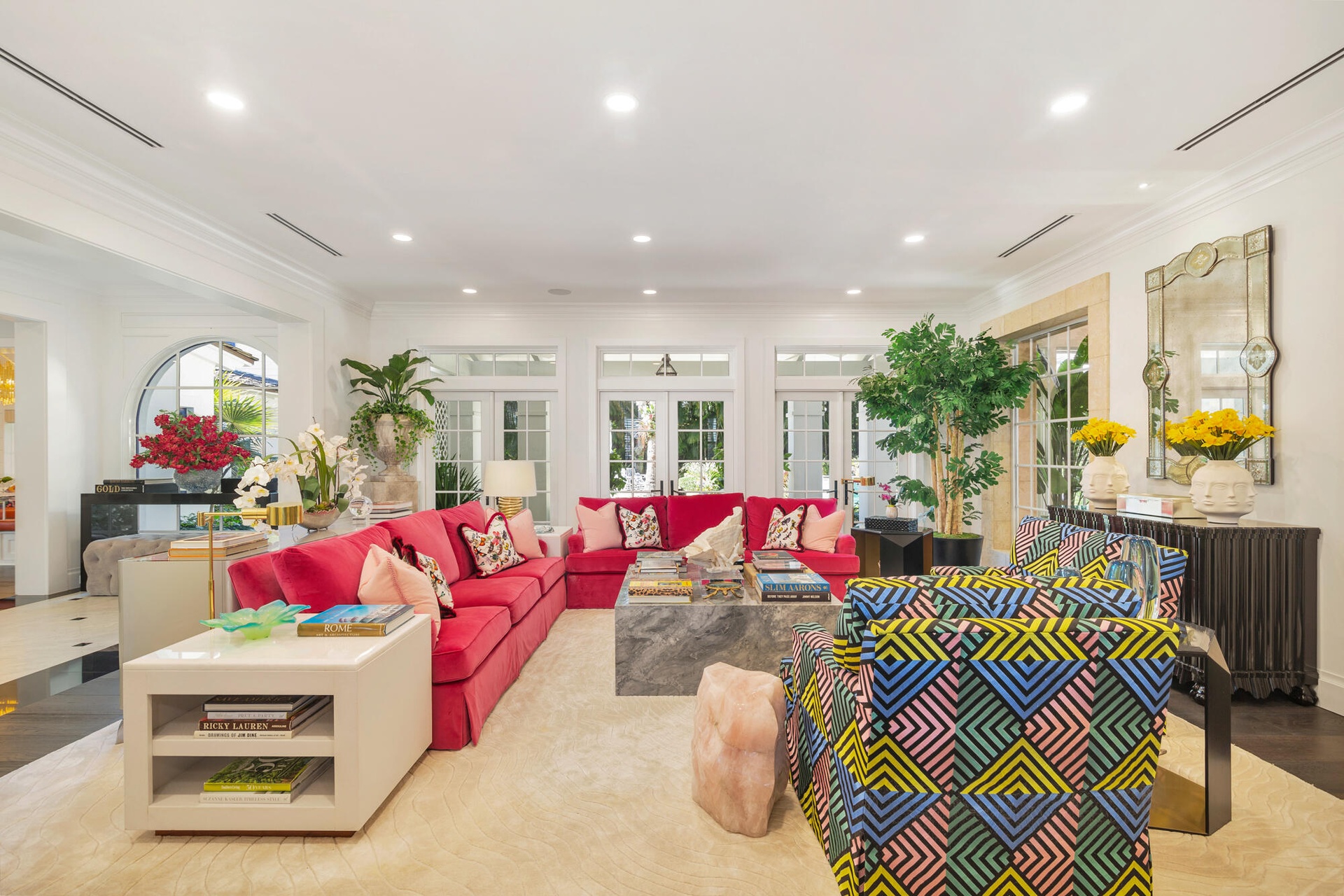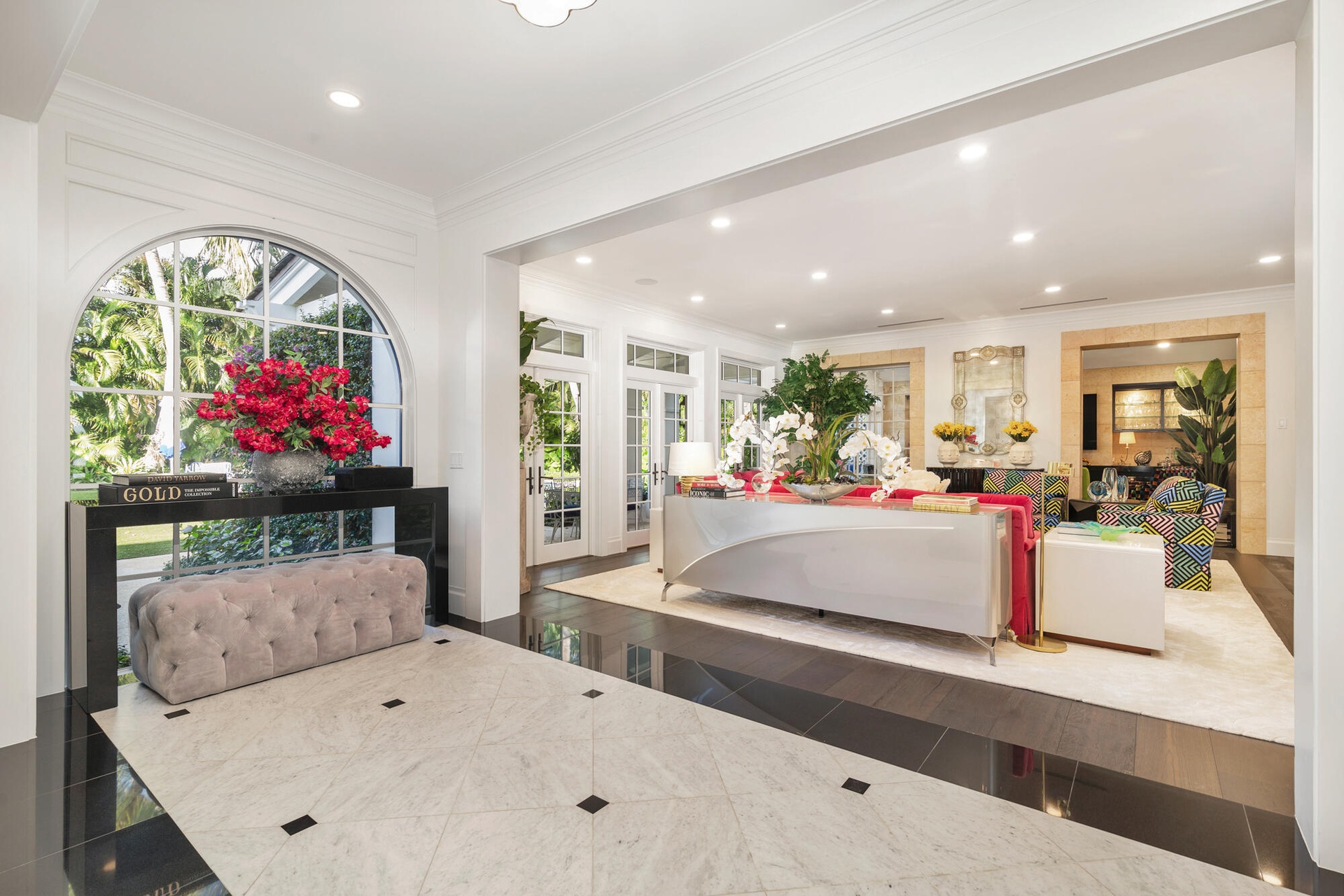 Originally envisioned by Roy & Posey Architects and completed by Island Construction in 2013 and now fully-transformed and elevated by the world-renowned Robert Trown and Associates, the estate spans over 9,000± square feet under roof and is composed of a main residence complemented by a separate guest house. The primary home includes five bedrooms and four and a half baths, with a first-floor bedroom currently enjoyed as an office, and a separate one-bedroom guest house replete with a full kitchen, vaulted ceilings, and private balcony. Oriented to capture wide-water views, the main living areas offer an open family room flowing into an eat-in kitchen, appointed with imported custom Italian cabinetry and a dramatic rare imported blue Sodalite island. The formal dining room frames the Intracoastal, while expansive glass doors open to covered loggias to create an effortless indoor-outdoor rhythm.