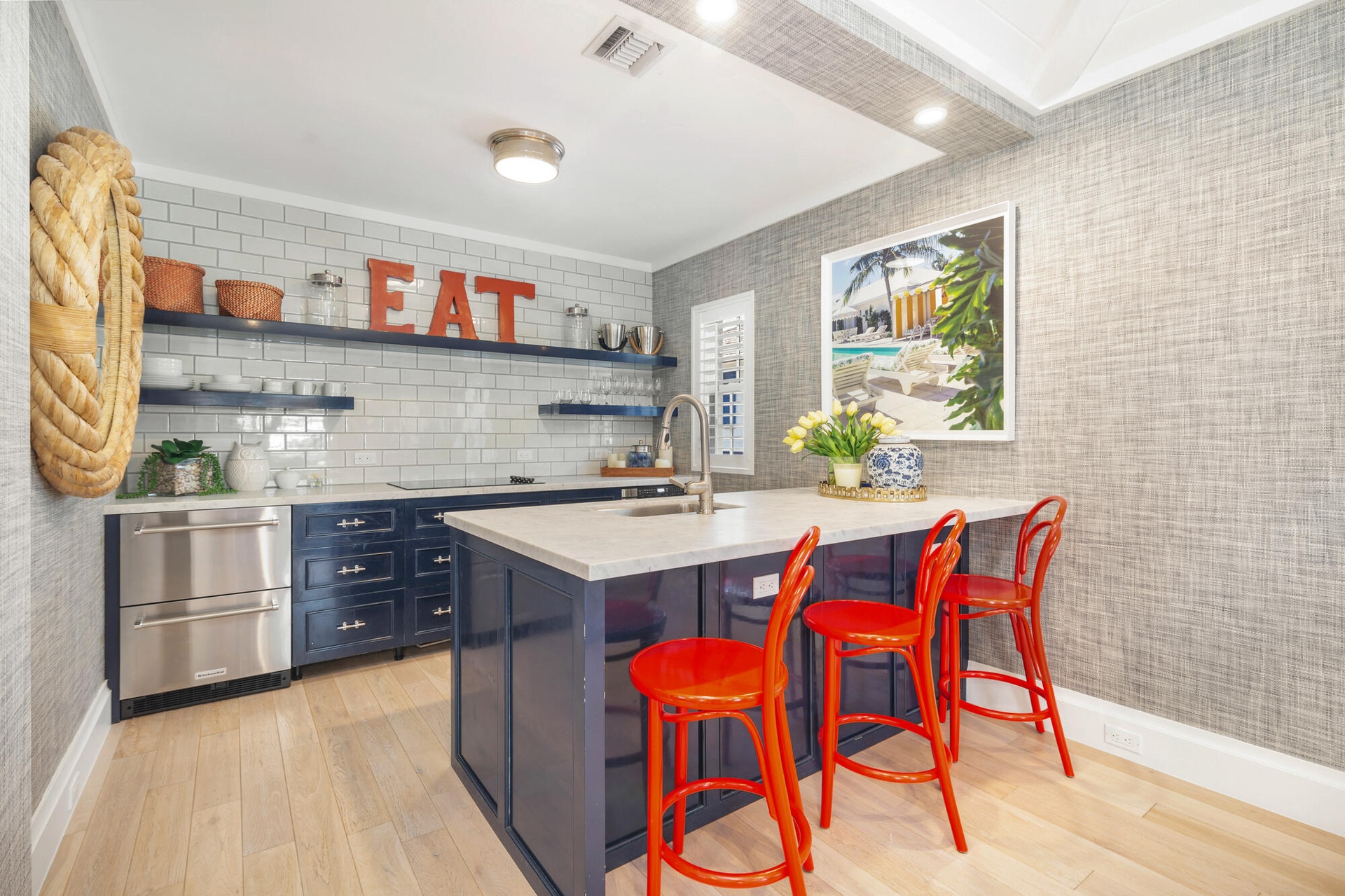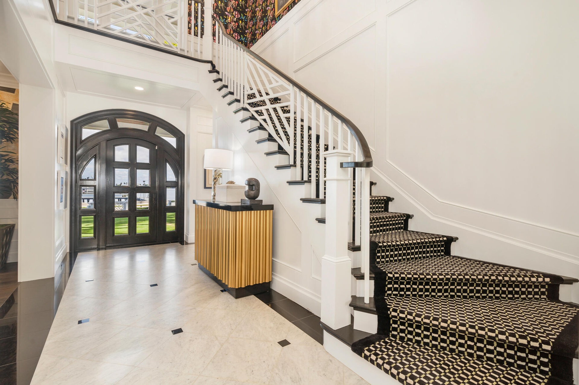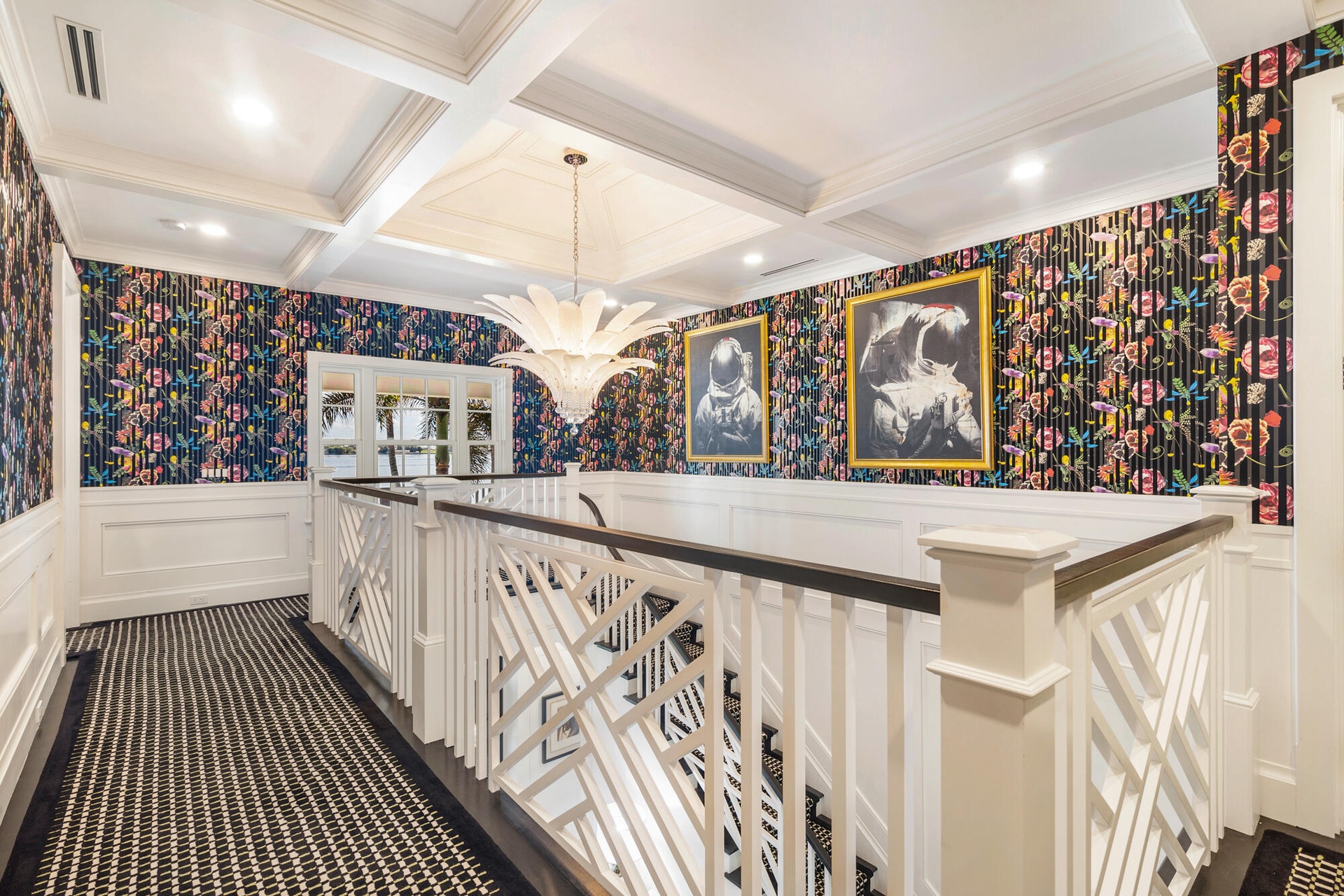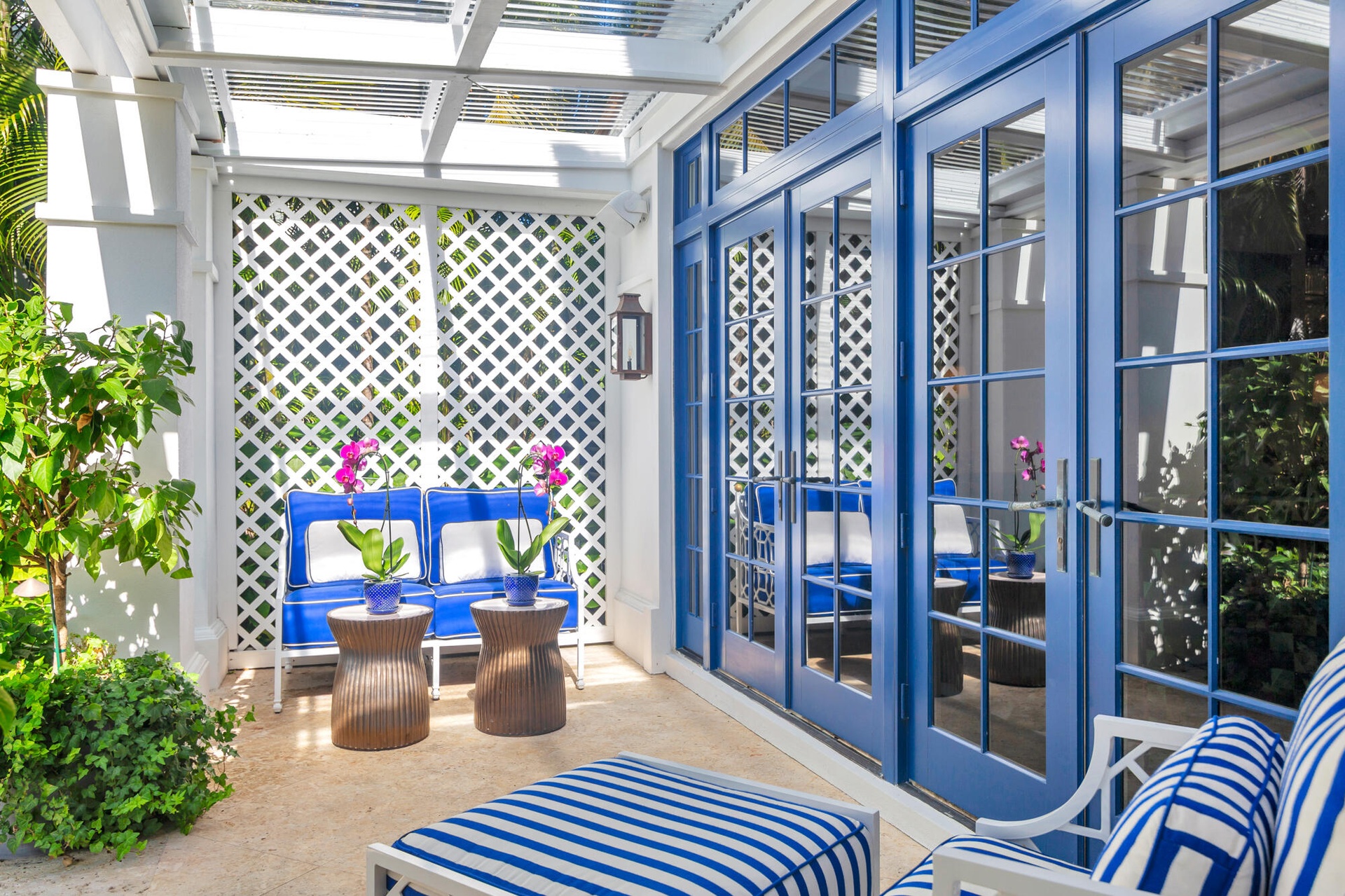 Originally envisioned by Roy & Posey Architects and completed by Island Construction in 2013 and now fully-transformed and elevated by the world-renowned Robert Trown and Associates, the estate spans over 9,000± square feet under roof and is composed of a main residence complemented by a separate guest house. The primary home includes five bedrooms and four and a half baths, with a first-floor bedroom currently enjoyed as an office, and a separate one-bedroom guest house replete with a full kitchen, vaulted ceilings, and private balcony. Oriented to capture wide-water views, the main living areas offer an open family room flowing into an eat-in kitchen, appointed with imported custom Italian cabinetry and a dramatic rare imported blue Sodalite island. The formal dining room frames the Intracoastal, while expansive glass doors open to covered loggias to create an effortless indoor-outdoor rhythm.