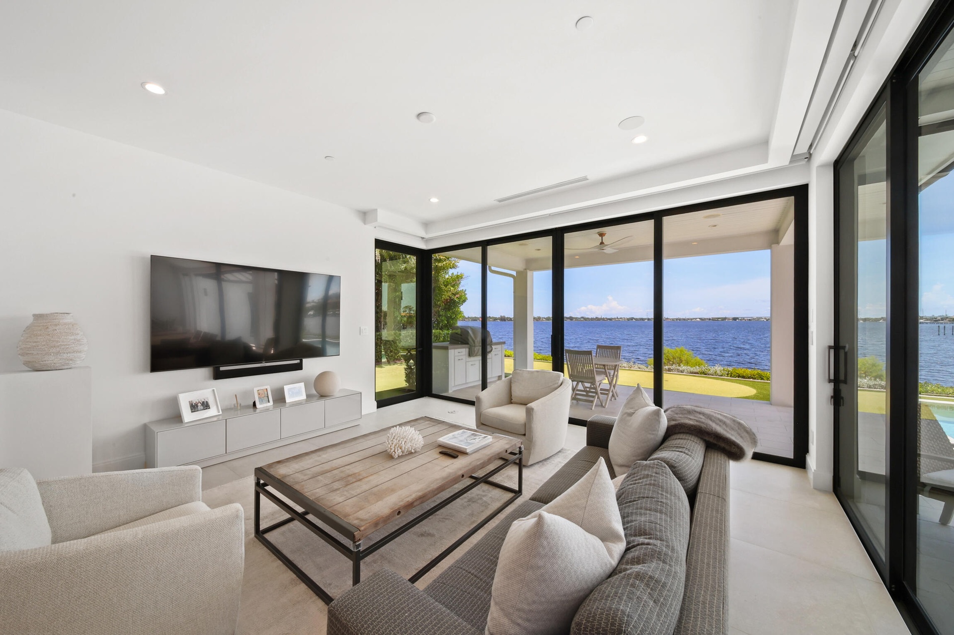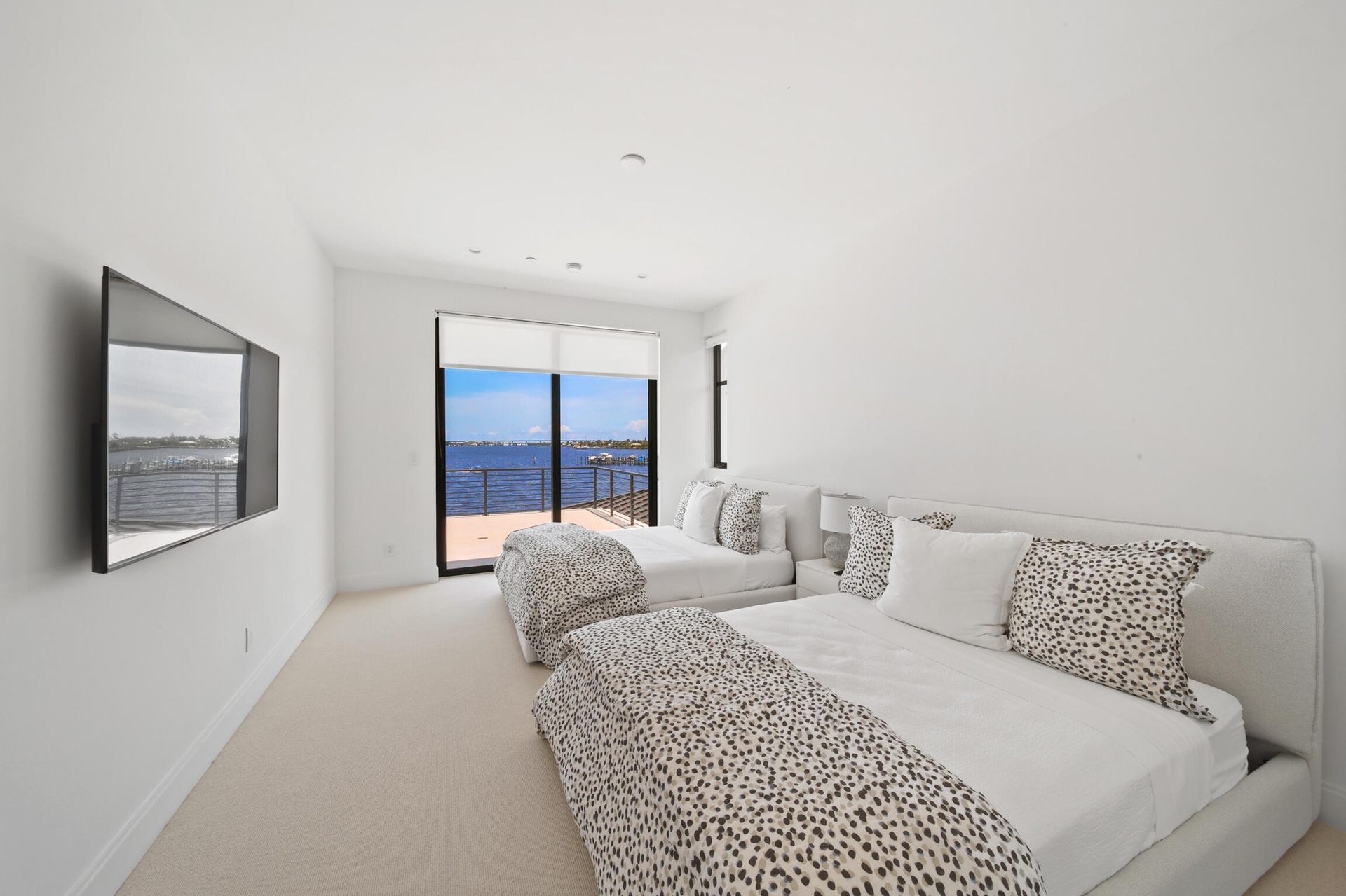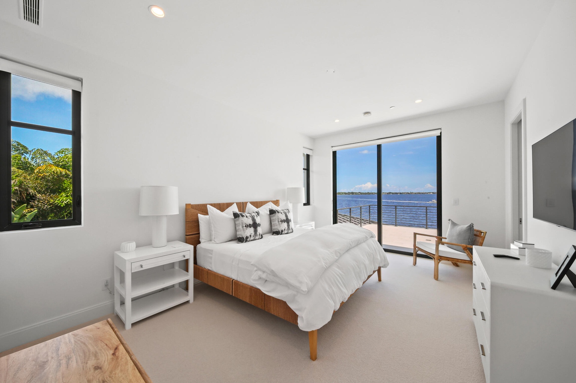 Upstairs, the residence offers two spacious suites and a loft retreat with bar area. Both suites open to a stunning balcony overlooking the water, providing private outdoor sanctuaries with breathtaking views.