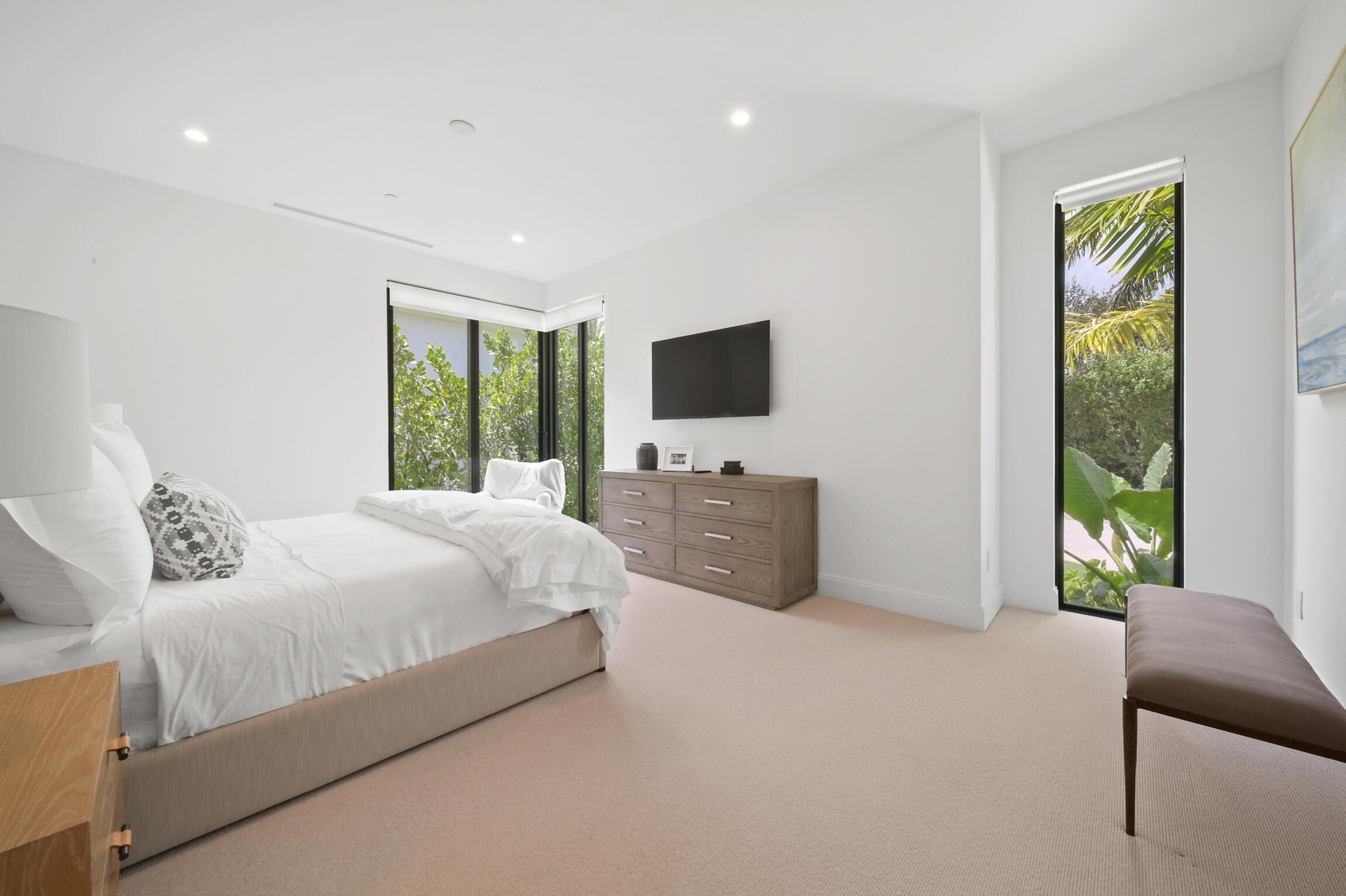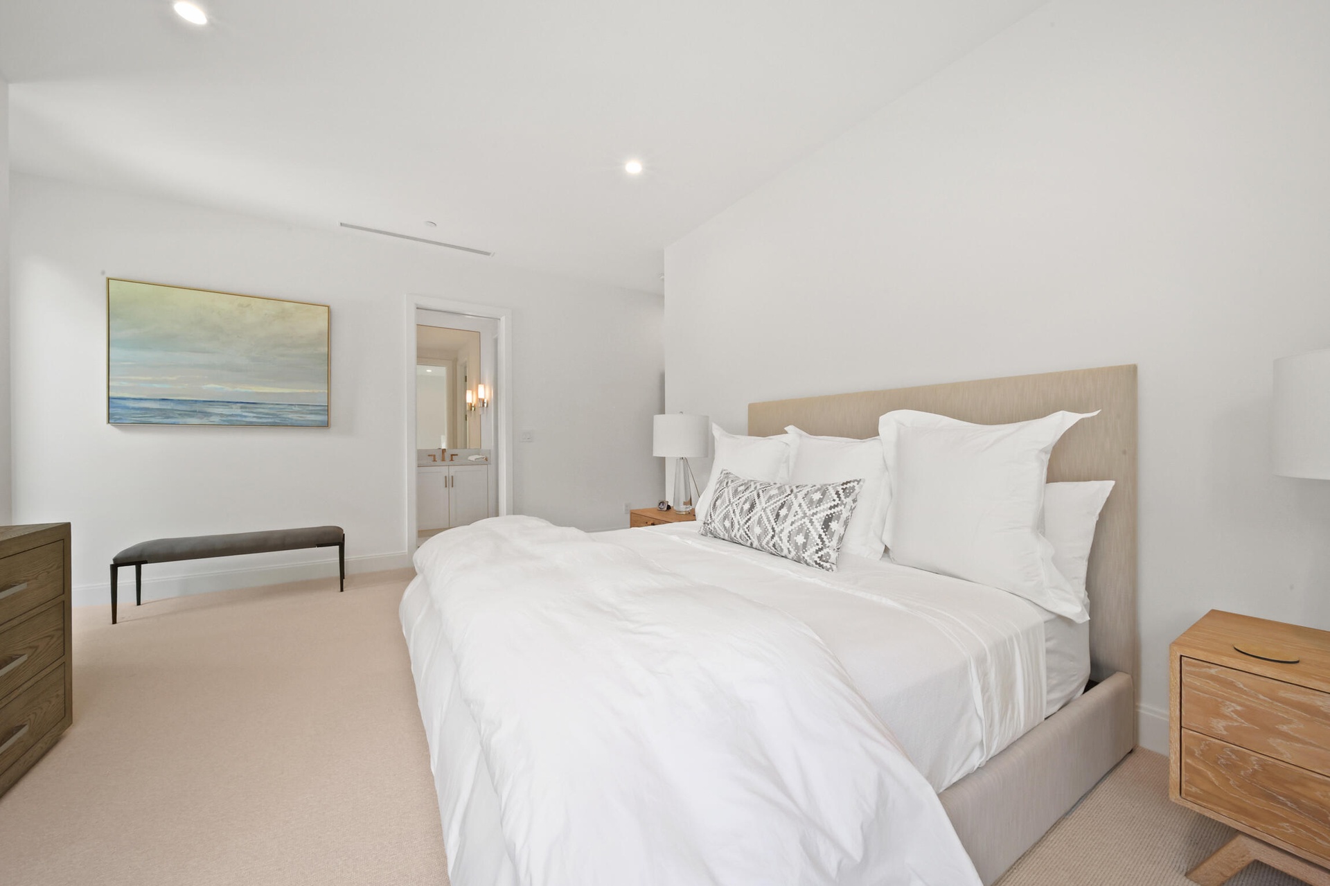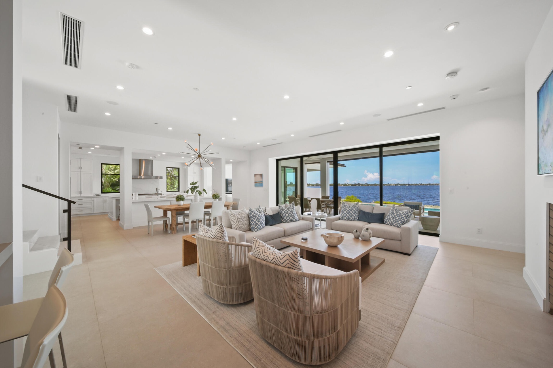 Upstairs, the residence offers two spacious suites and a loft retreat with bar area. Both suites open to a stunning balcony overlooking the water, providing private outdoor sanctuaries with breathtaking views.