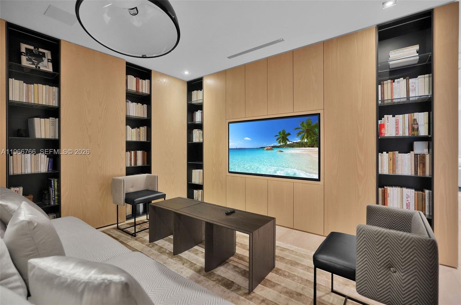 A private elevator opens to a secure foyer clad in Terra Bianca quartzite with a glass atrium feature. A book-matched Terra Bianca quartzite feature wall with antique brass inlays highlights the central core of the 6-bedroom home.