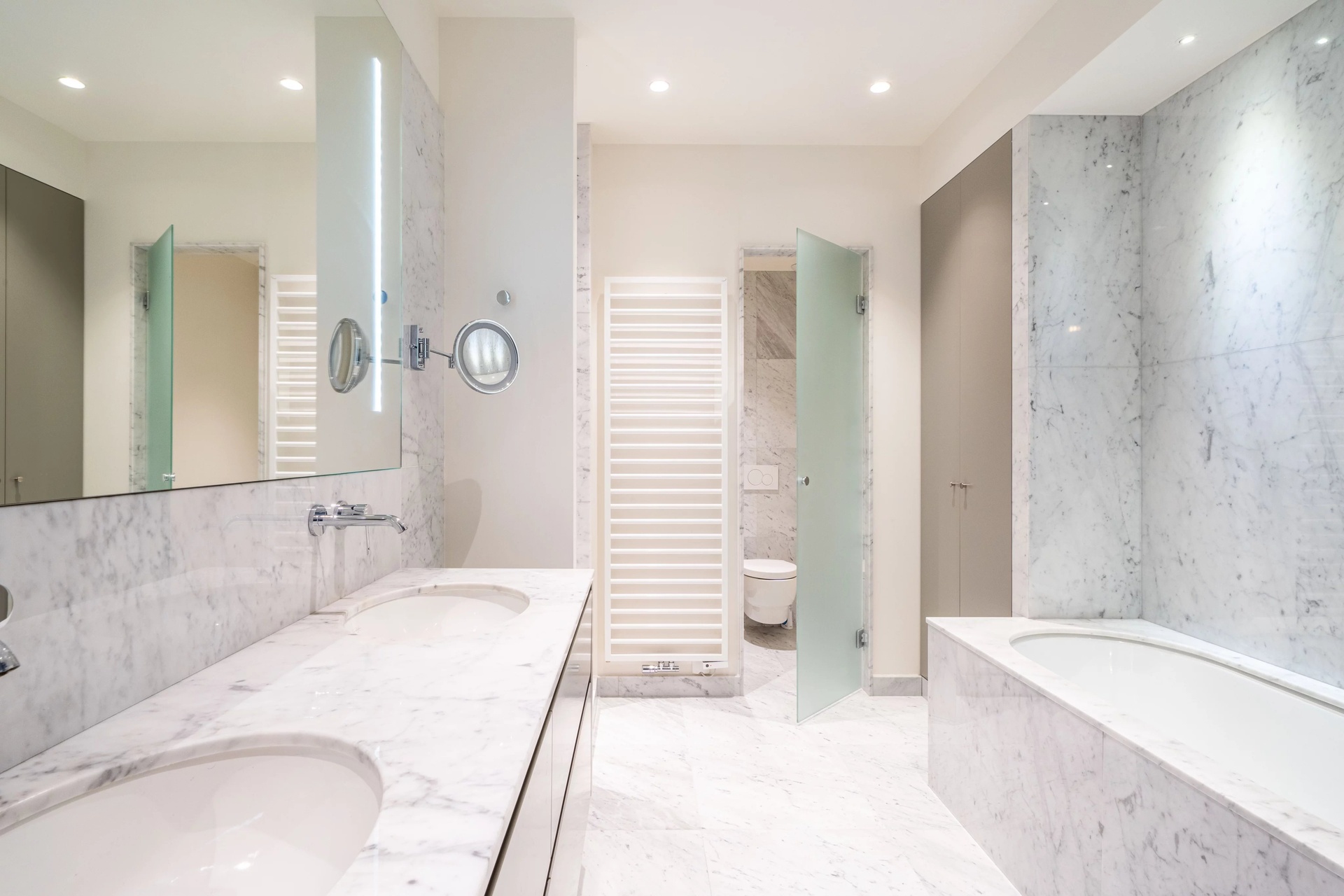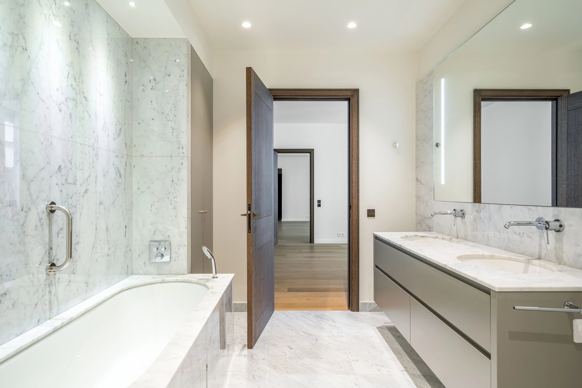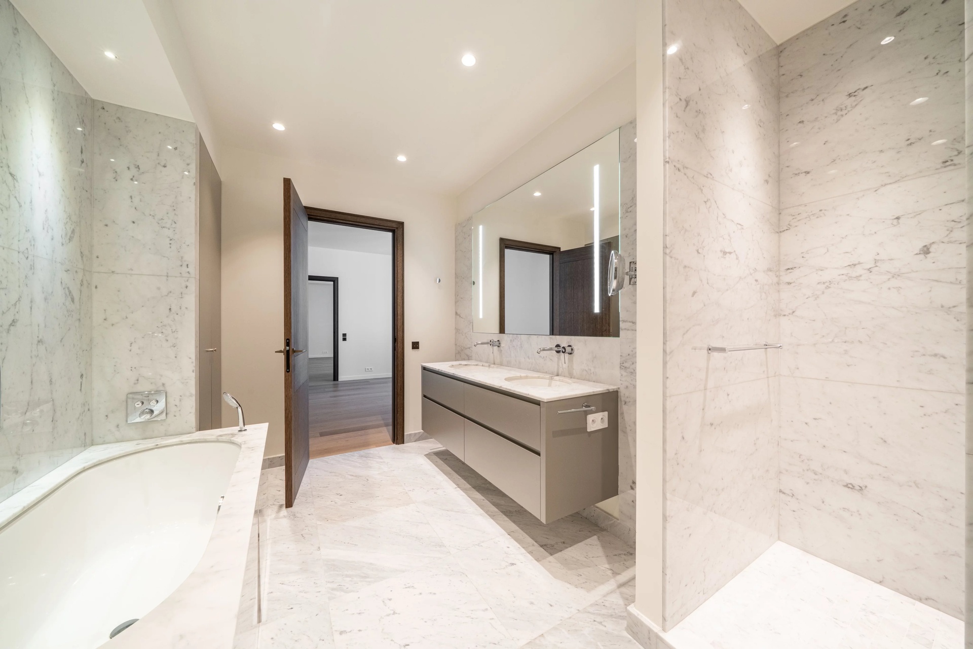 The luxuriously finished marble bathroom features a walk-in shower, a bathtub, a double washbasin and a perfectly integrated dressing/laundry area.